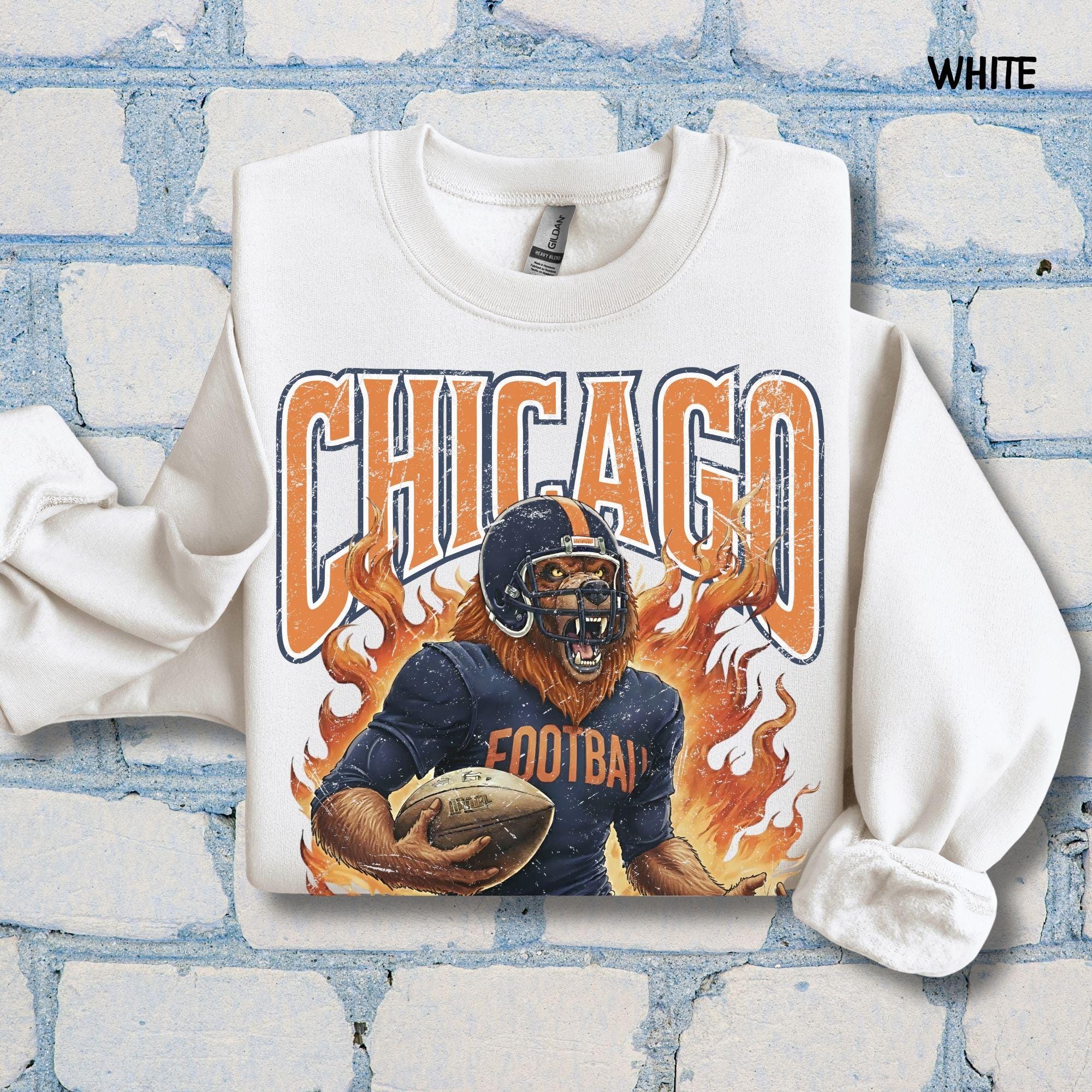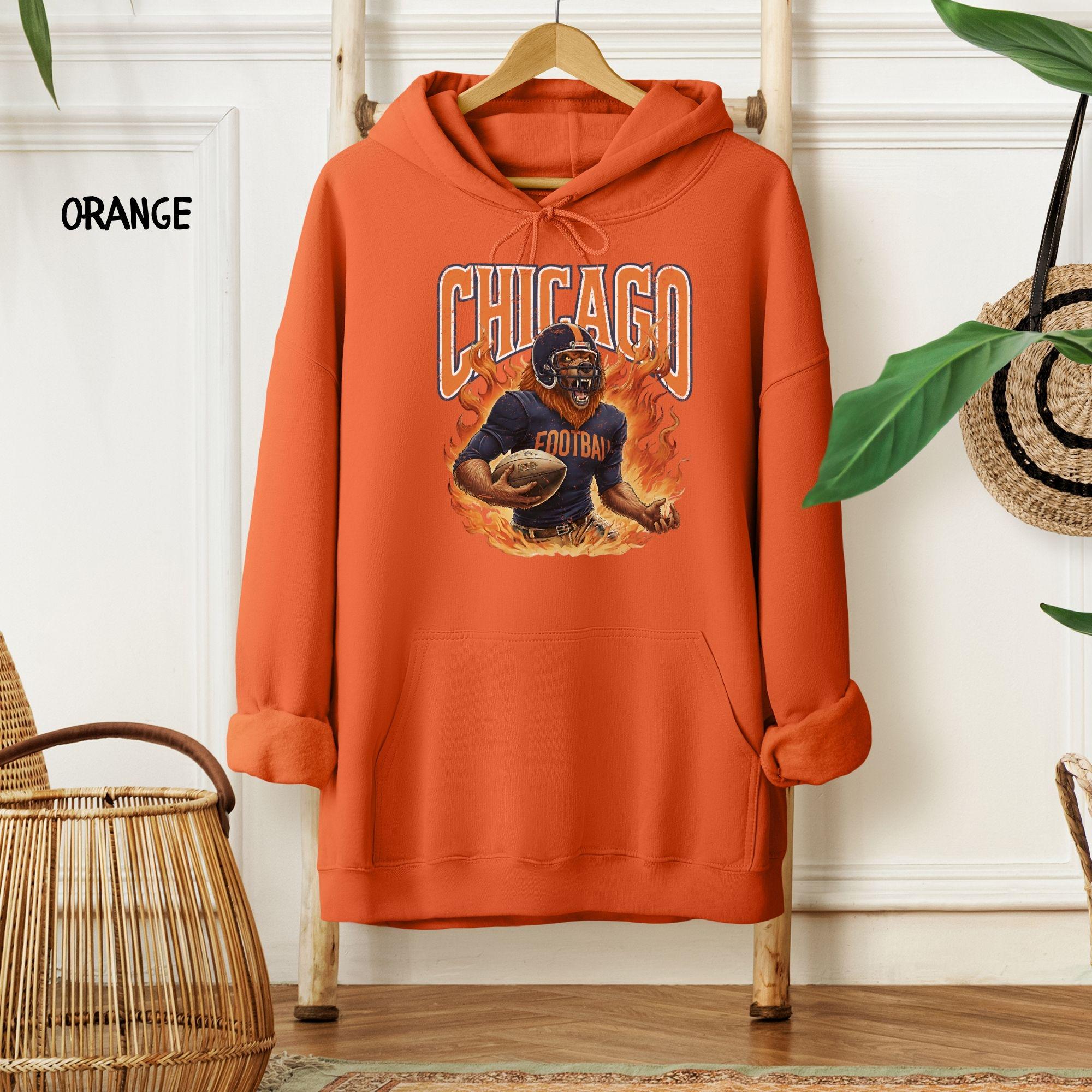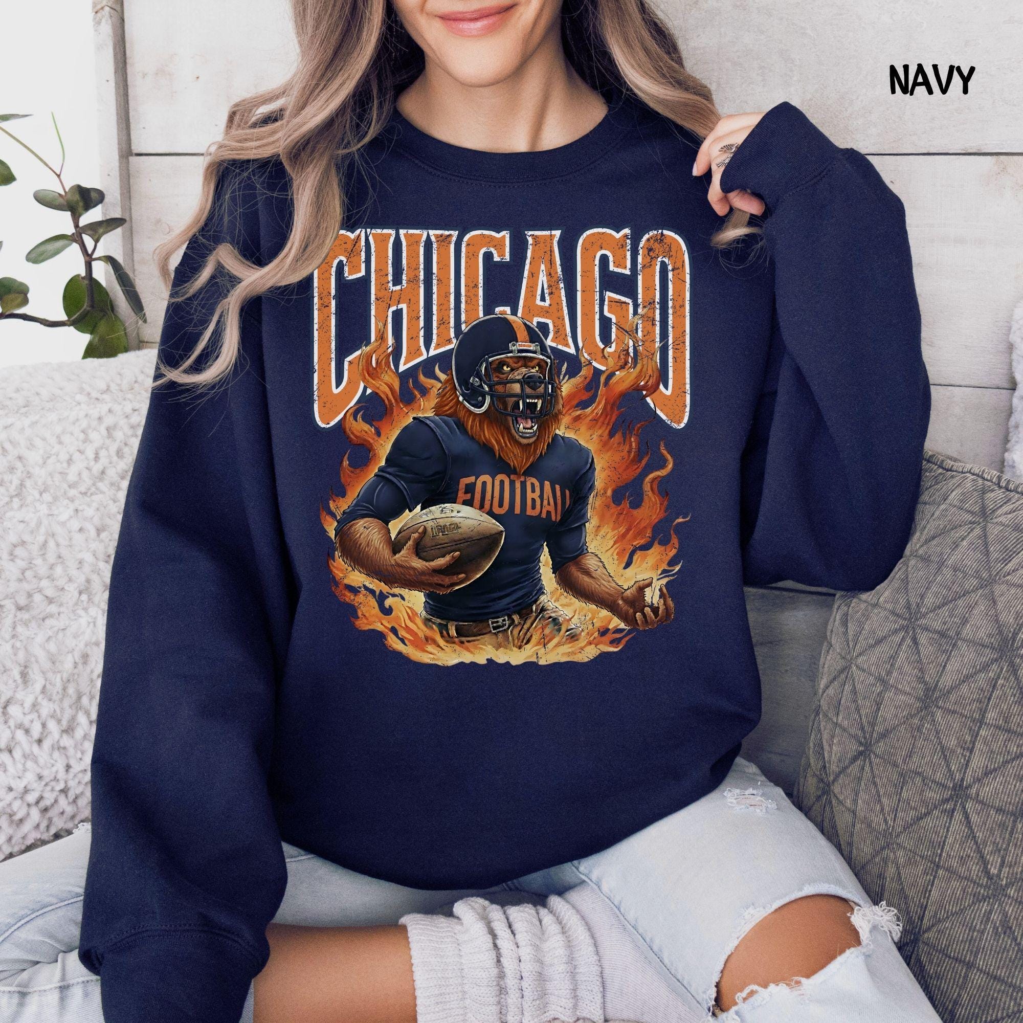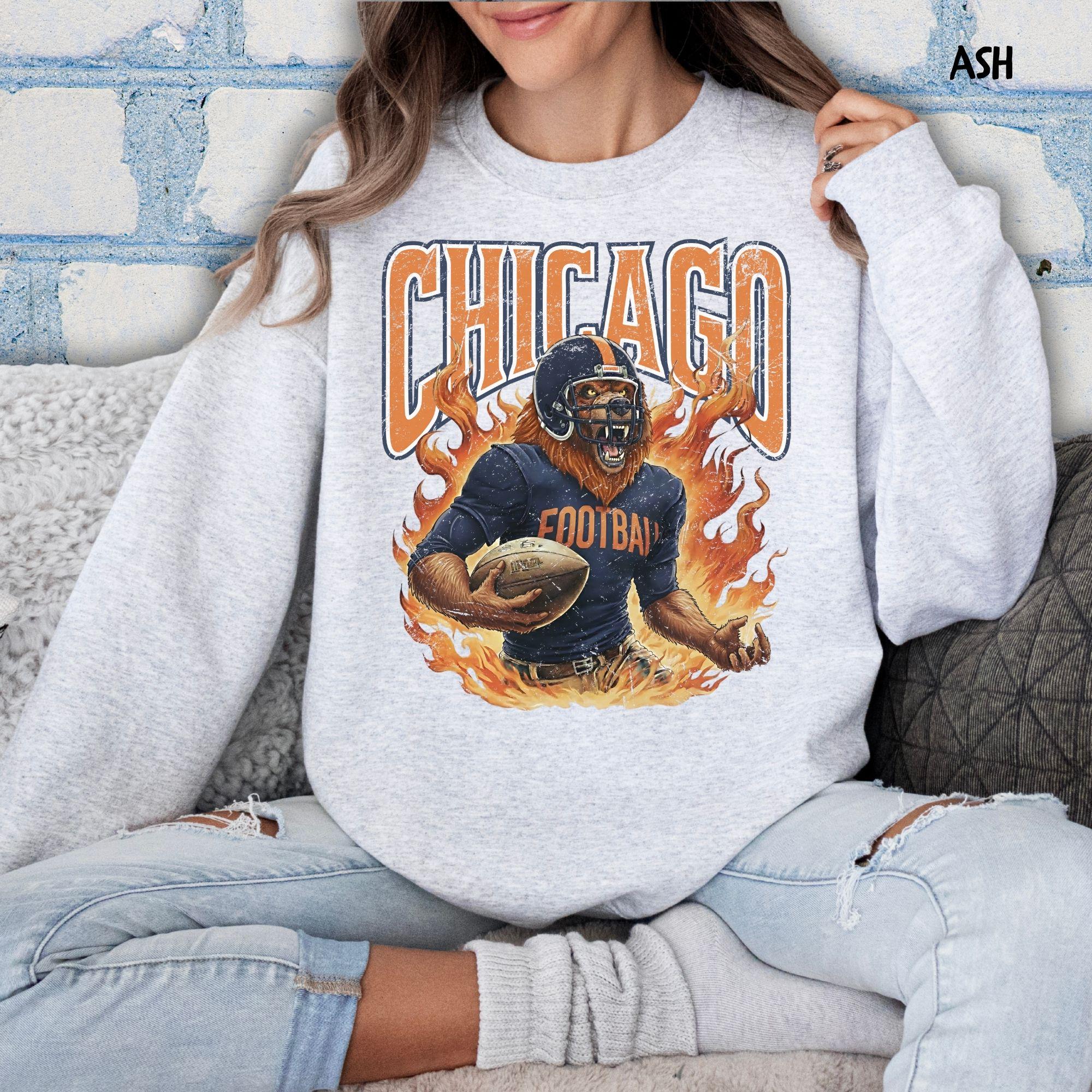 Step up your game-day style with this edgy Chicago Football graphic. Featuring a vintage distressed print of a flaming monster mascot, this design is the perfect non-official apparel for dedicated fans. Unlike mass-produced team gear, this unique hoodie and sweatshirt design offers a retro, alternative look that still captures the intense spirit of Chicago football. It's built for ultimate comfort and lasting quality, ideal for weekend wear, tailgating, or everyday casual style. Available as a shirt, t-shirt, or cozy layer.