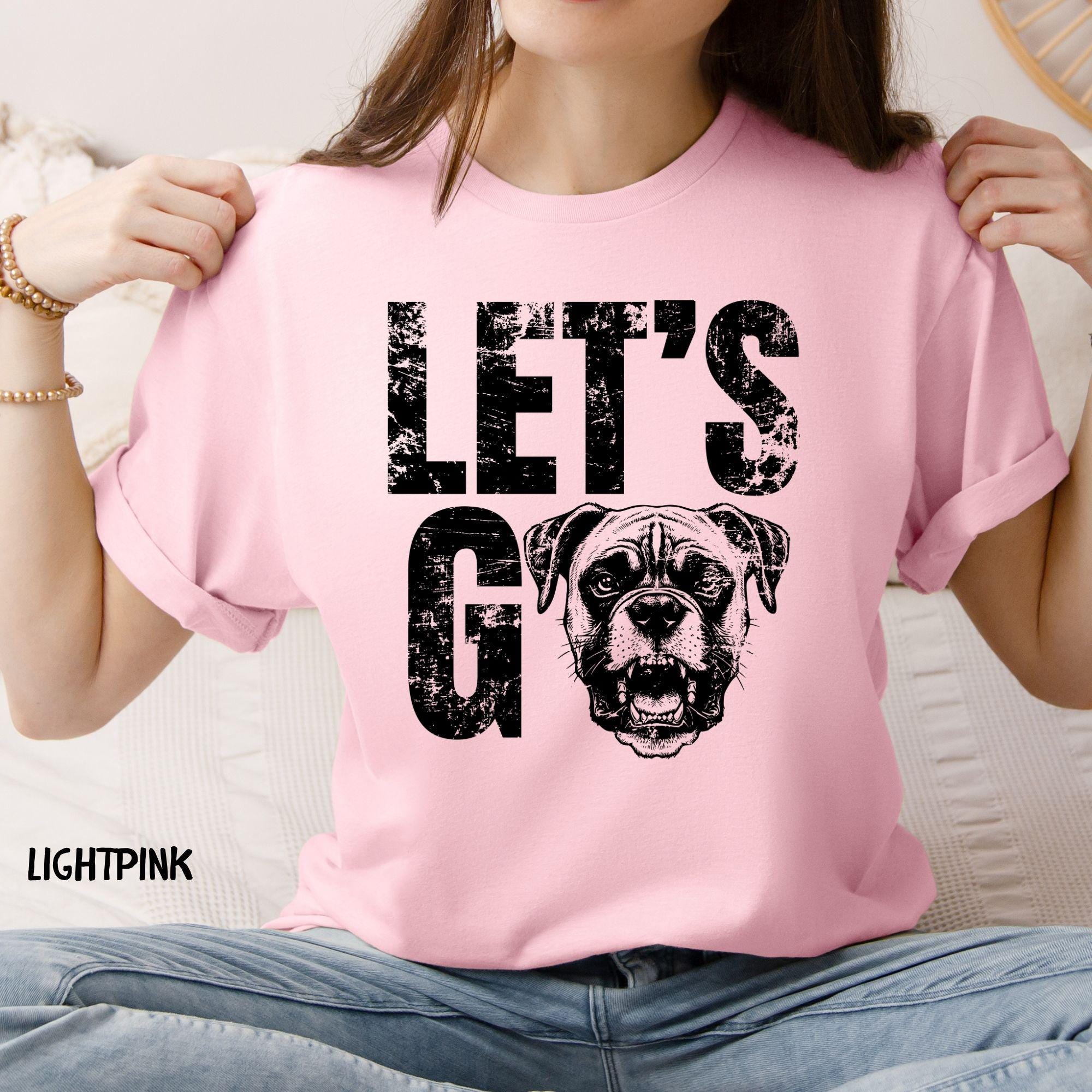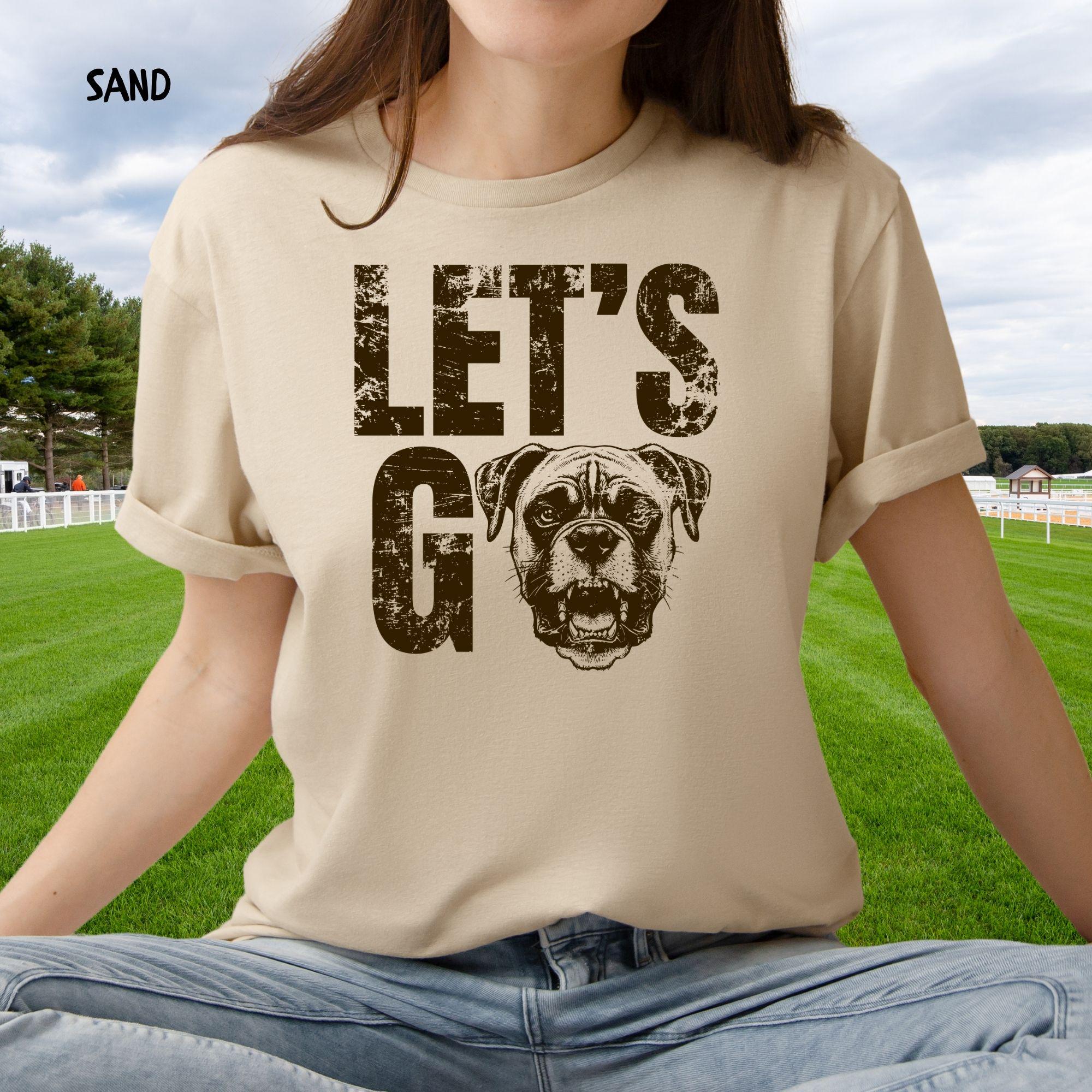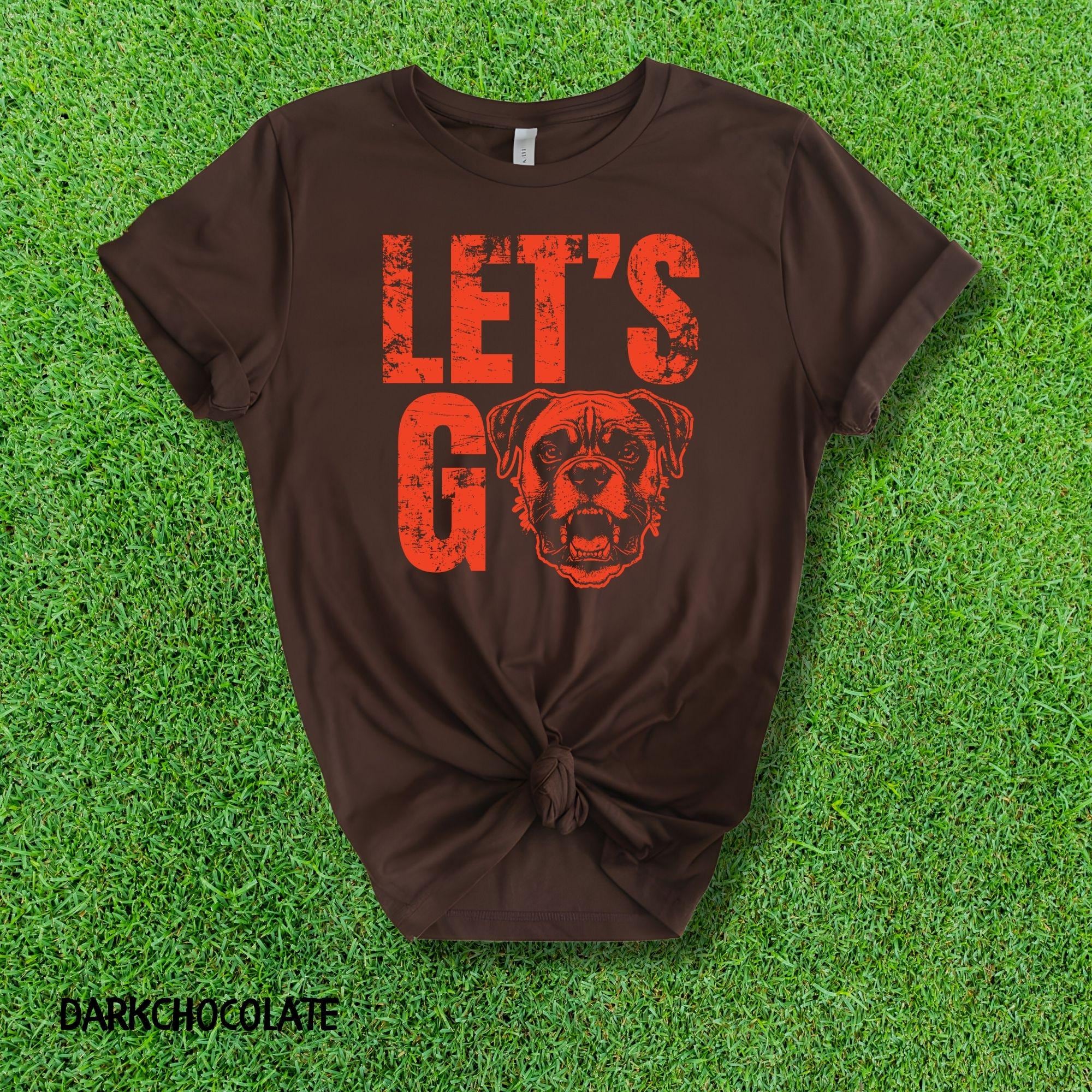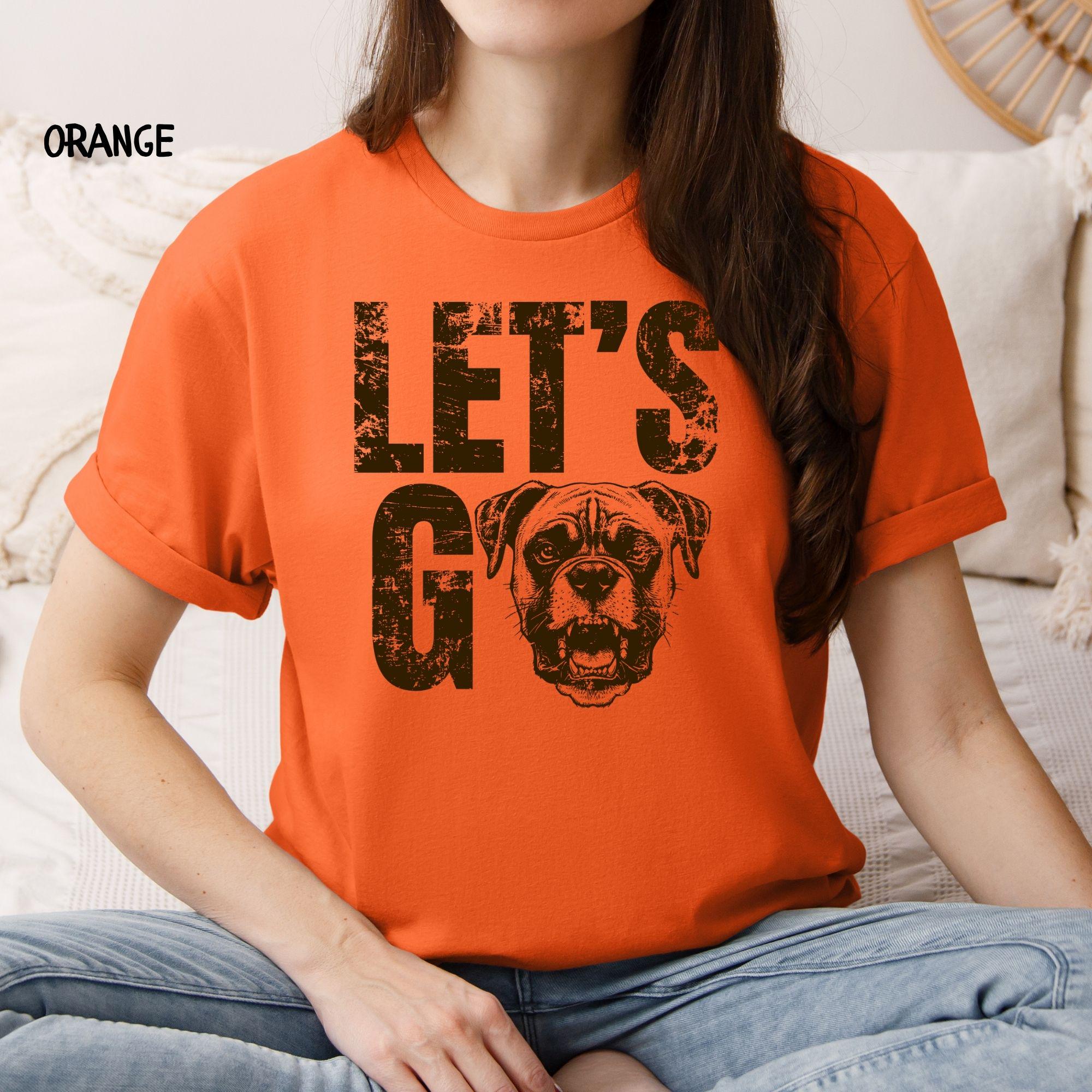Find the perfect custom t-shirt featuring a bold "Let's Go" graphic with an integrated dog mascot. This shirt is easily customizable in Brown and Orange print, ideal for any fan or dog owner's casual apparel collection.