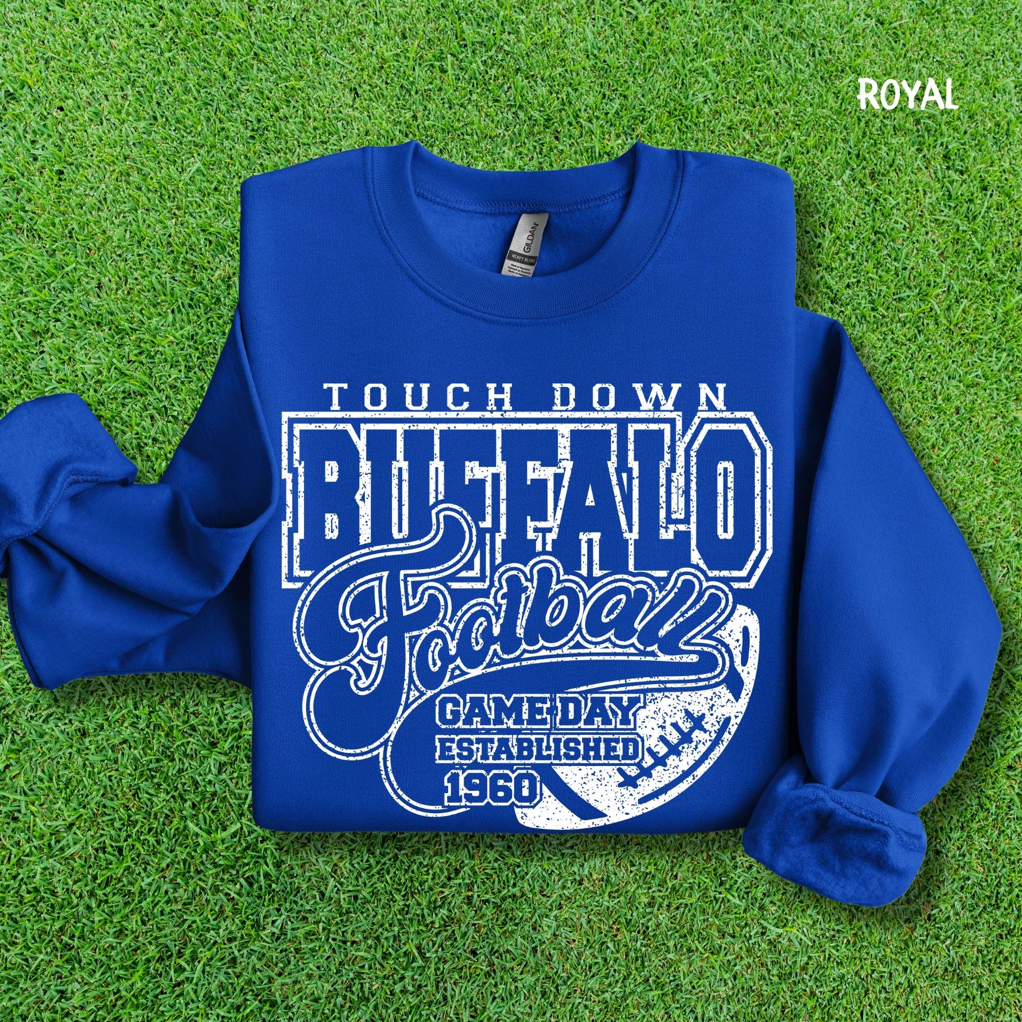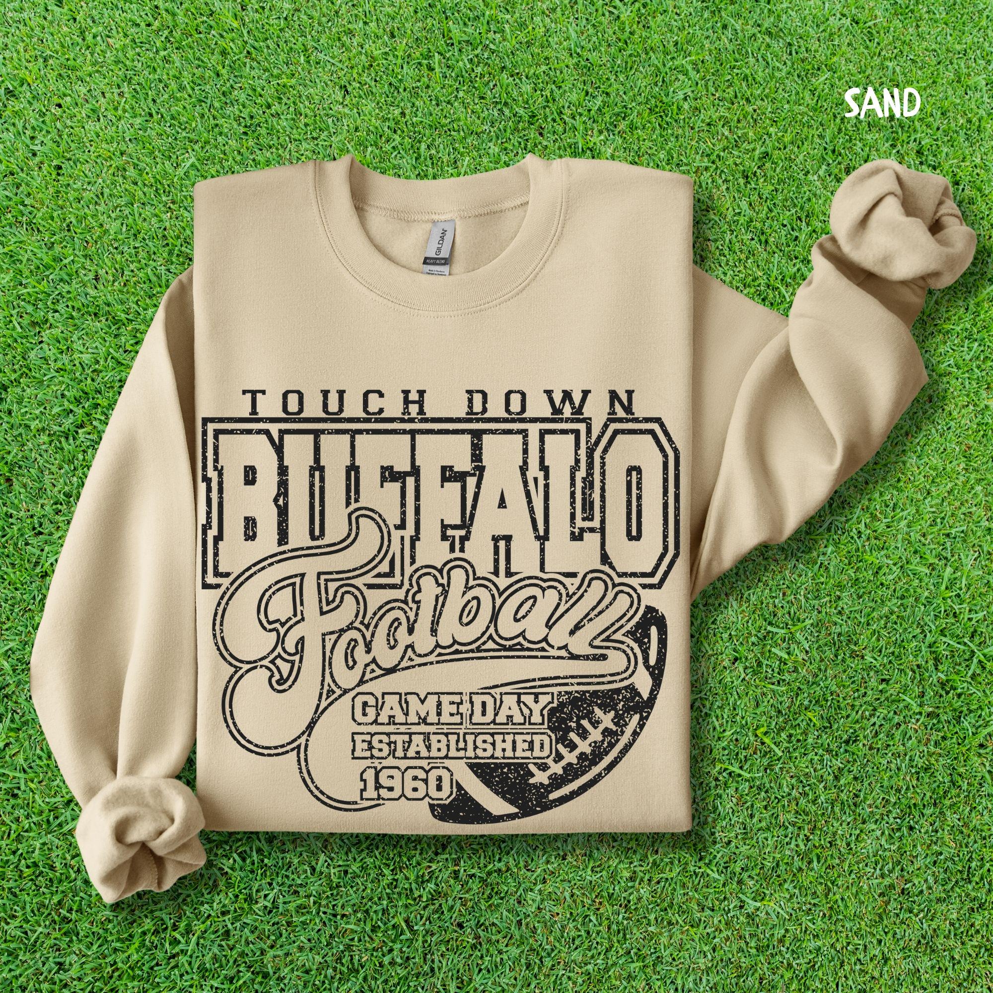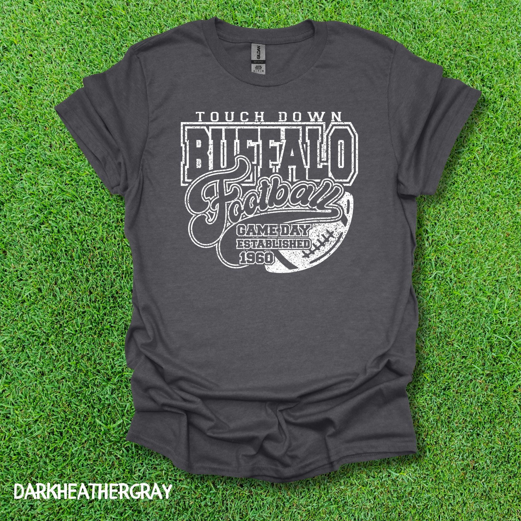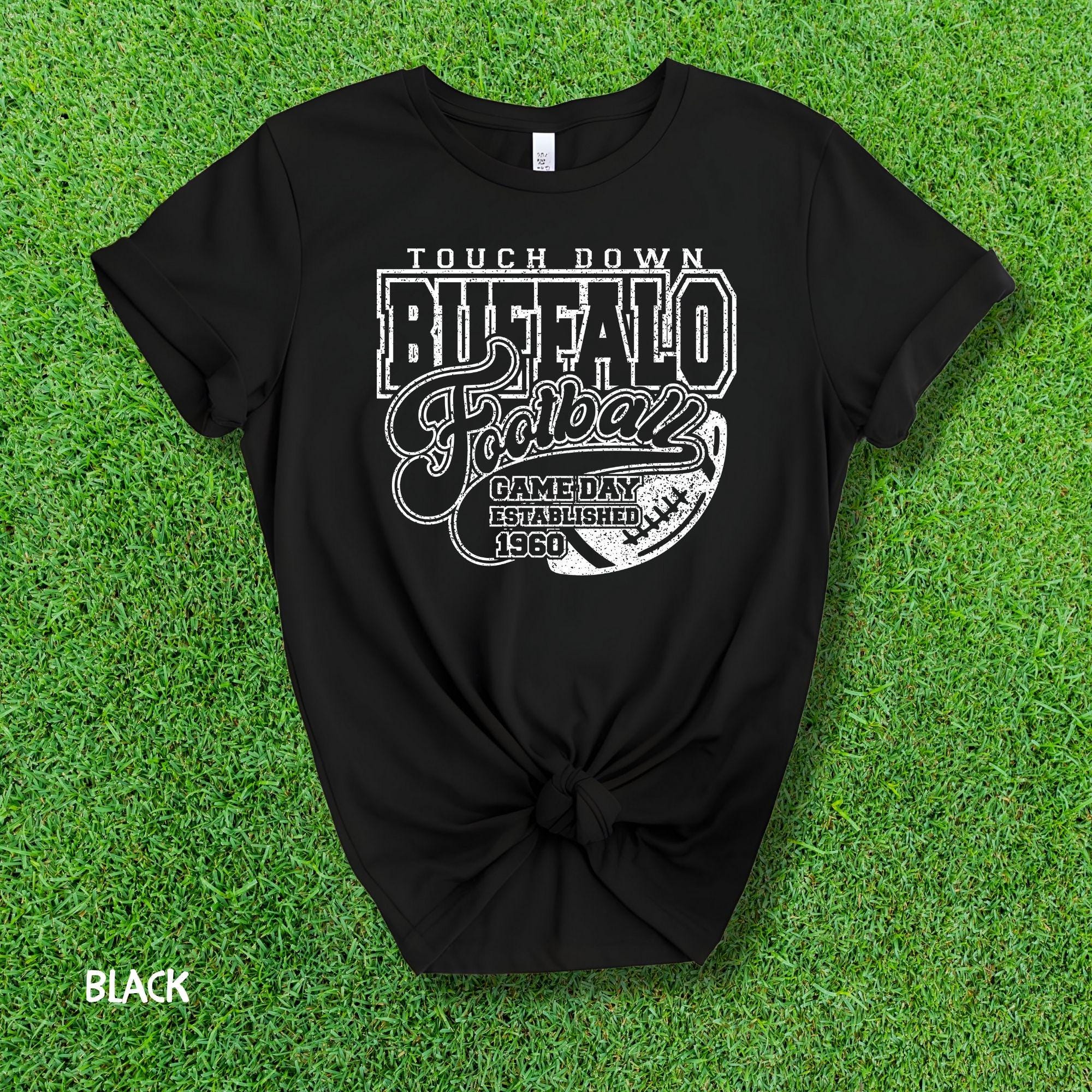 Show your Buffalo pride with this classic, vintage-style football design. Featuring a bold 'Touch Down' and 'Established 1960' graphic, this piece captures the spirit of gameday with a perfect retro vibe.