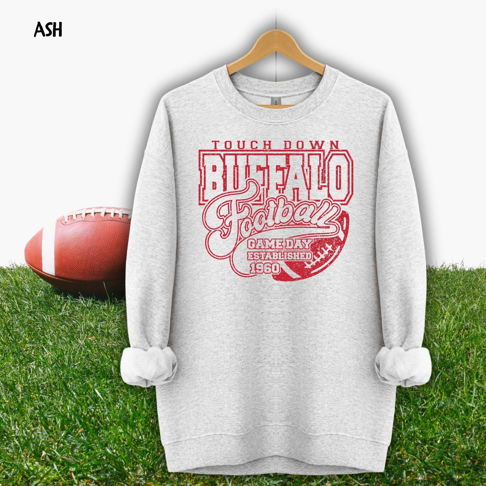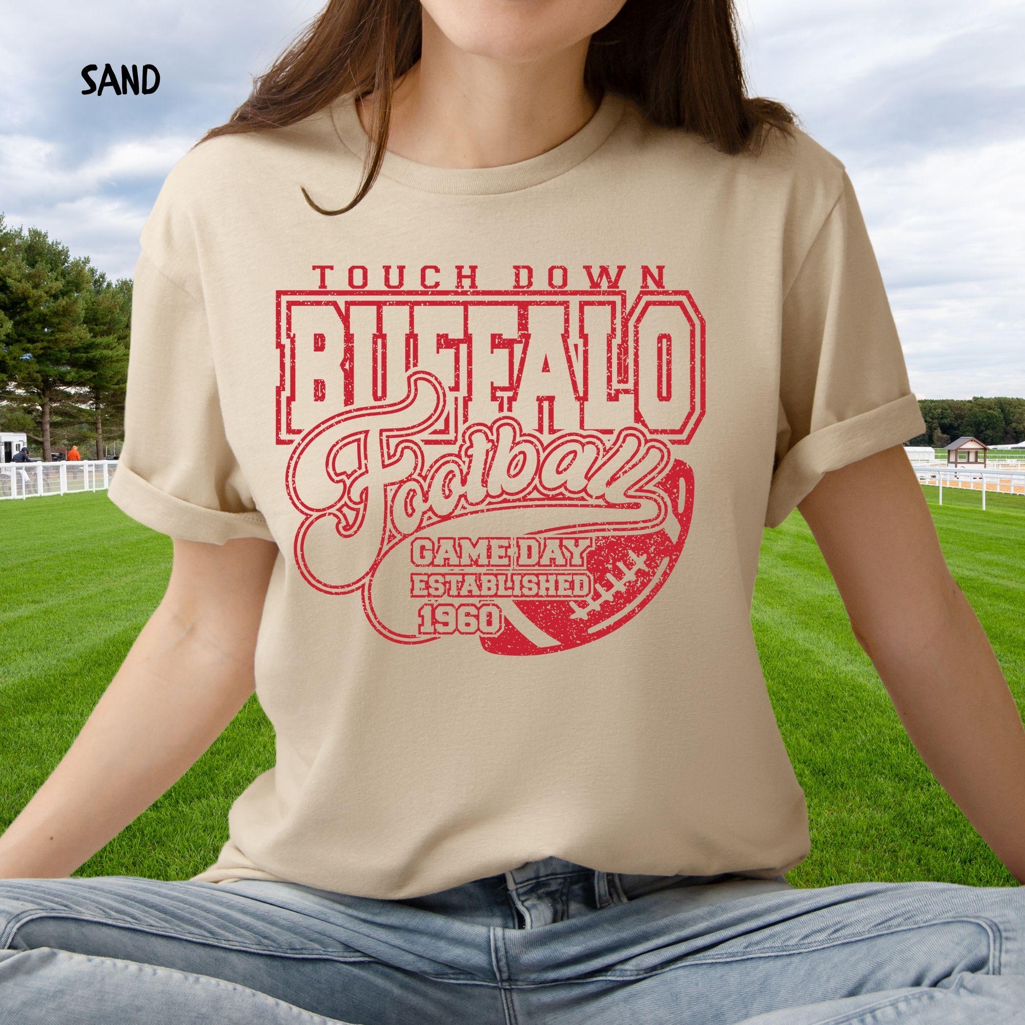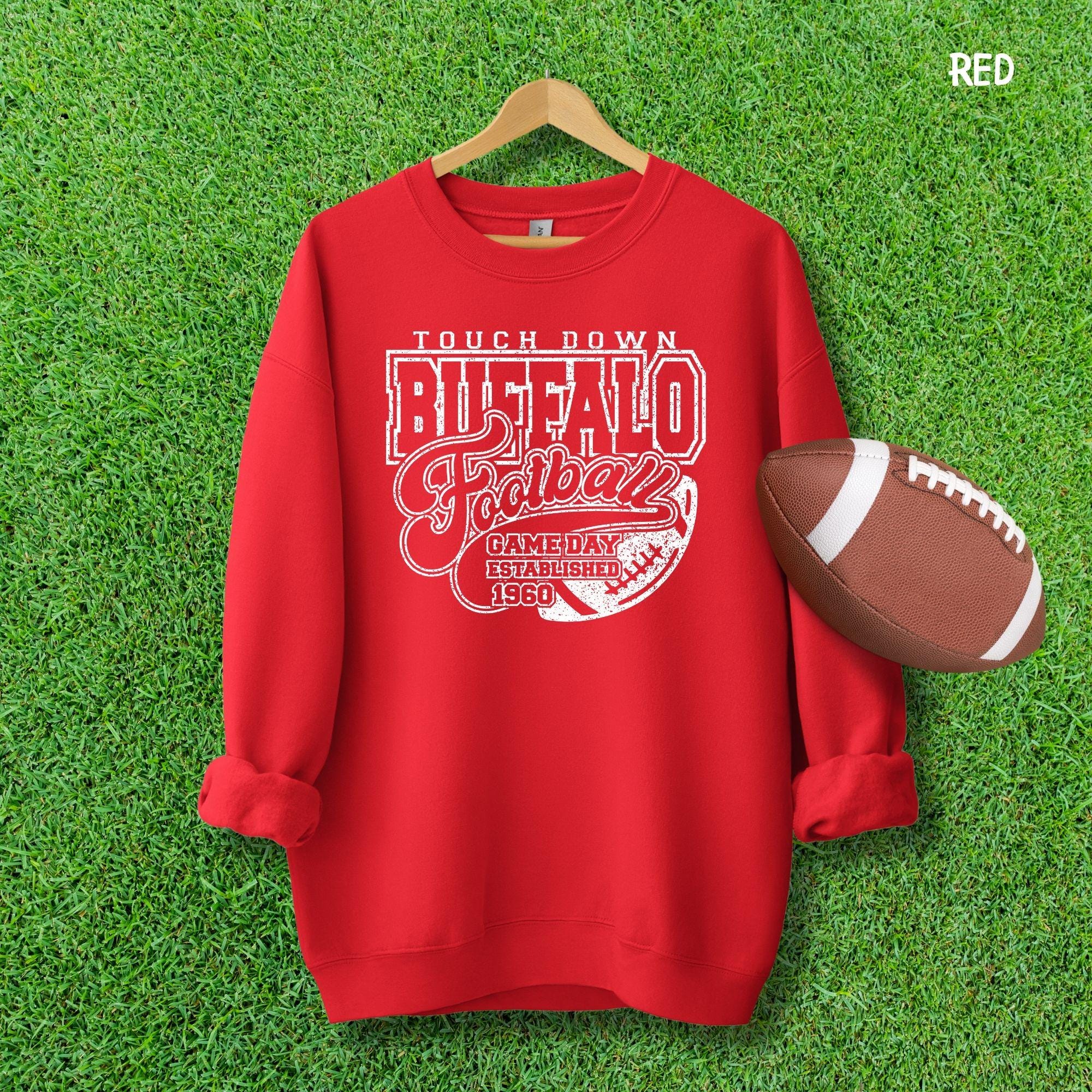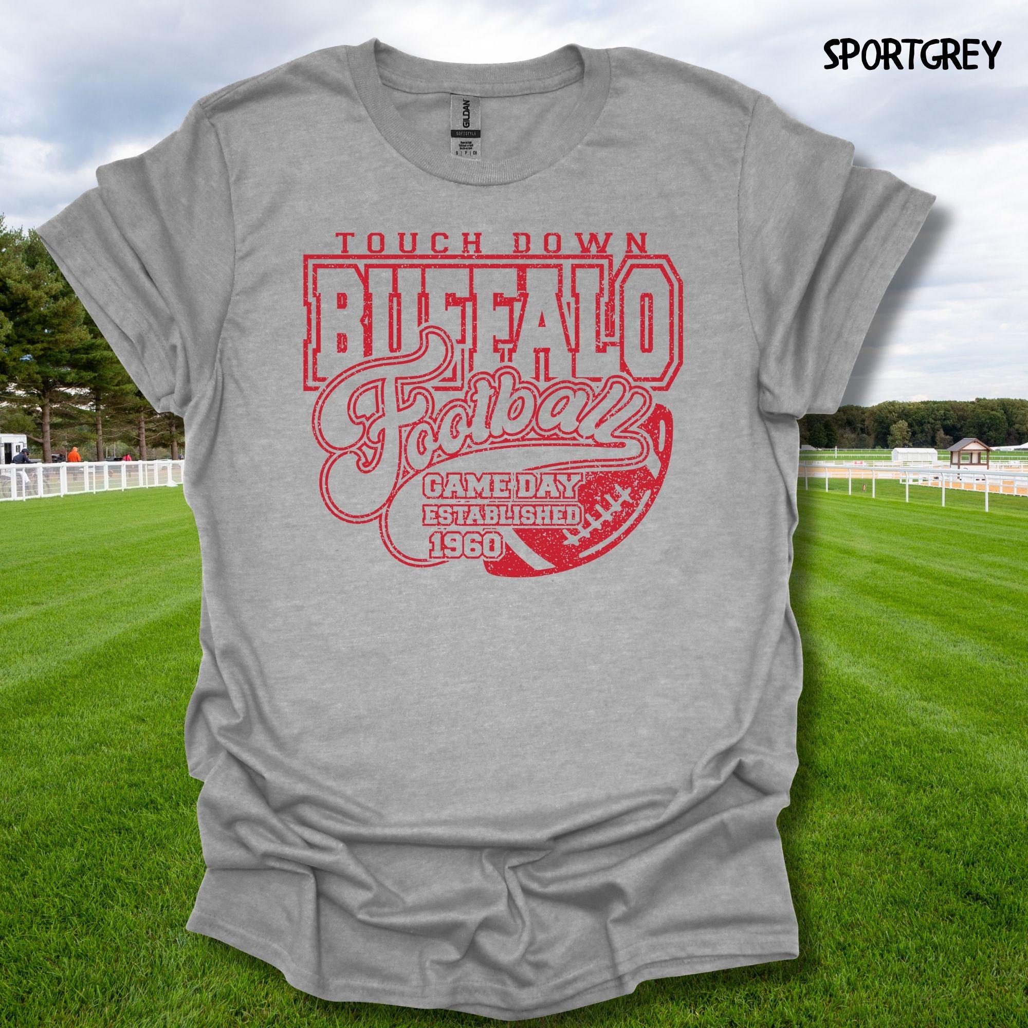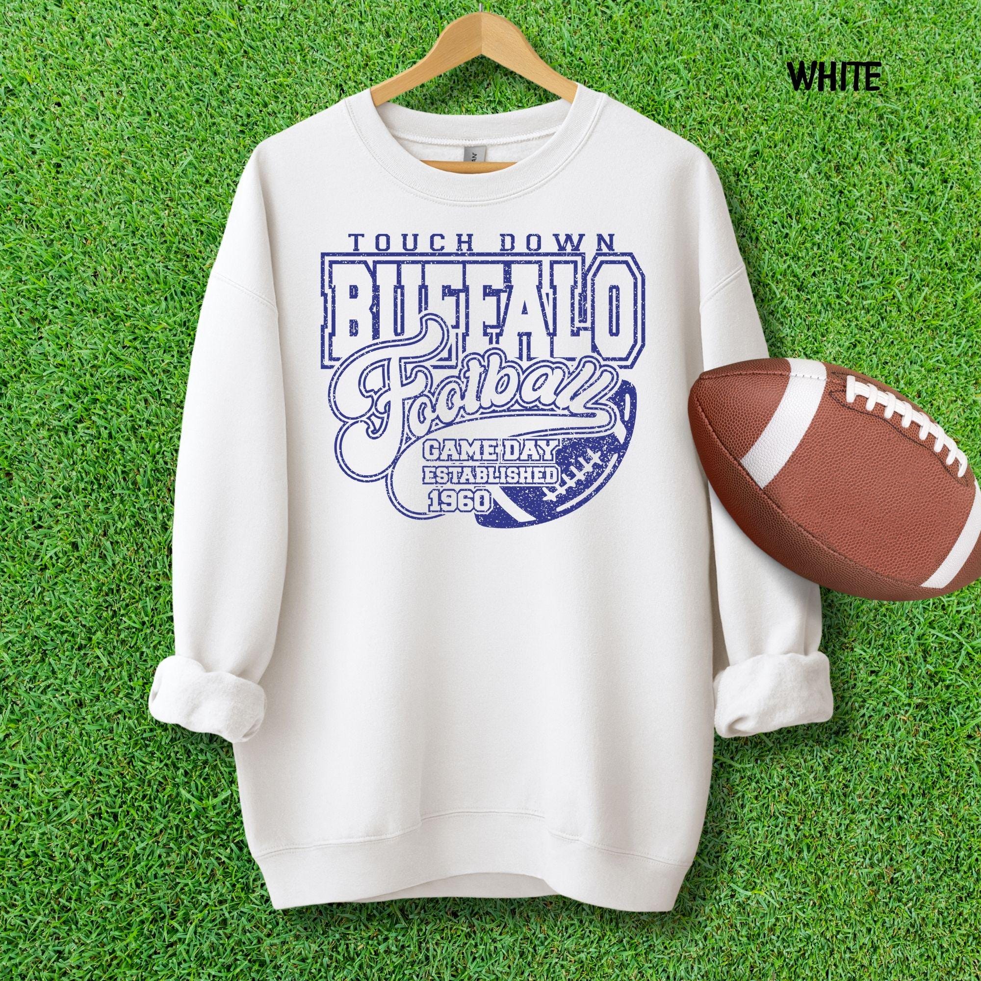 Show your Buffalo pride with this classic, vintage-style football design. Featuring a bold 'Touch Down' and 'Established 1960' graphic, this piece captures the spirit of gameday with a perfect retro vibe.