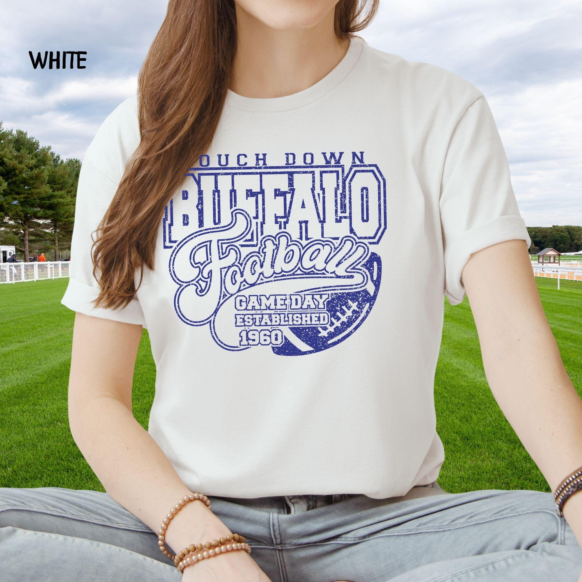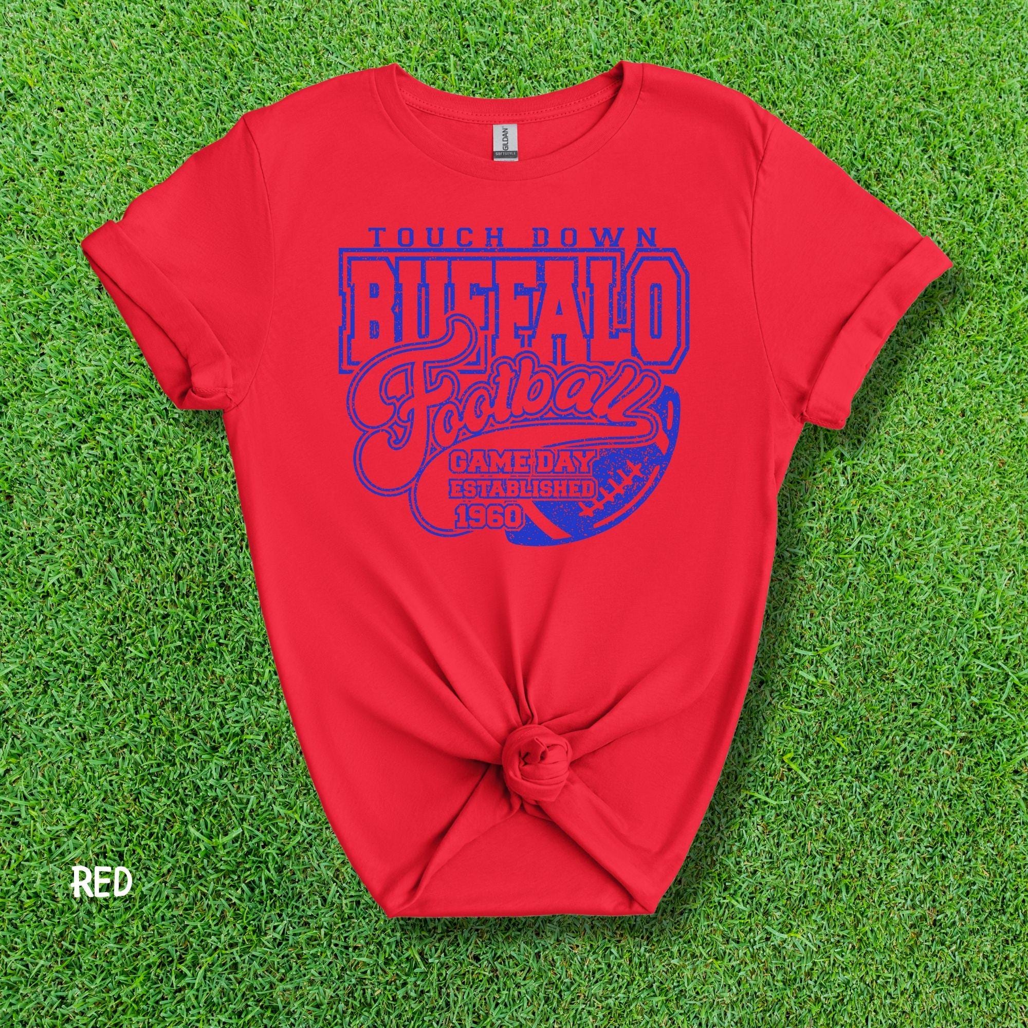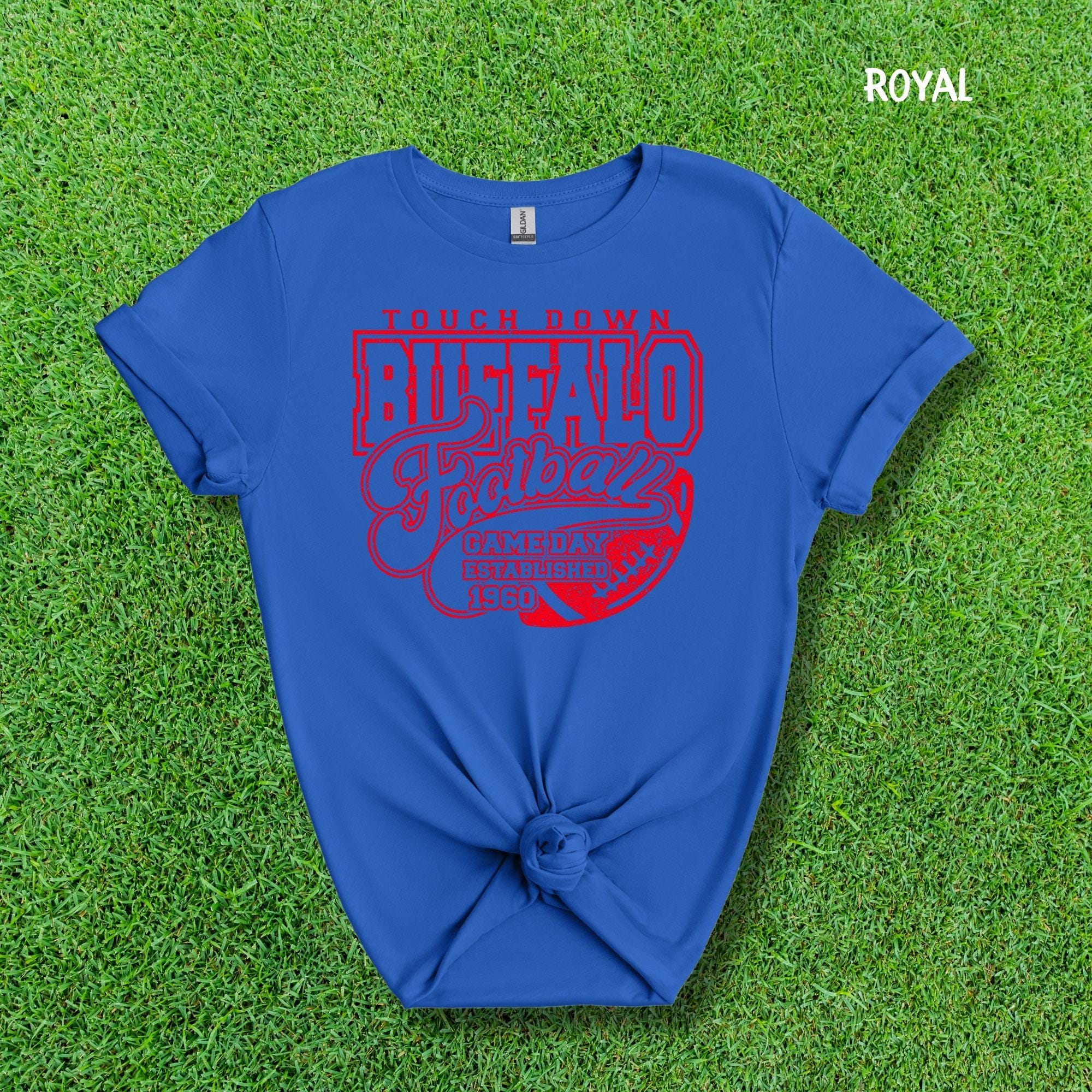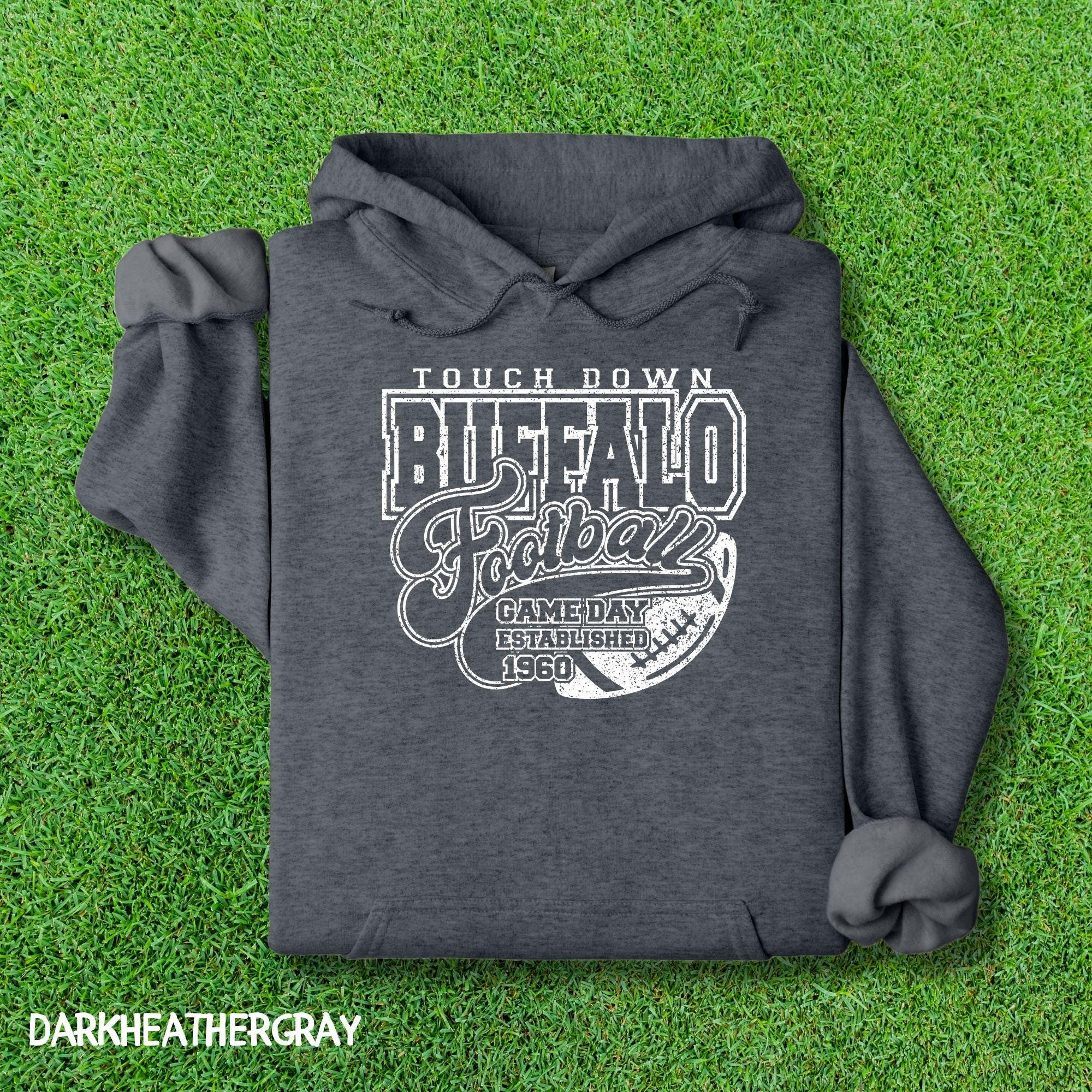 Show your Buffalo pride with this classic, vintage-style football design. Featuring a bold 'Touch Down' and 'Established 1960' graphic, this piece captures the spirit of gameday with a perfect retro vibe.
