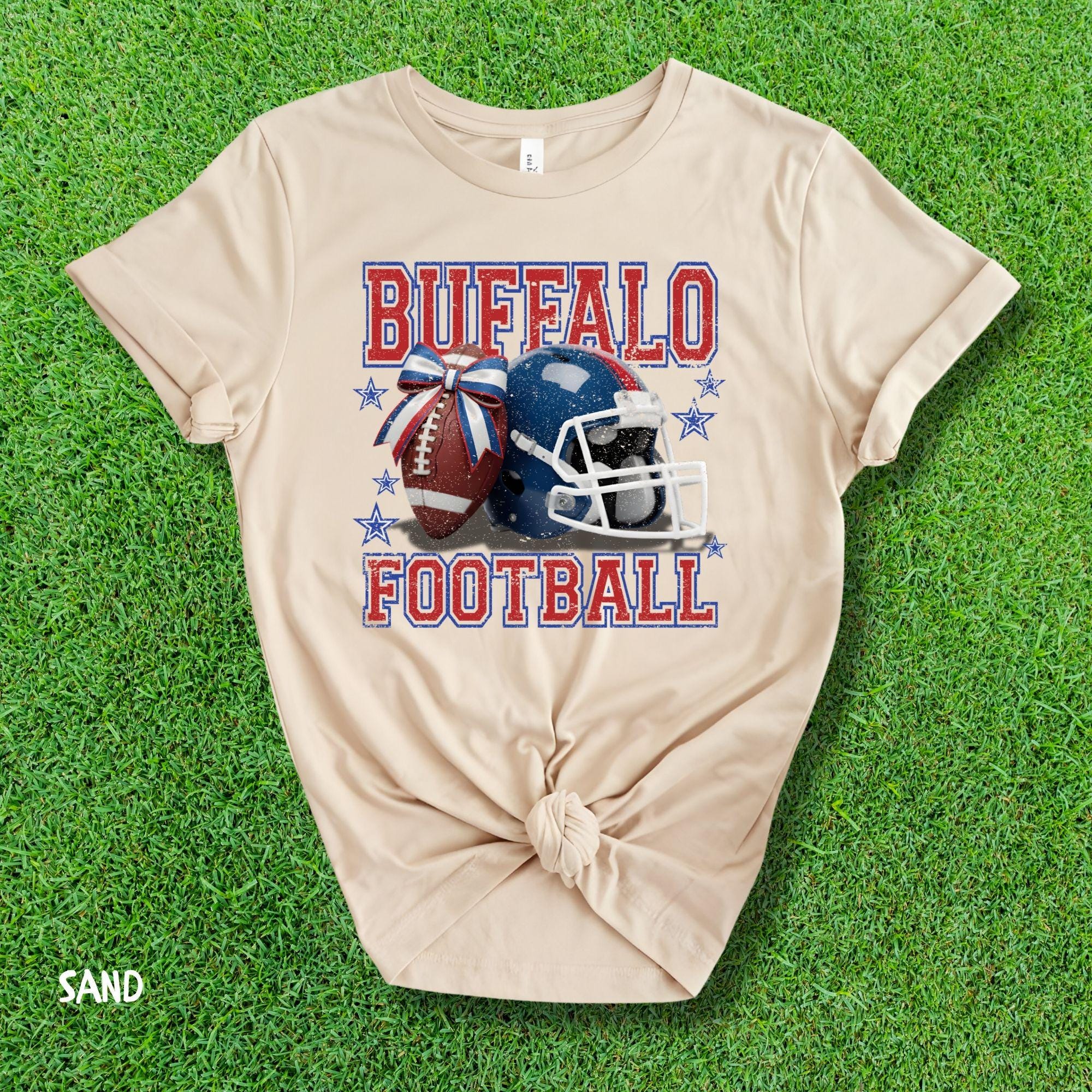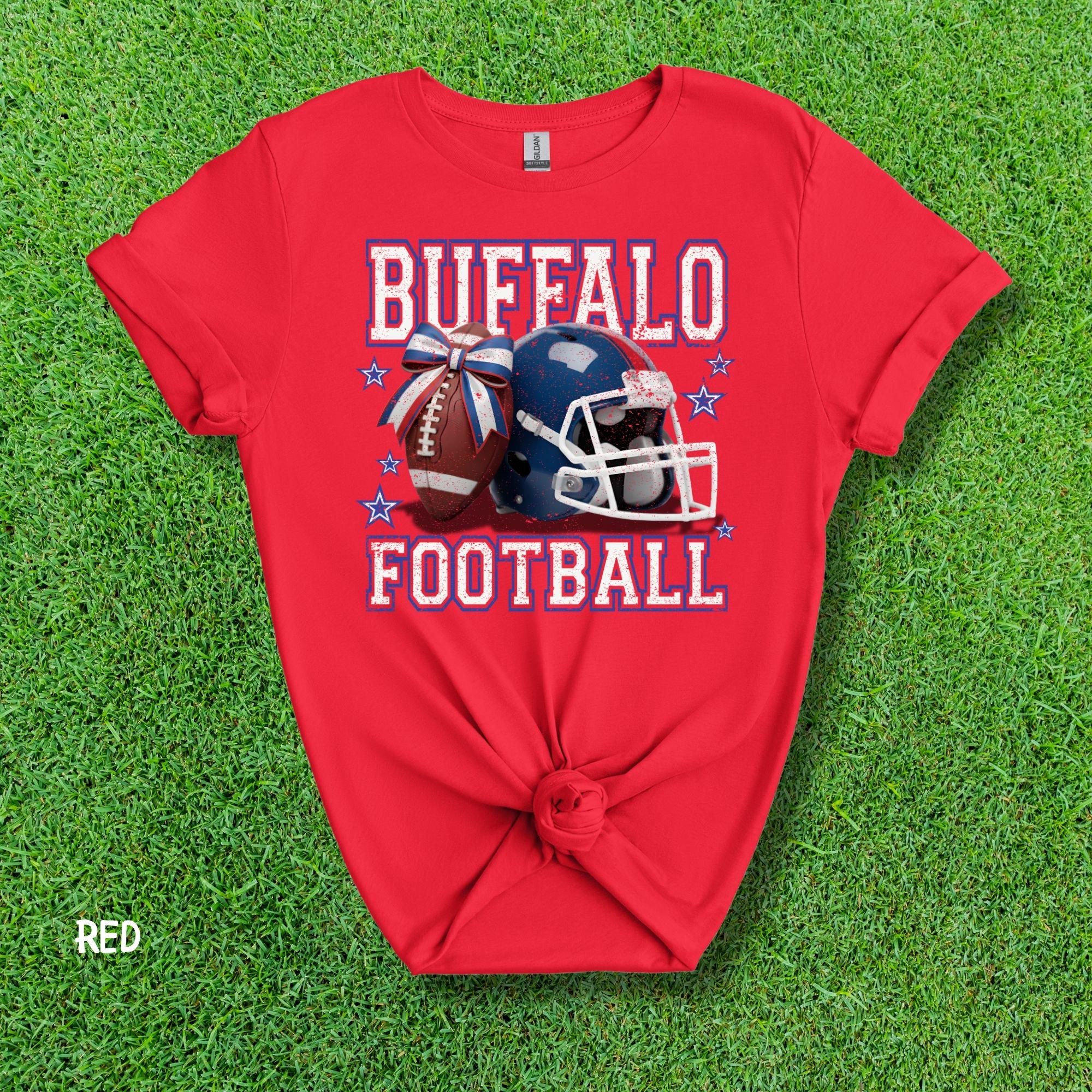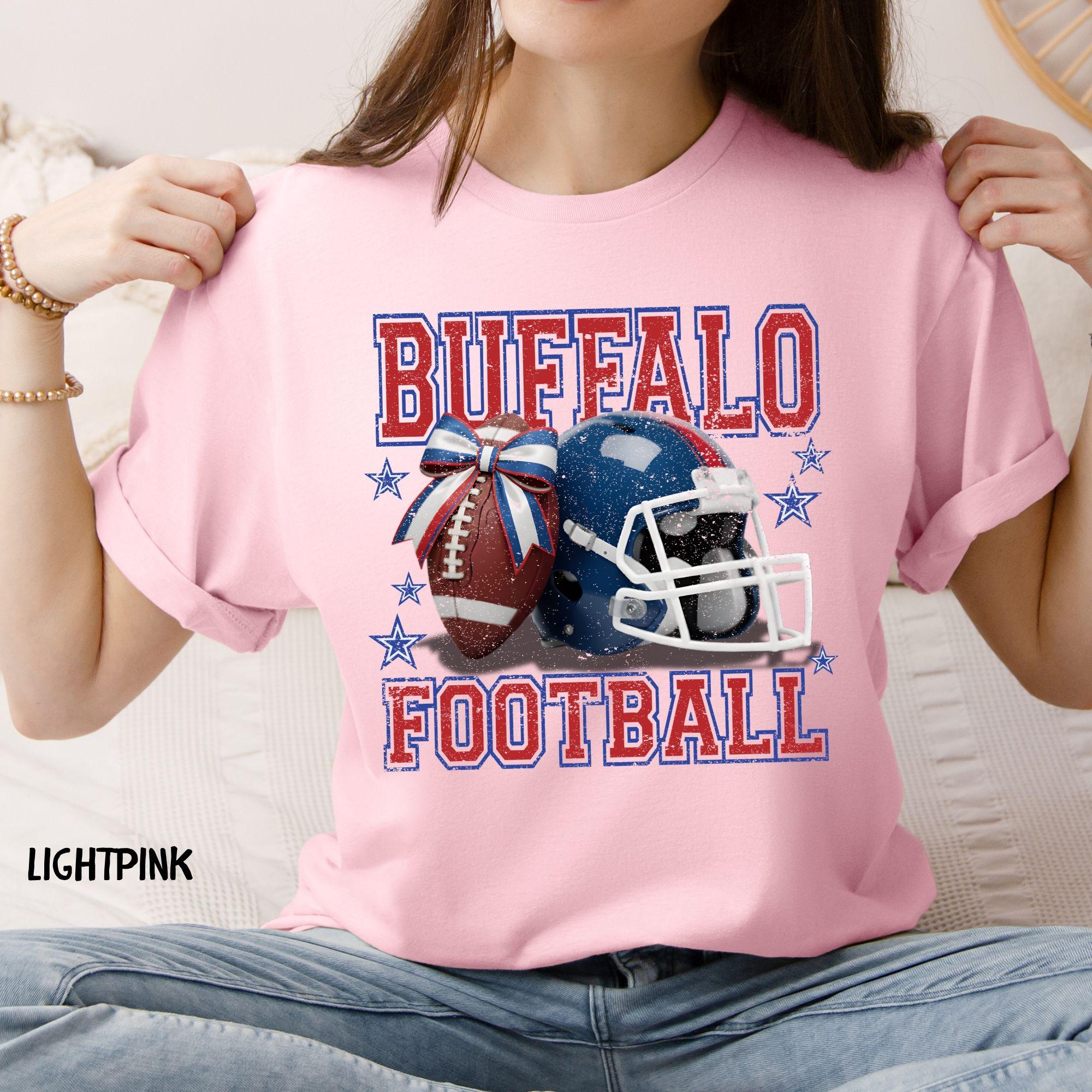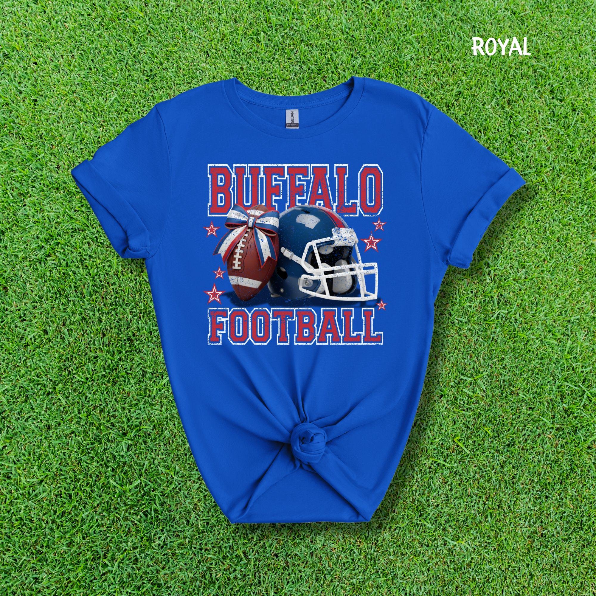 Show your Buffalo pride in style! This isn't just another game day shirt; it's a trendy statement piece. Featuring a bold design with a cute coquette bow, this top merges classic football spirit with a modern, feminine touch. The vintage distressed effect gives it that perfect lived-in feel, making it an instant favorite for tailgates, watch parties, or just showing off your team colors around town.