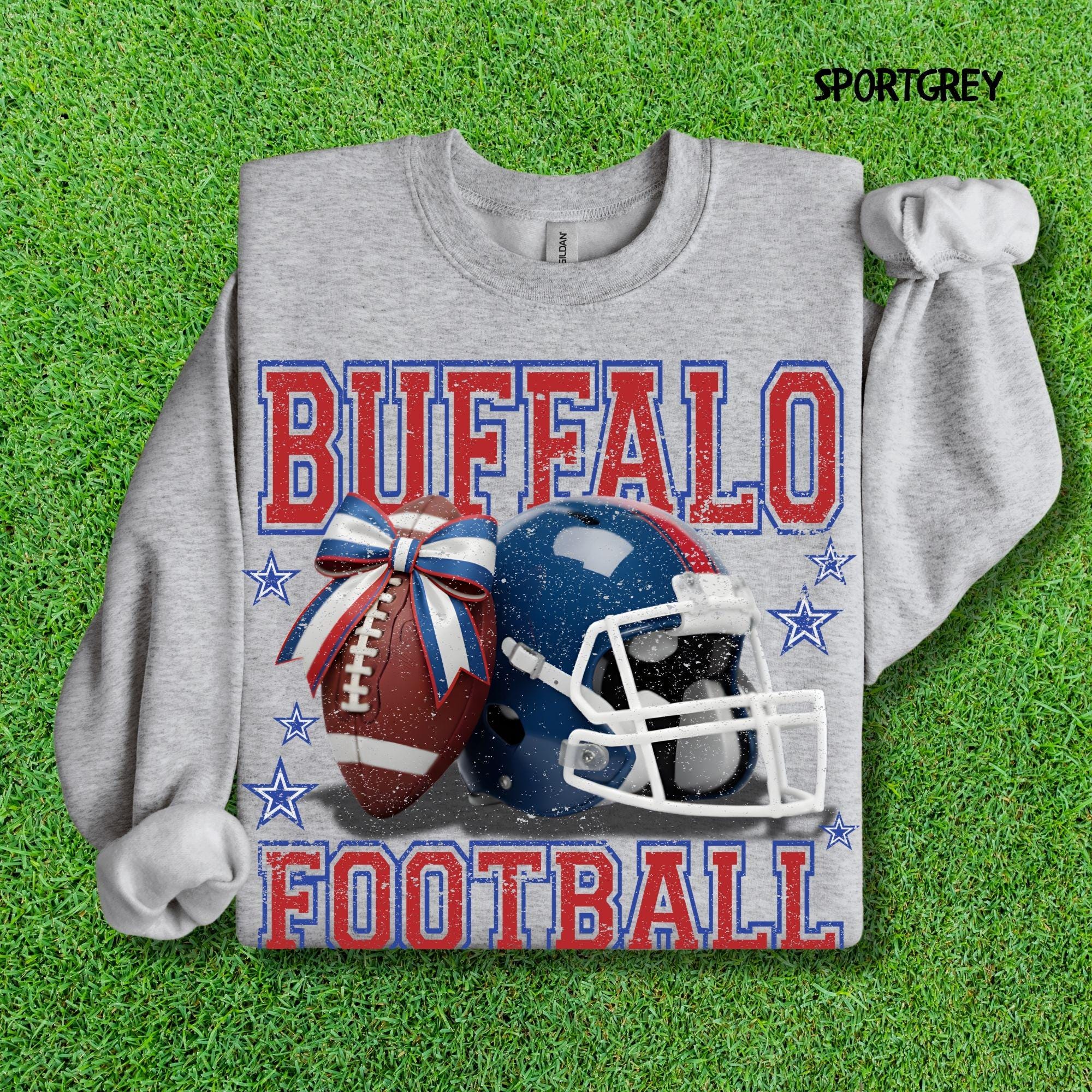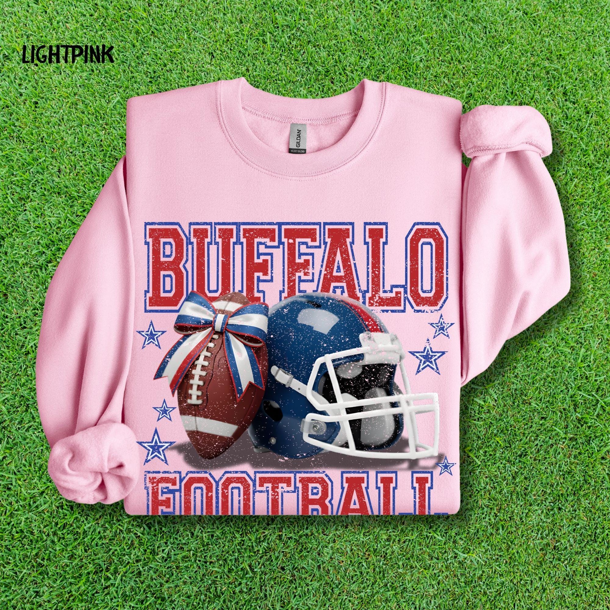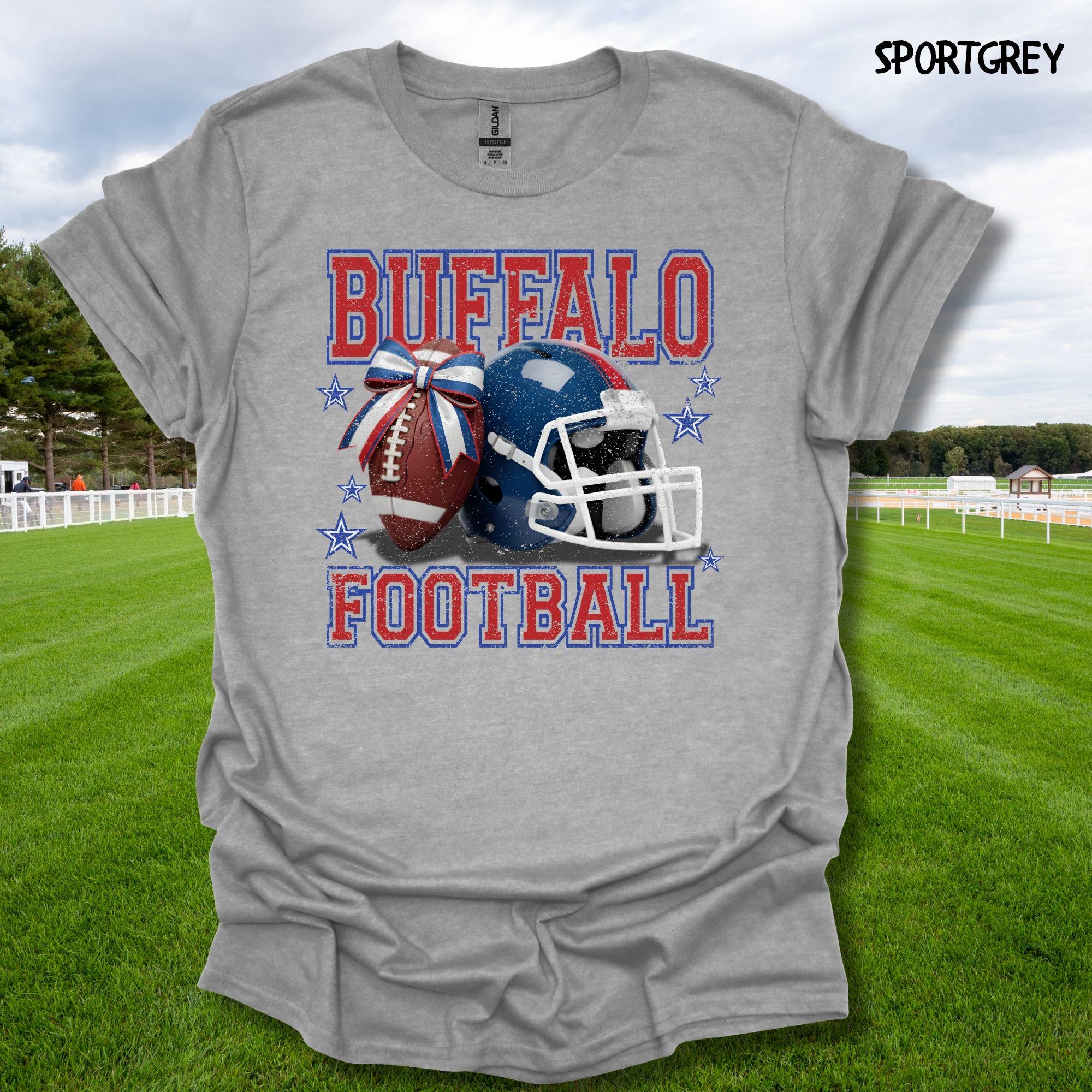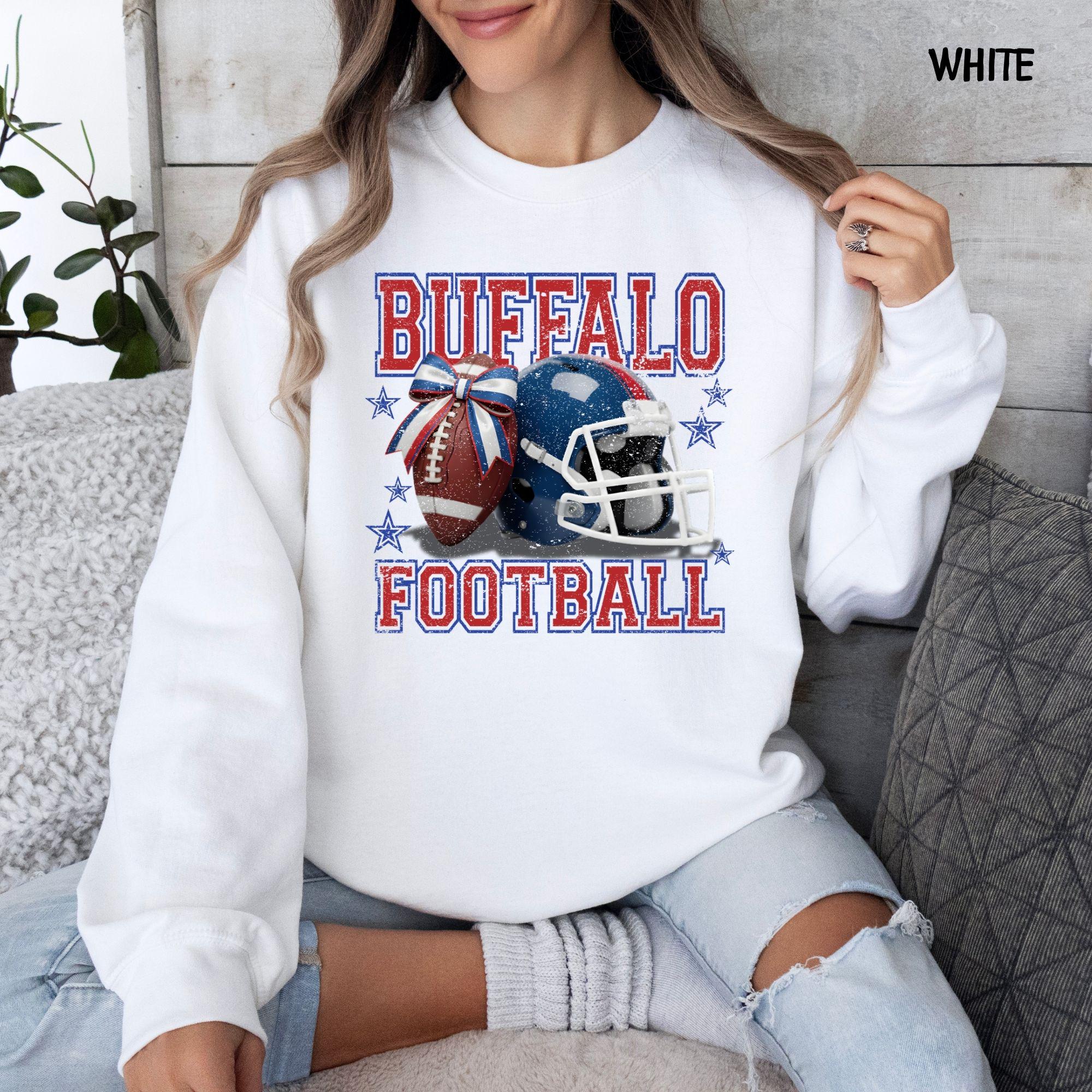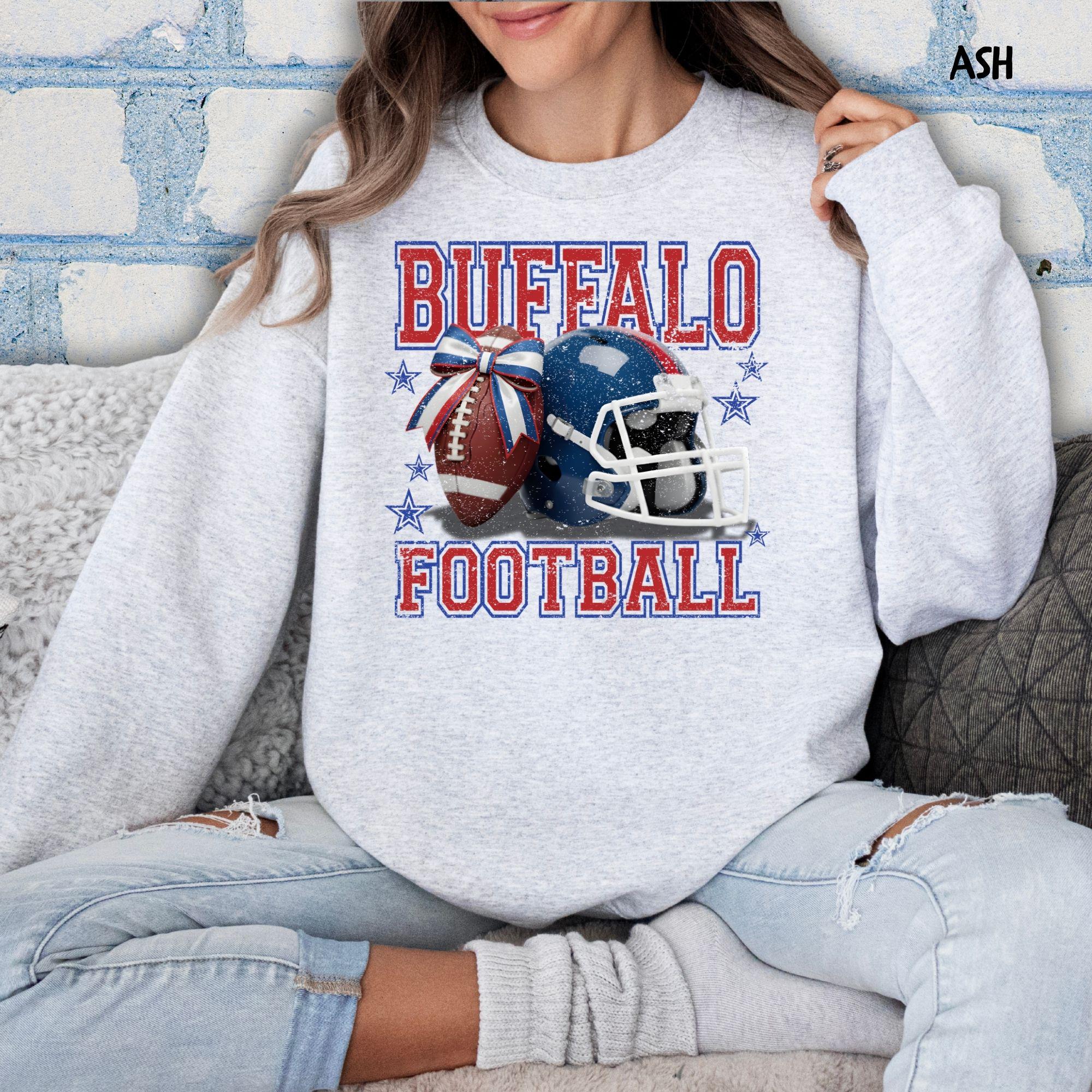 Show your Buffalo pride in style! This isn't just another game day shirt; it's a trendy statement piece. Featuring a bold design with a cute coquette bow, this top merges classic football spirit with a modern, feminine touch. The vintage distressed effect gives it that perfect lived-in feel, making it an instant favorite for tailgates, watch parties, or just showing off your team colors around town.
