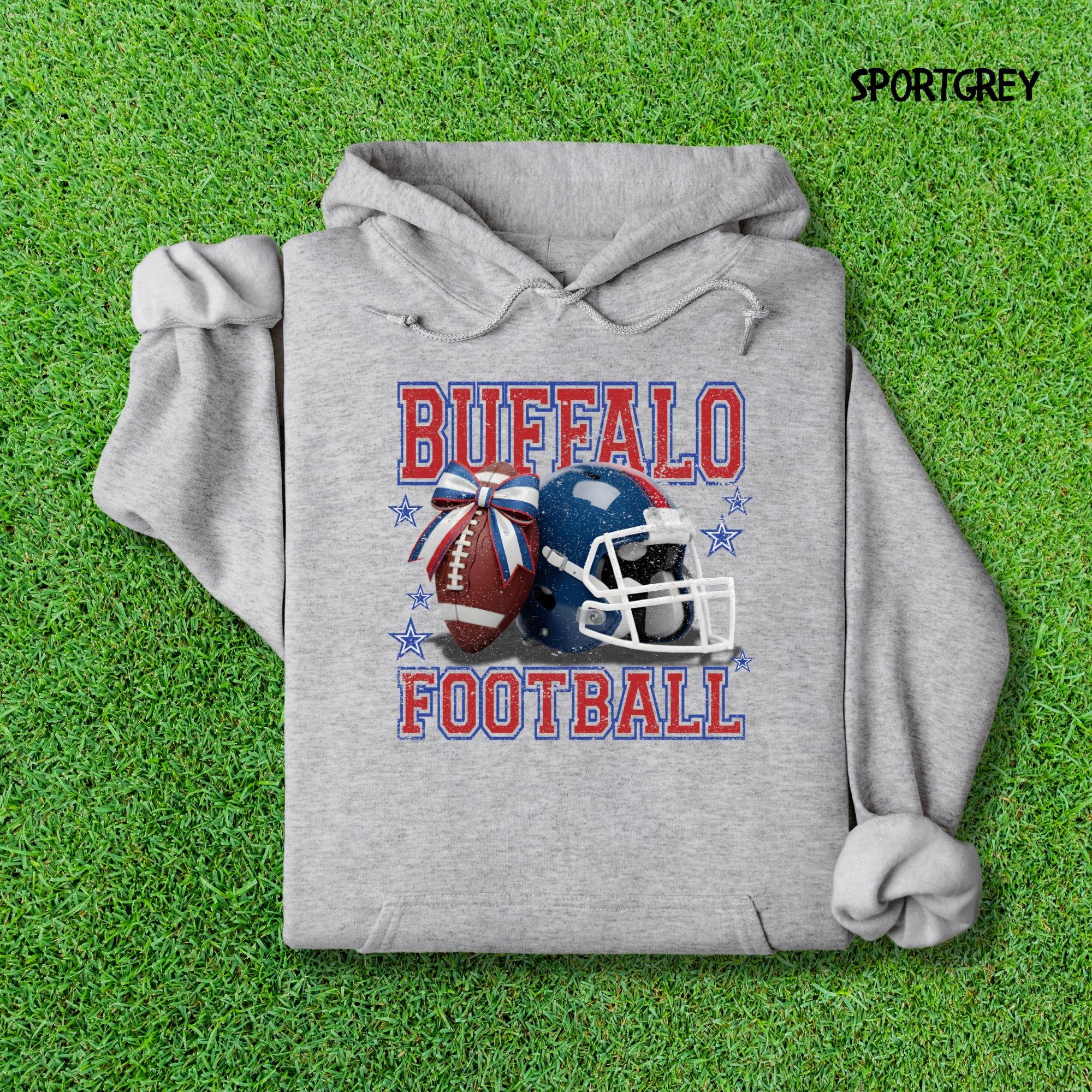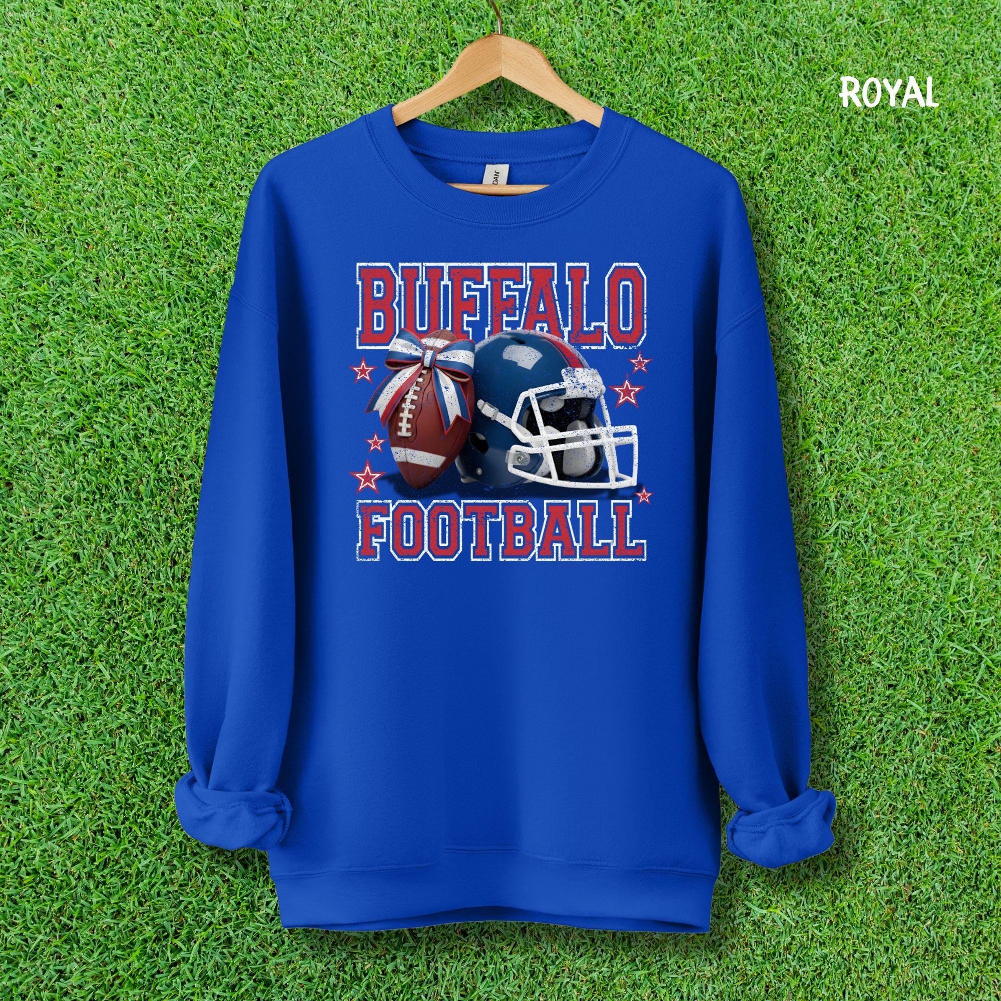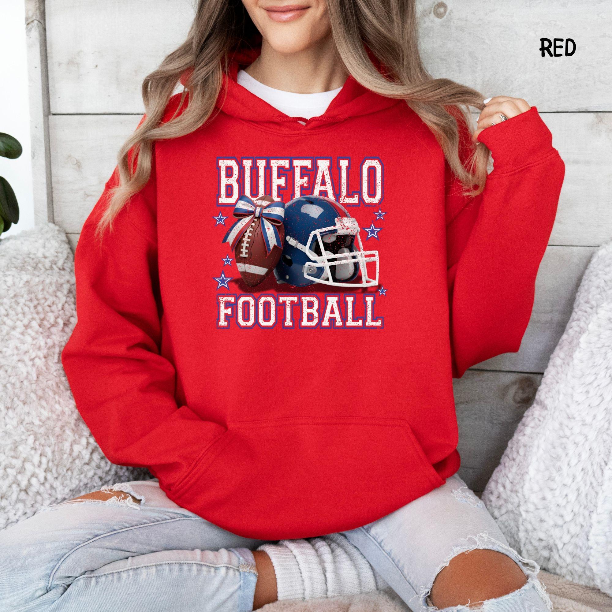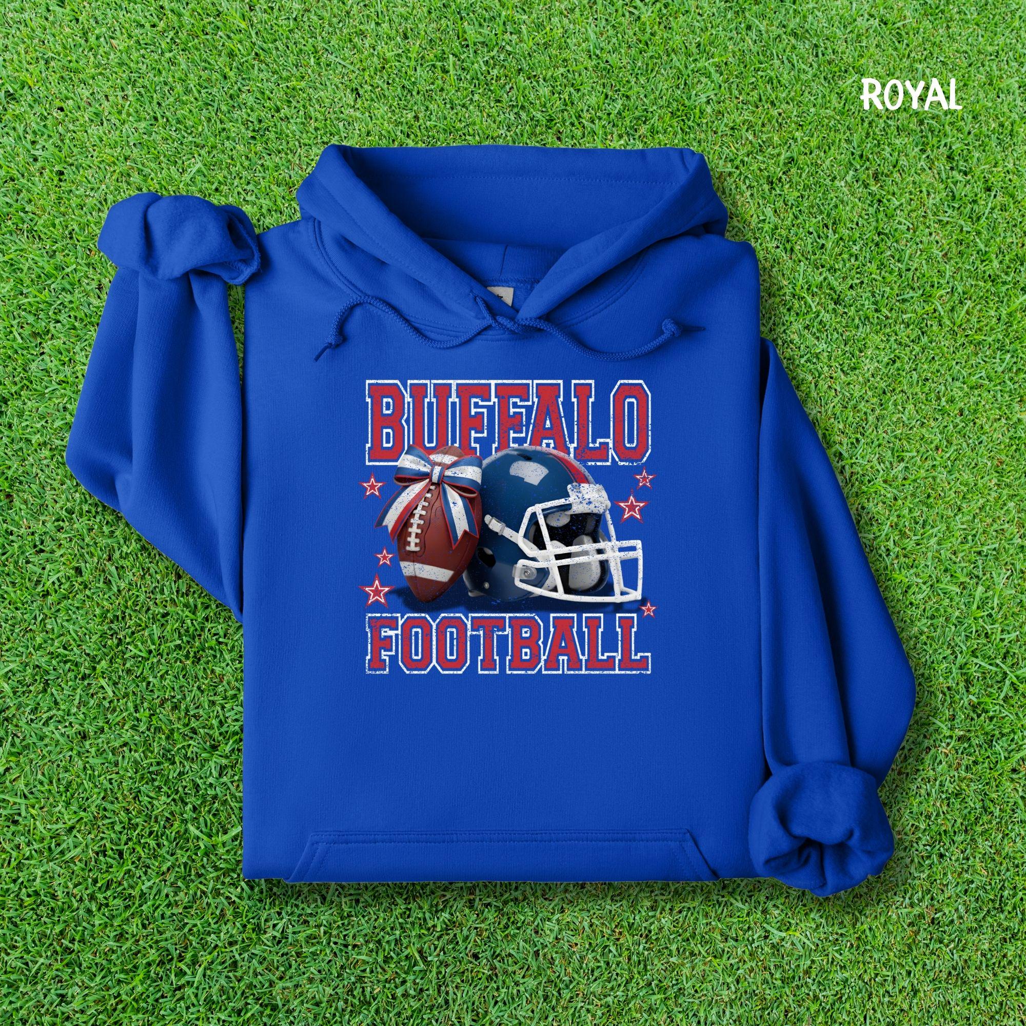 Show your Buffalo pride in style! This isn't just another game day shirt; it's a trendy statement piece. Featuring a bold design with a cute coquette bow, this top merges classic football spirit with a modern, feminine touch. The vintage distressed effect gives it that perfect lived-in feel, making it an instant favorite for tailgates, watch parties, or just showing off your team colors around town.