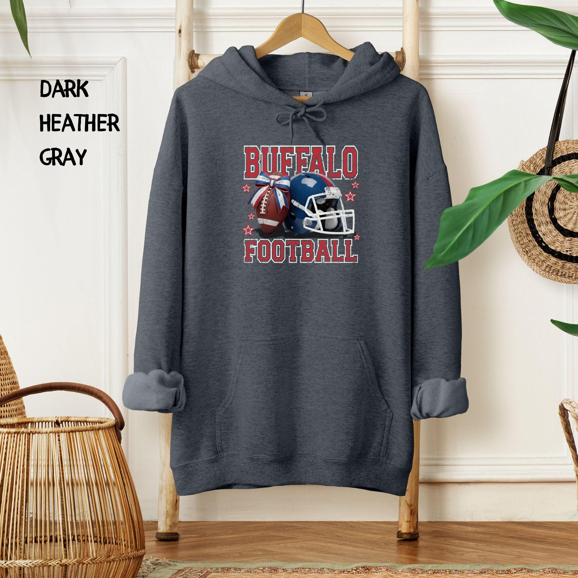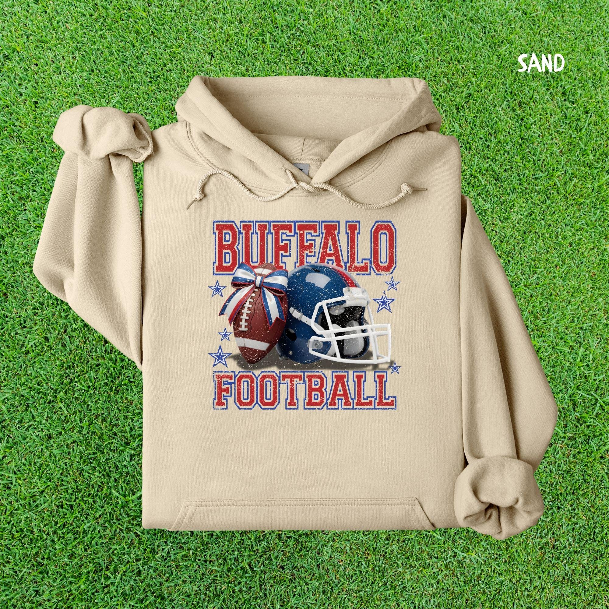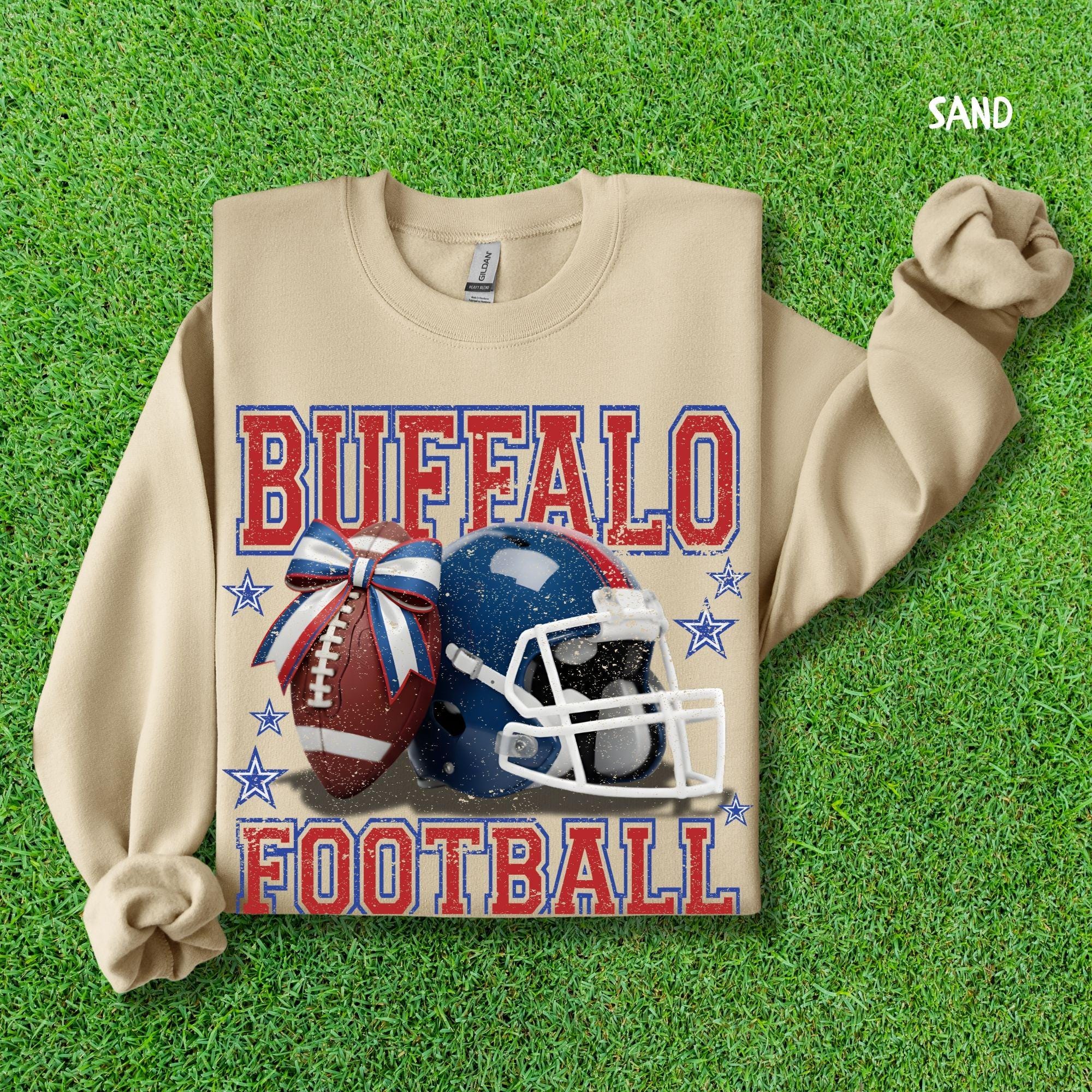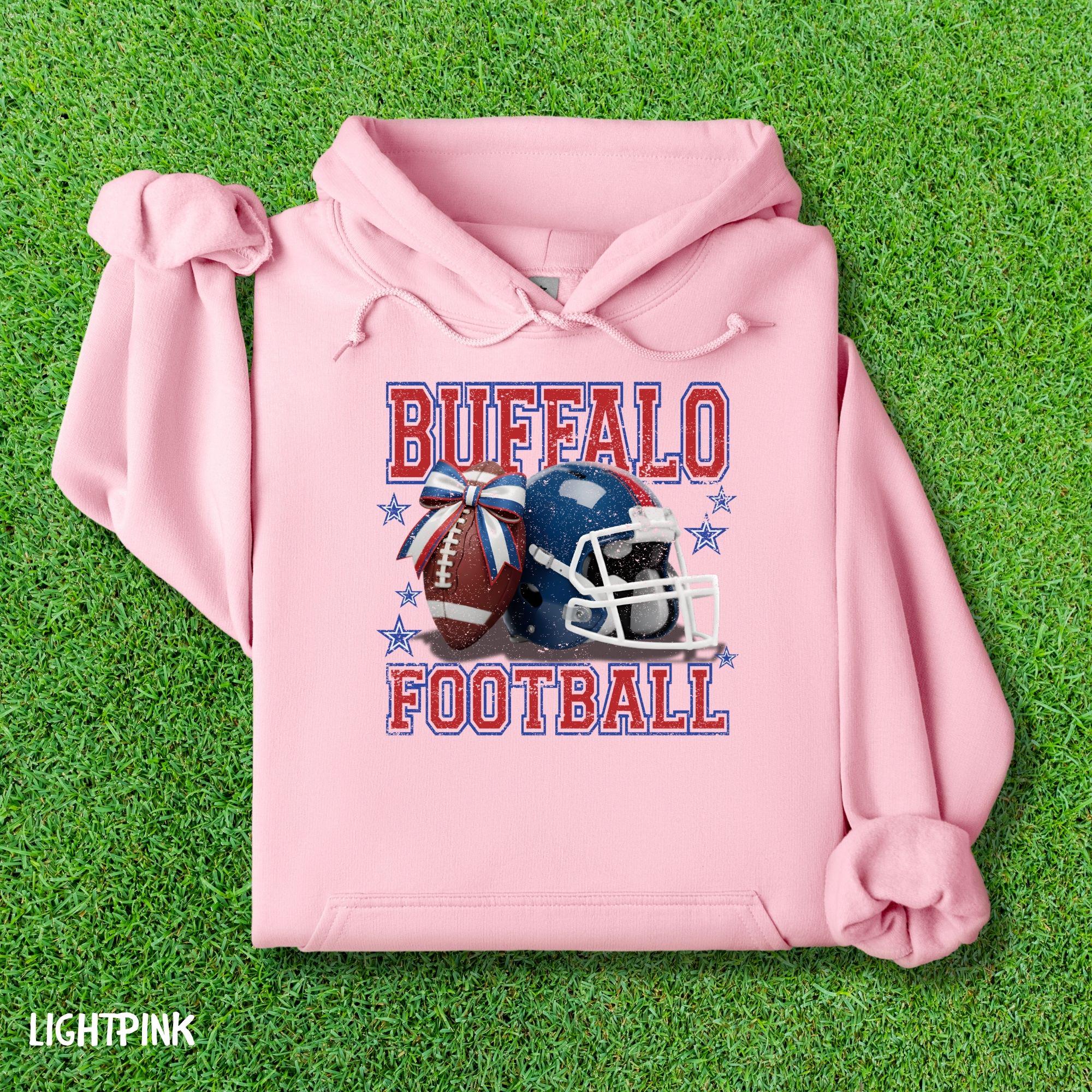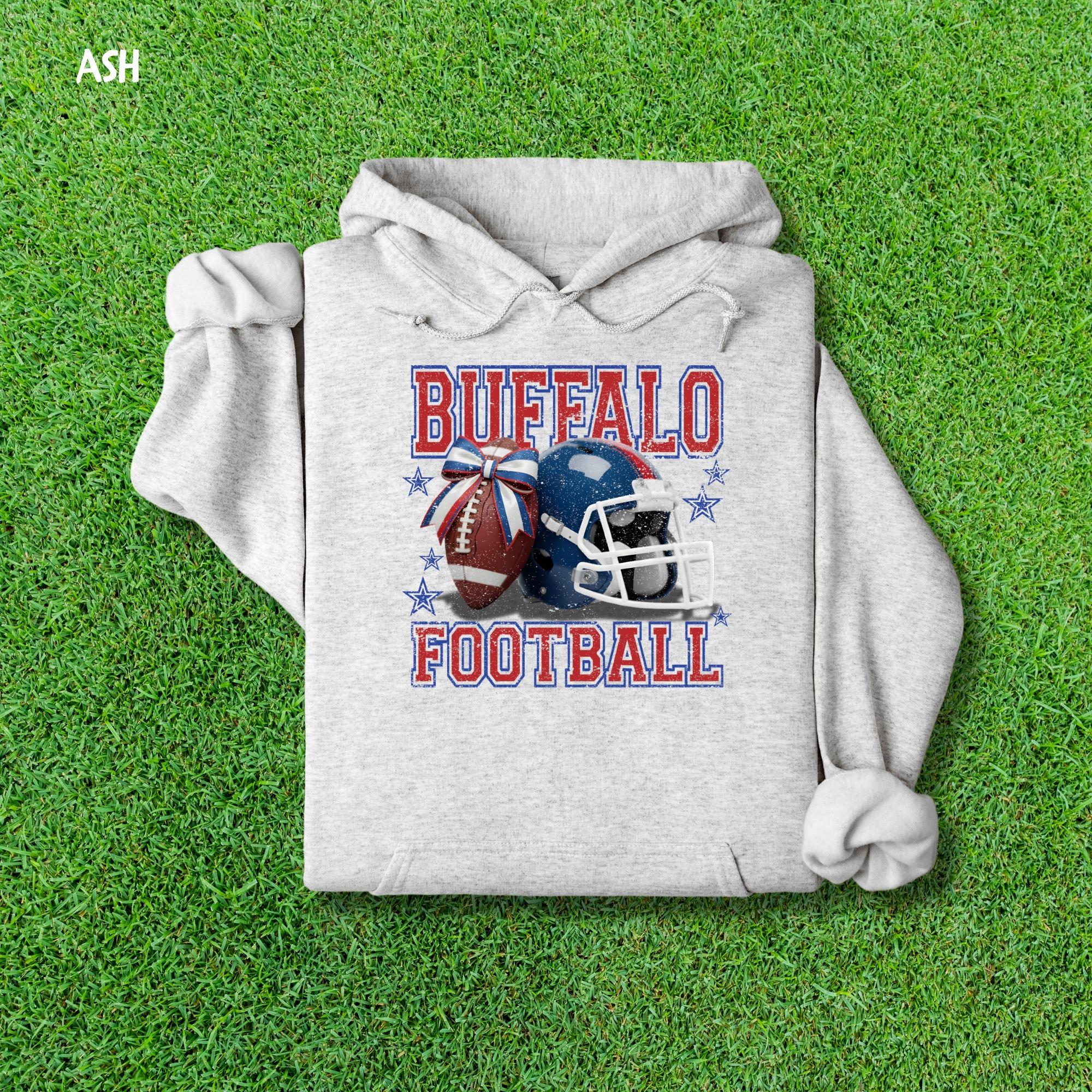 Show your Buffalo pride in style! This isn't just another game day shirt; it's a trendy statement piece. Featuring a bold design with a cute coquette bow, this top merges classic football spirit with a modern, feminine touch. The vintage distressed effect gives it that perfect lived-in feel, making it an instant favorite for tailgates, watch parties, or just showing off your team colors around town.