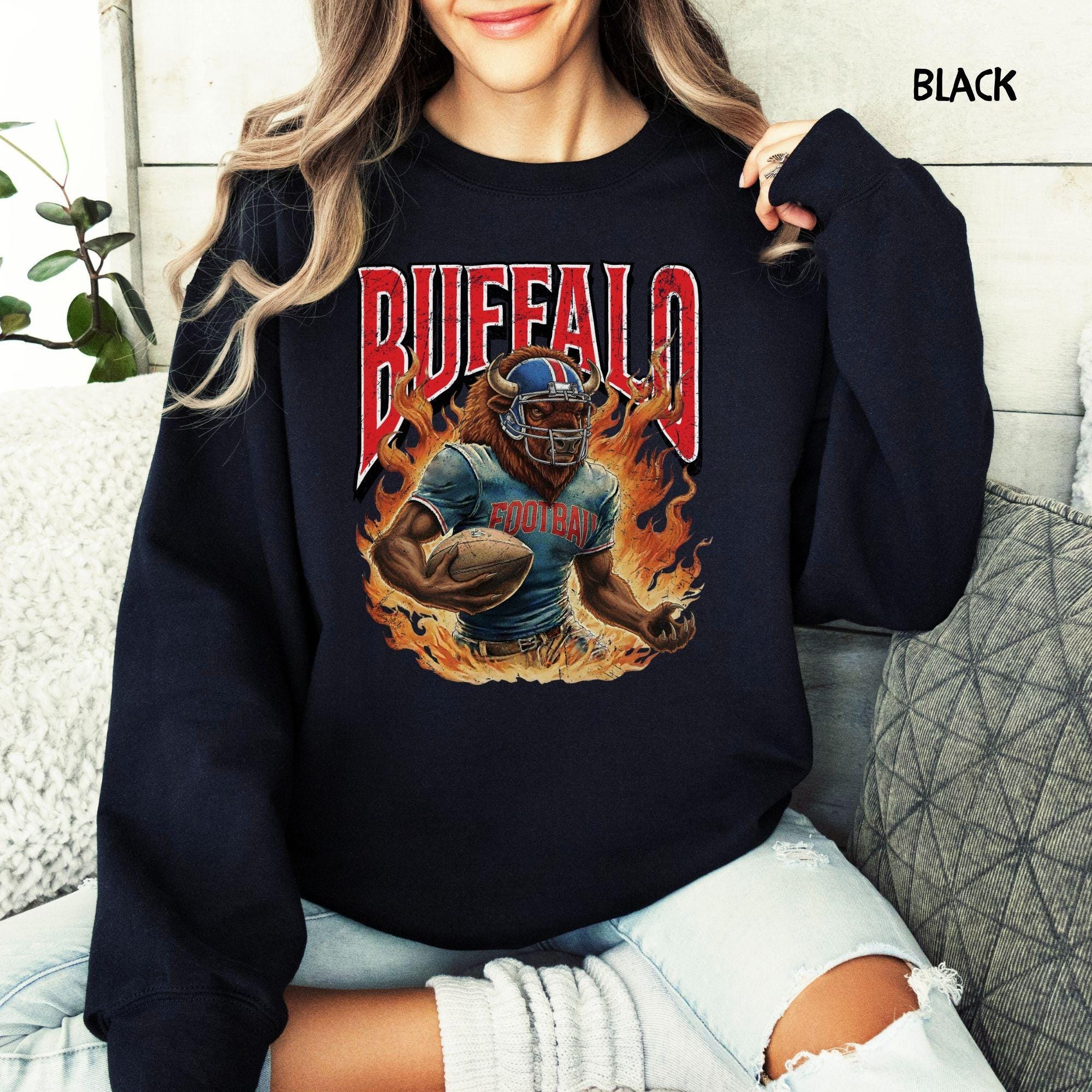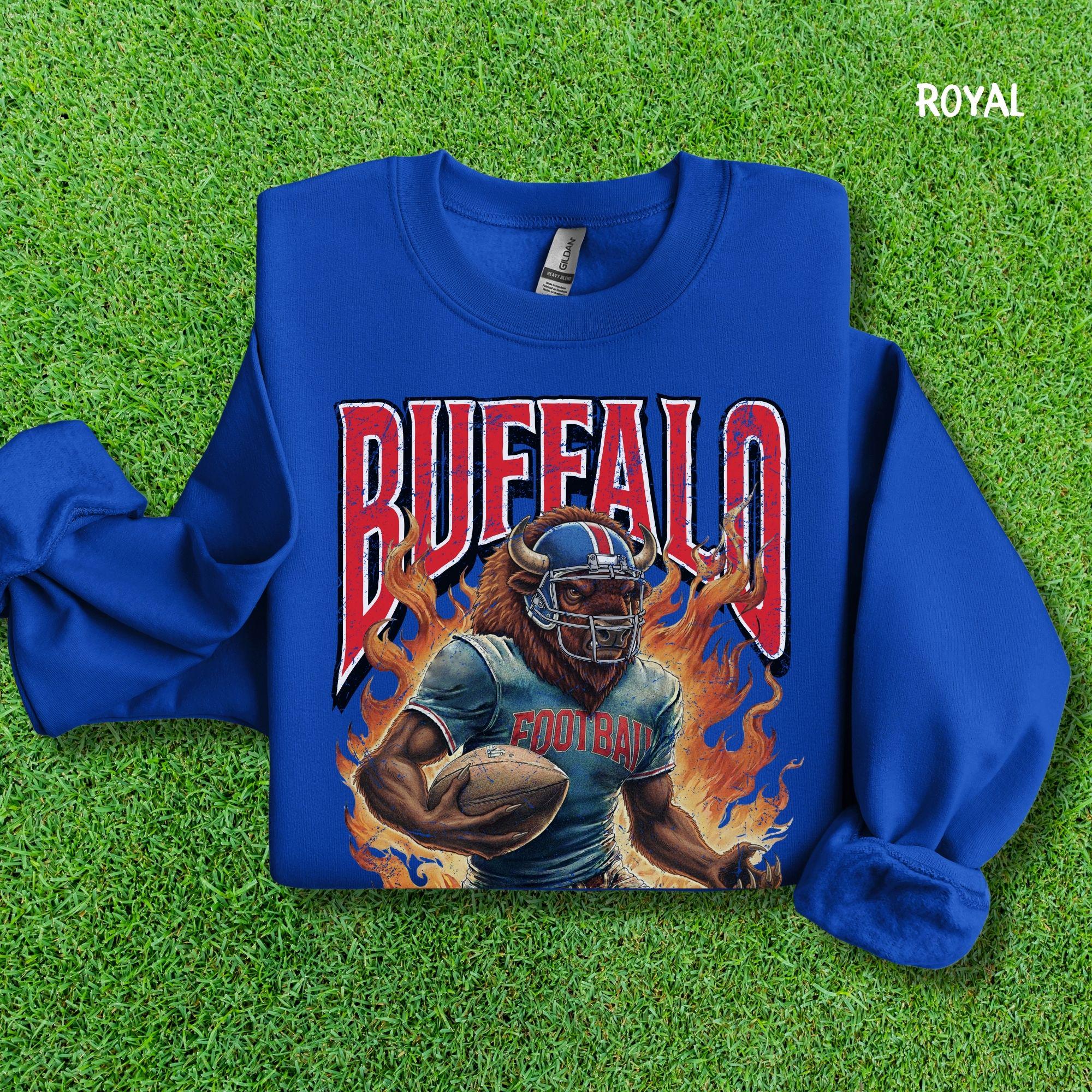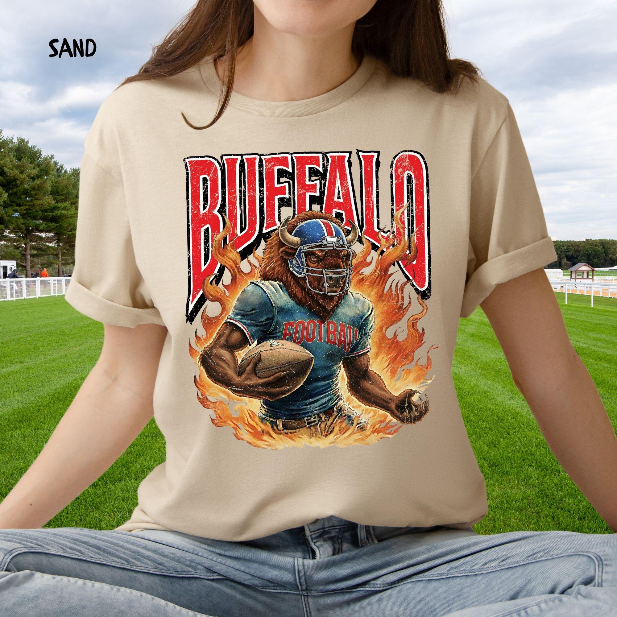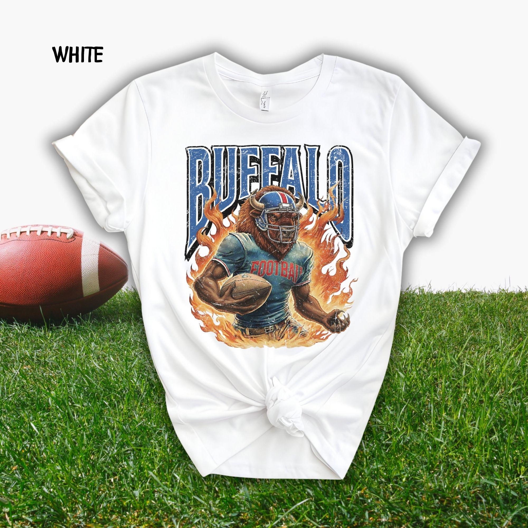 Show your Buffalo pride with this aggressive, vintage-style football mascot shirt! Featuring a dynamic flaming buffalo design inspired by 90s retro sports aesthetics, this tee is perfect for rocking at the tailgate or celebrating on gameday.