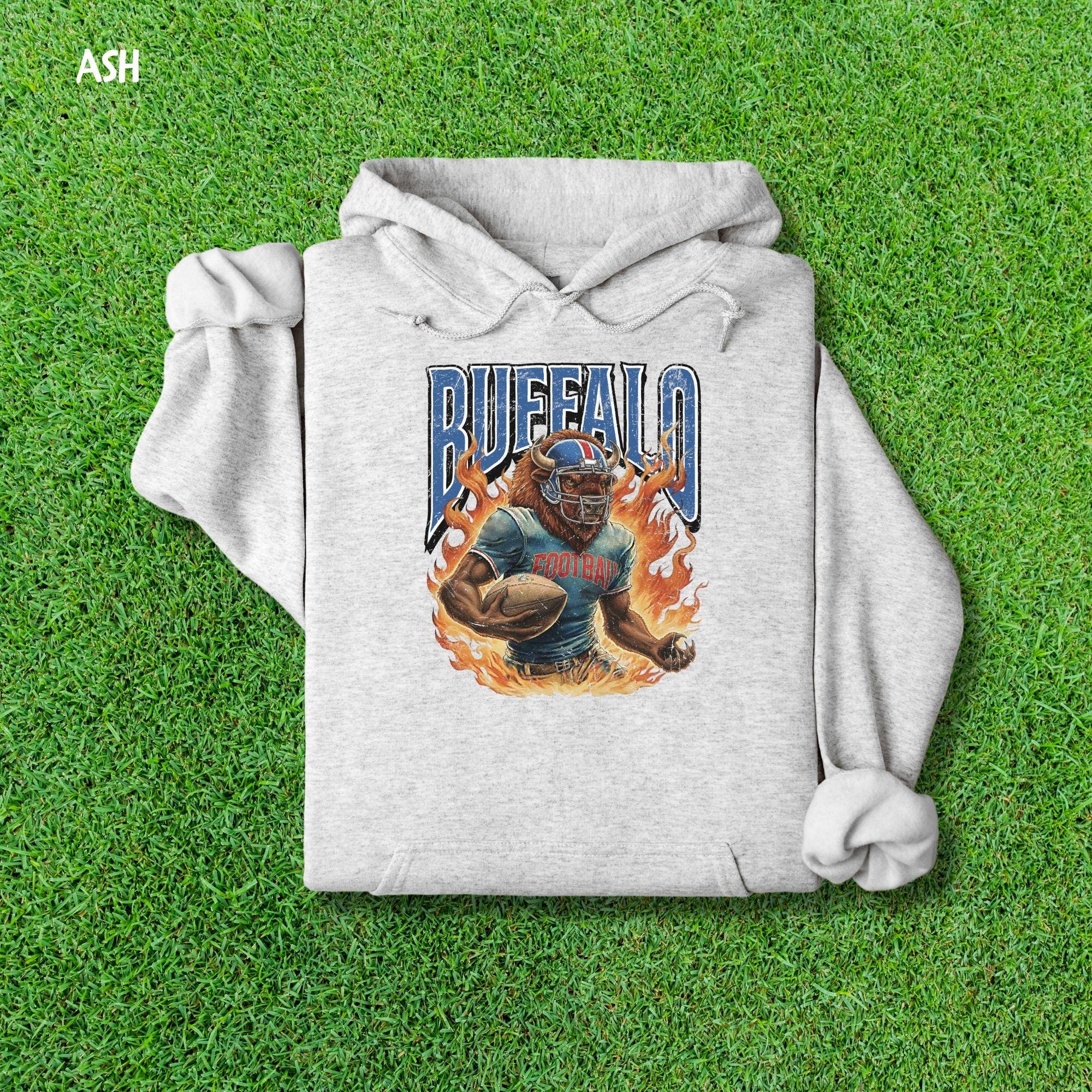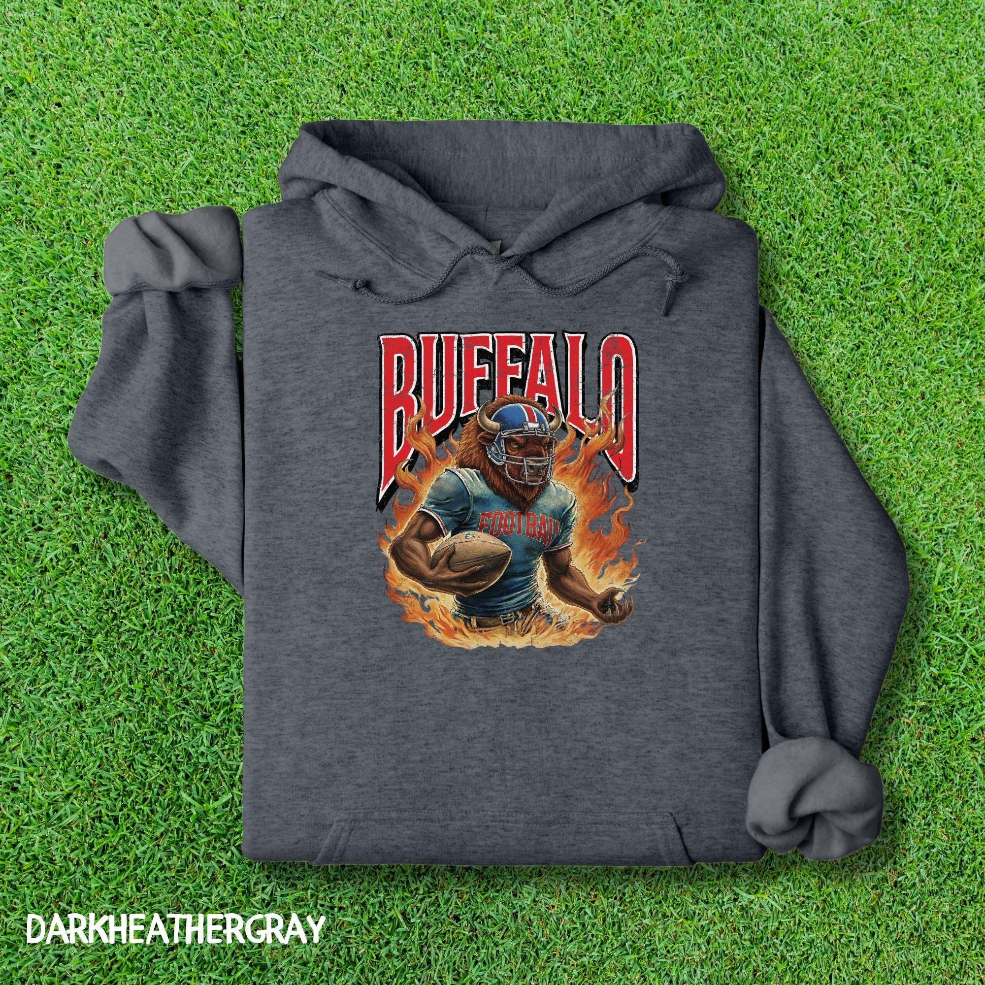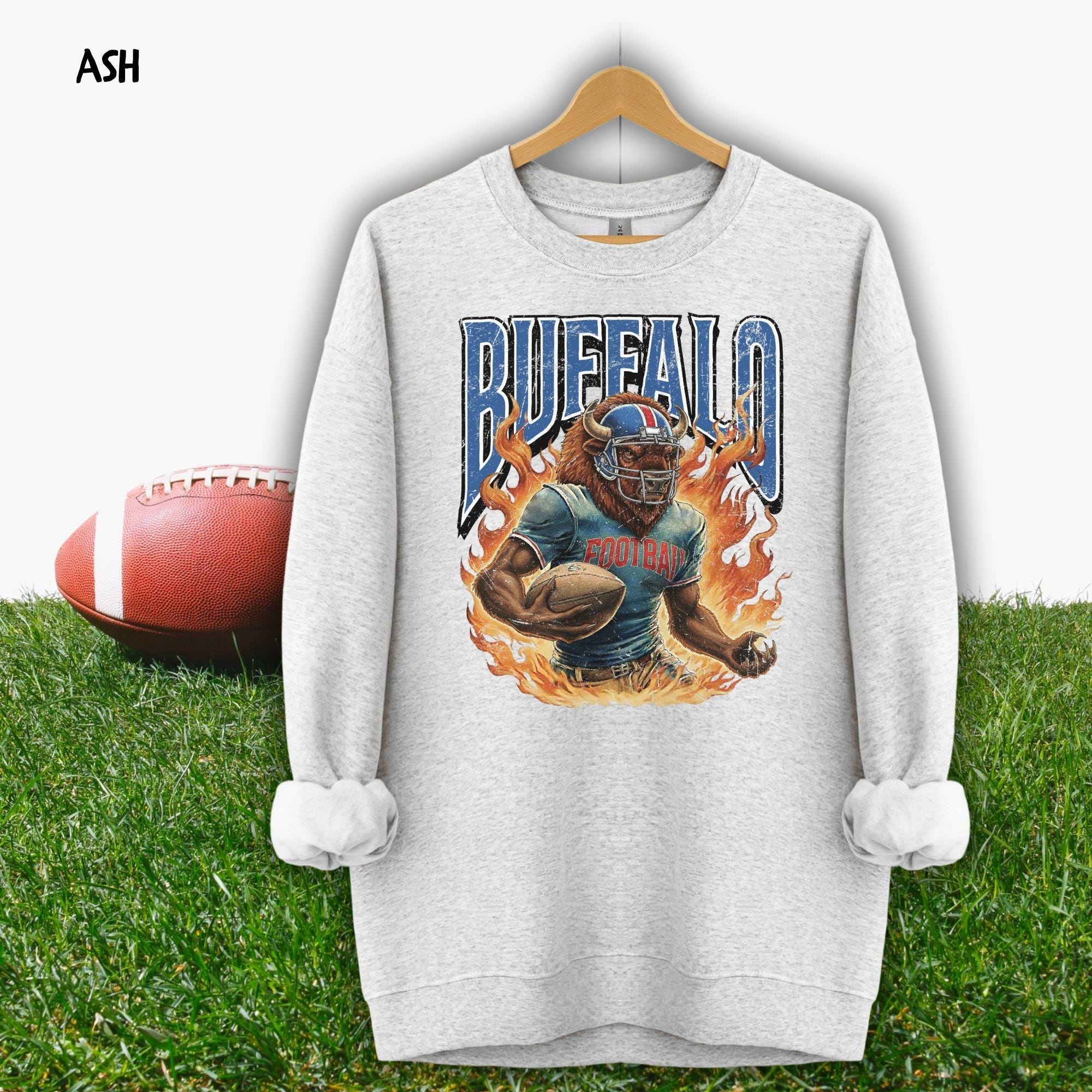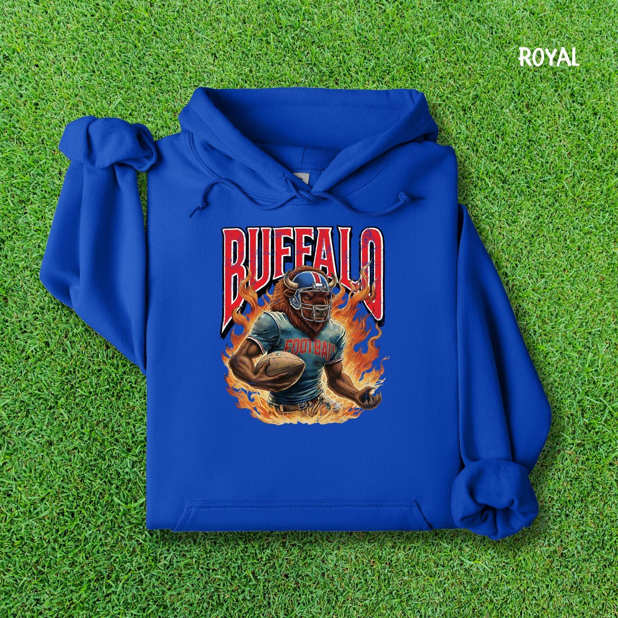 Show your Buffalo pride with this aggressive, vintage-style football mascot shirt! Featuring a dynamic flaming buffalo design inspired by 90s retro sports aesthetics, this tee is perfect for rocking at the tailgate or celebrating on gameday.