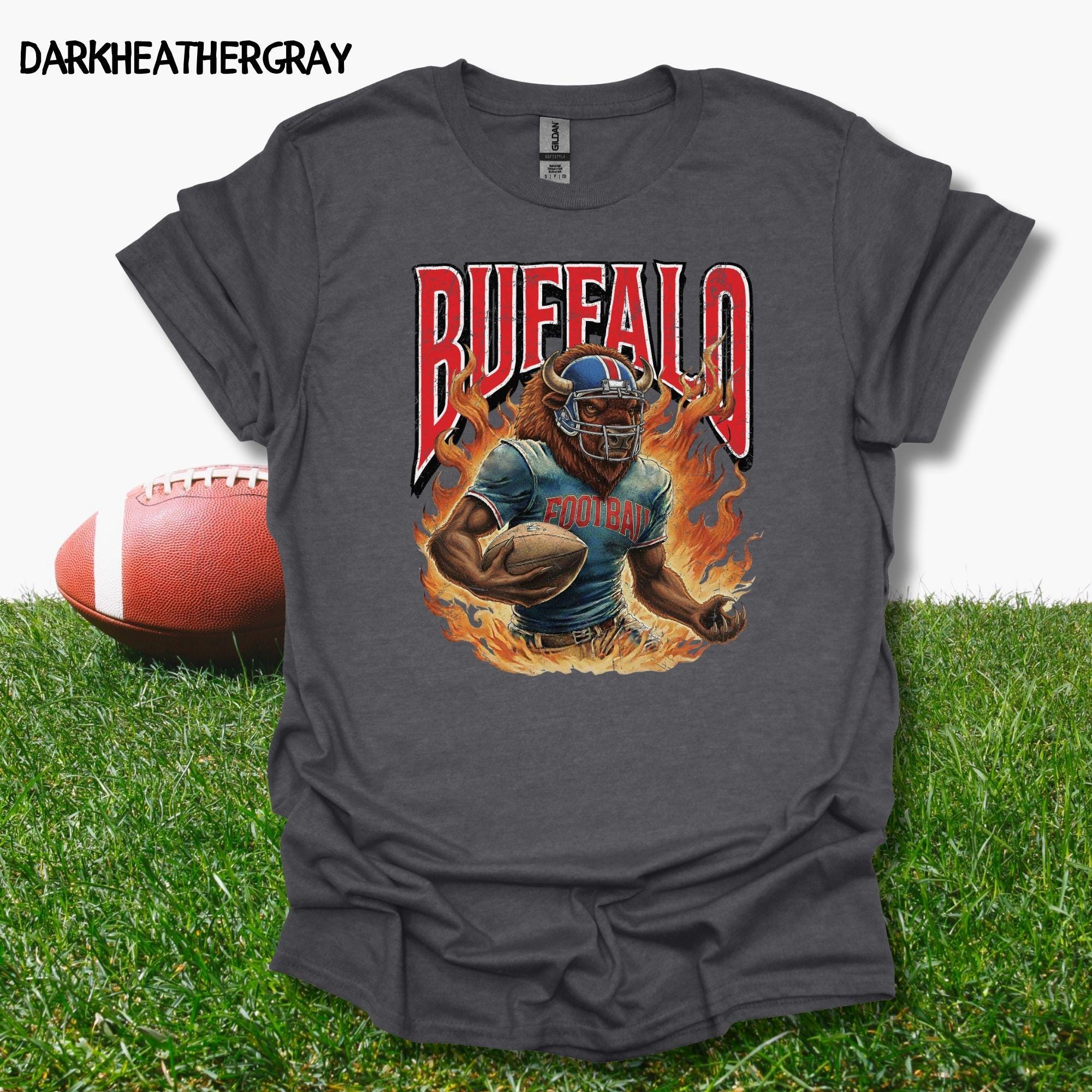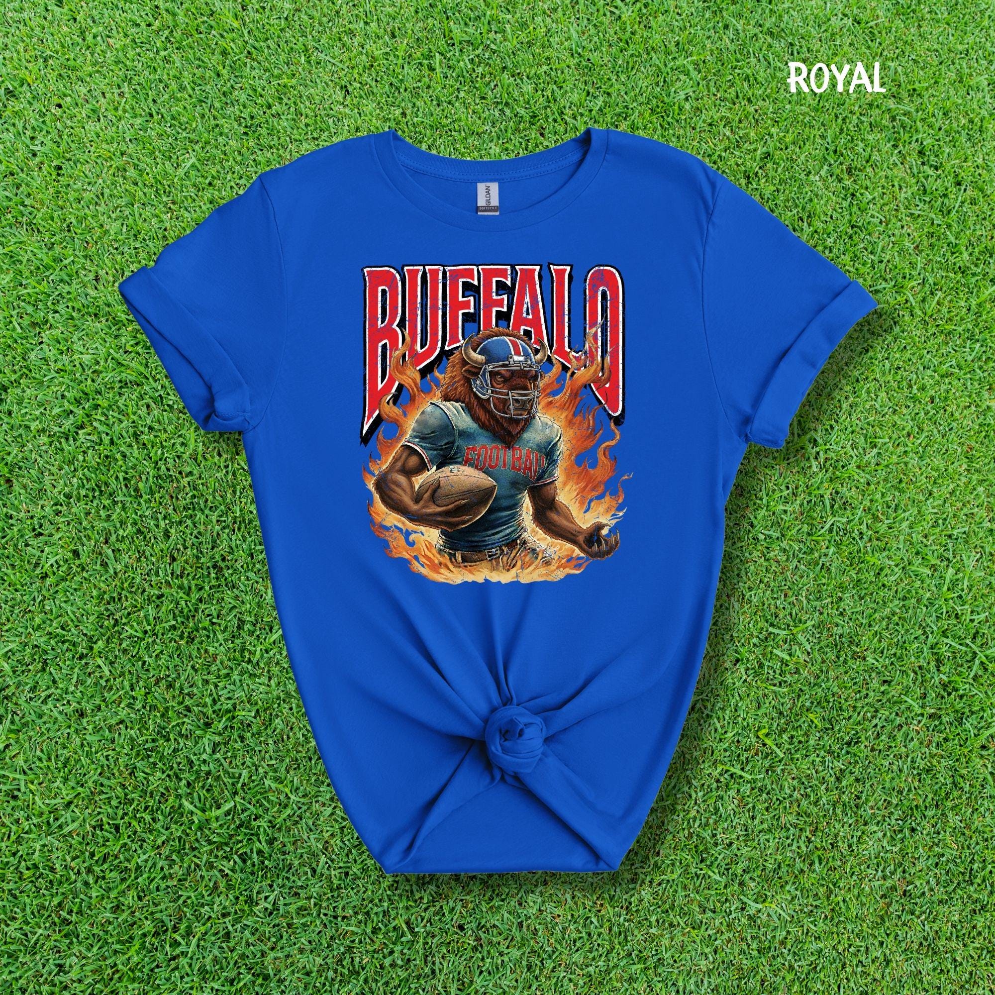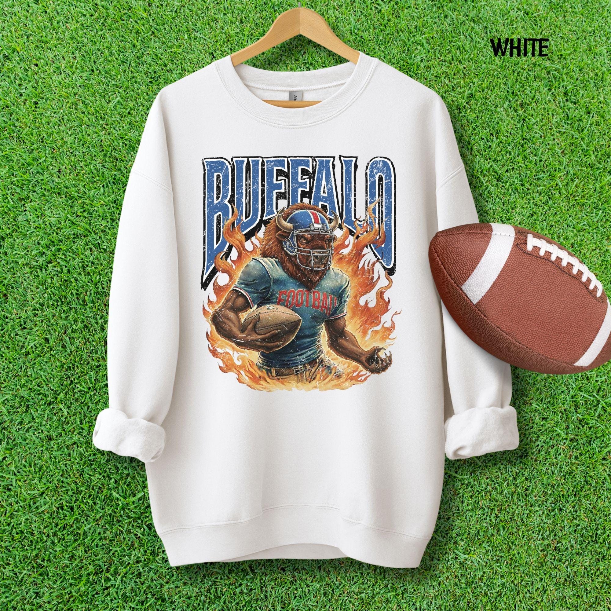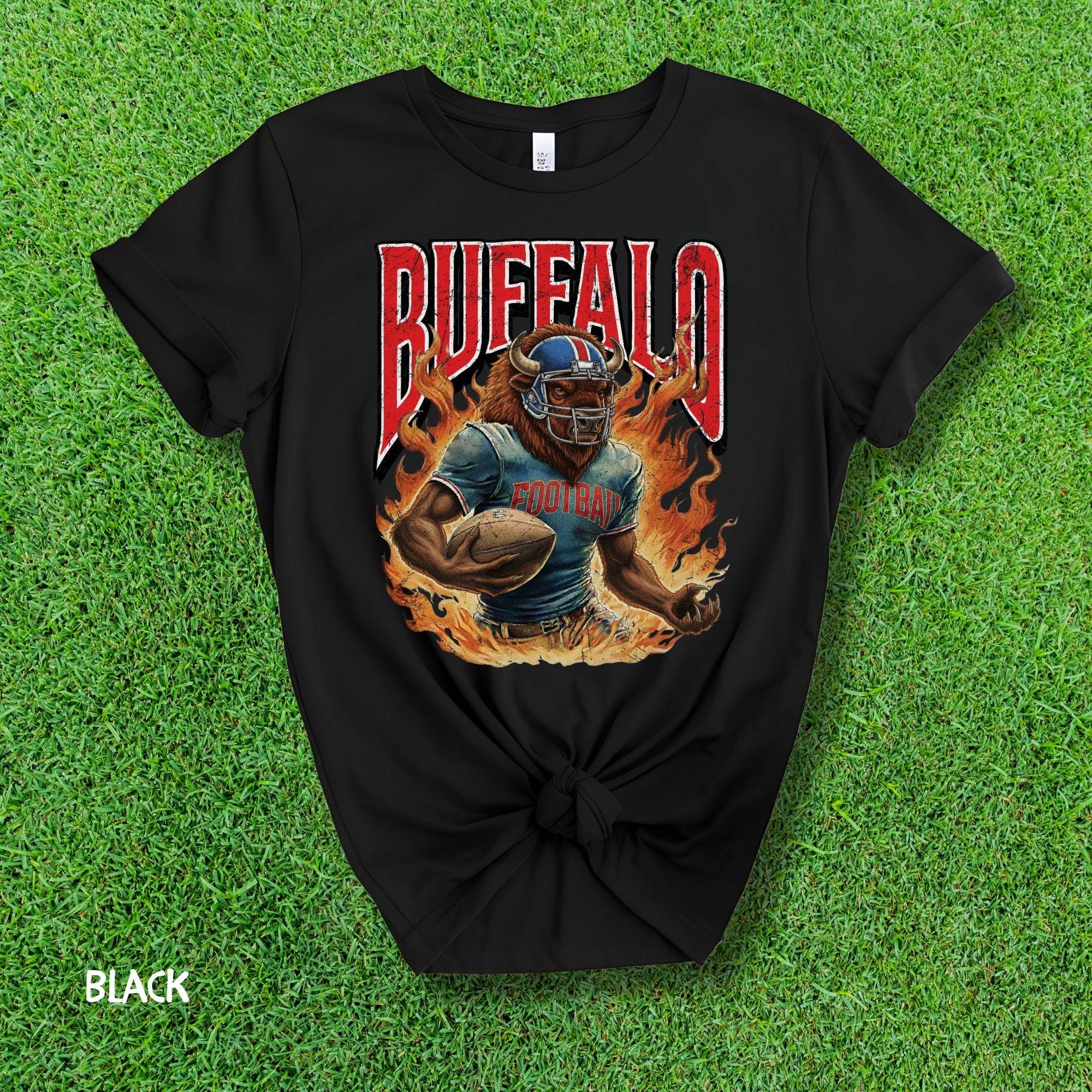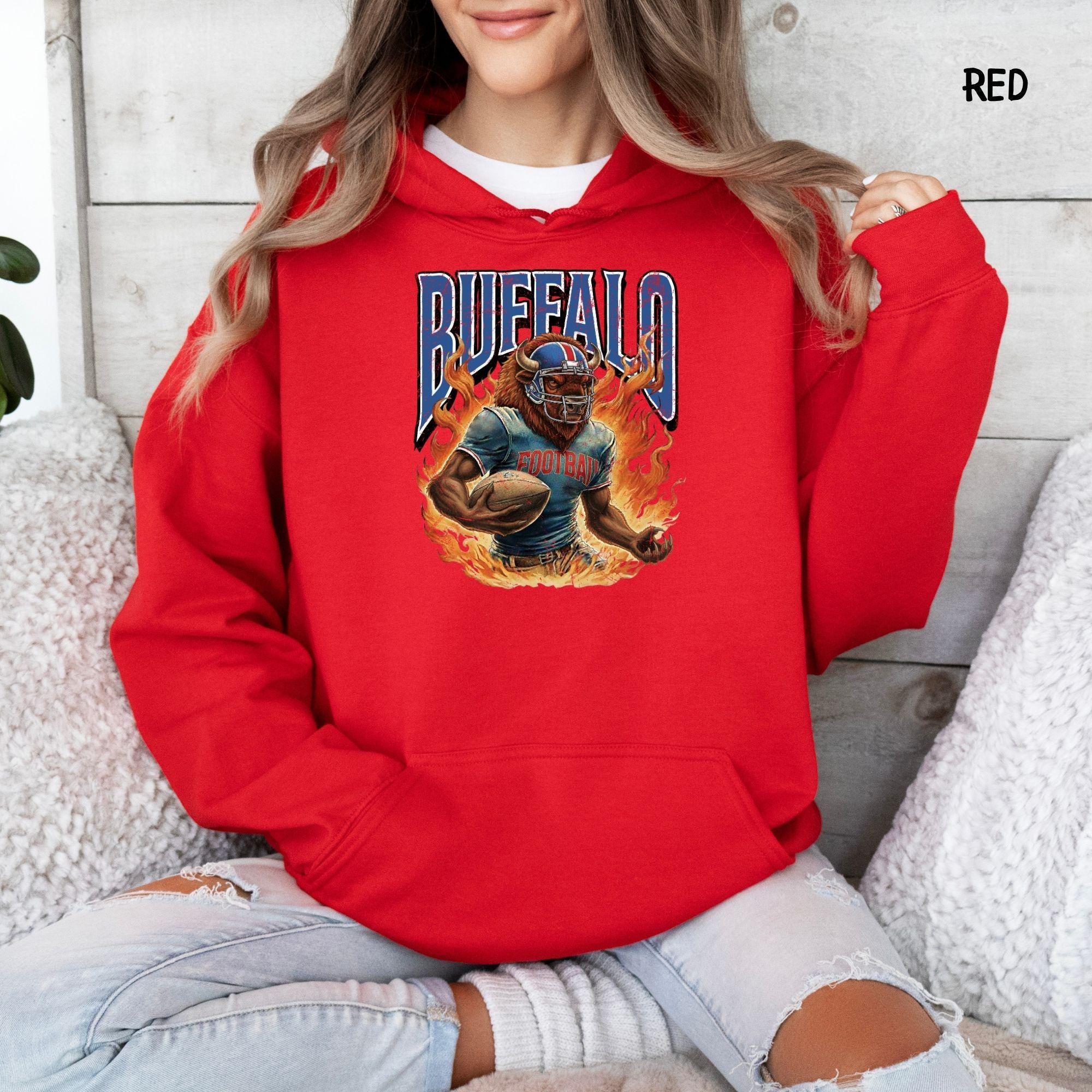 Show your Buffalo pride with this aggressive, vintage-style football mascot shirt! Featuring a dynamic flaming buffalo design inspired by 90s retro sports aesthetics, this tee is perfect for rocking at the tailgate or celebrating on gameday.