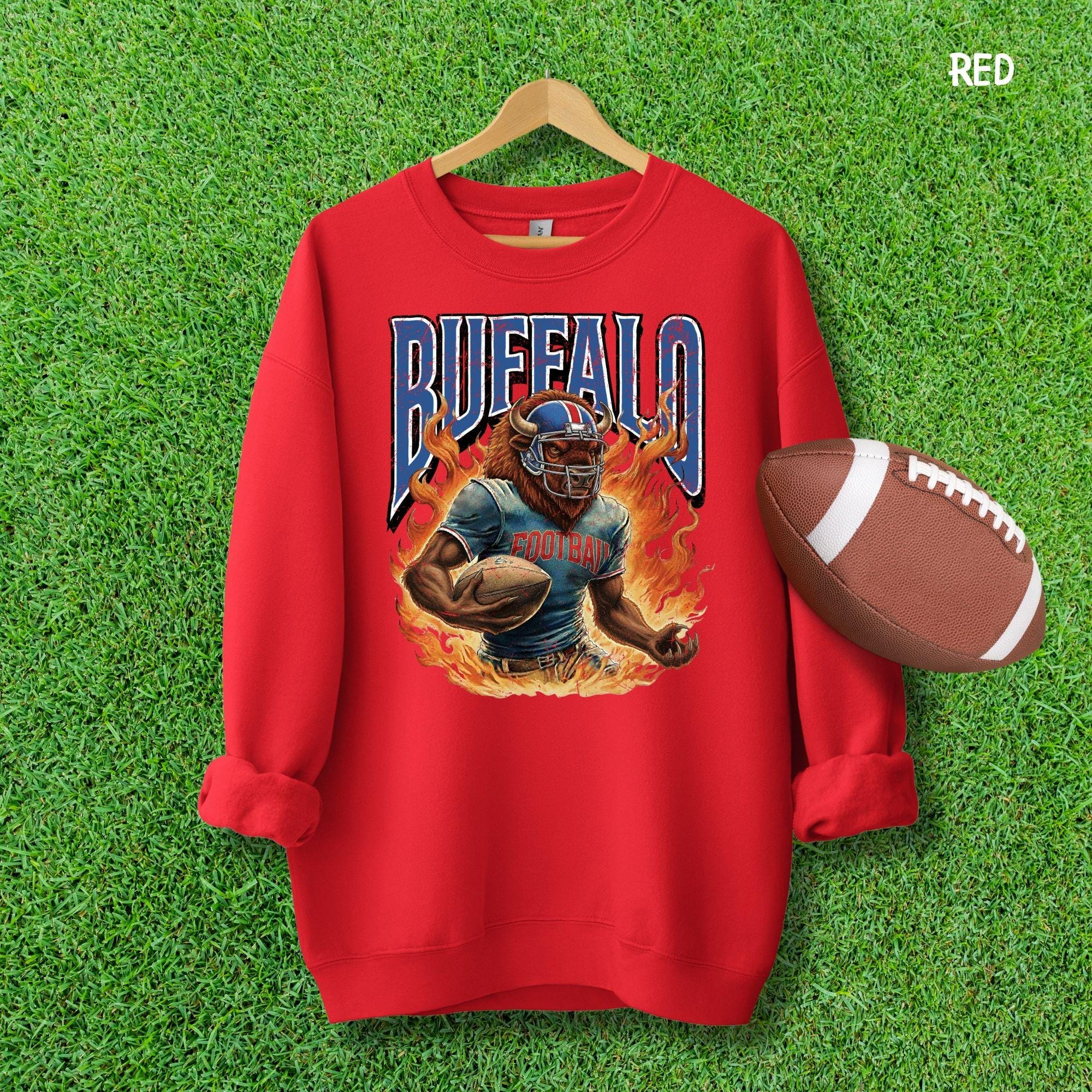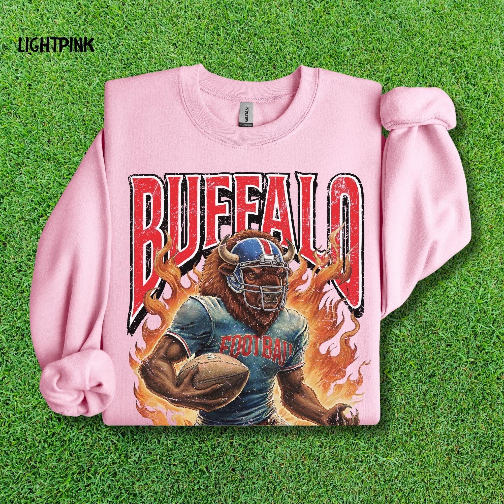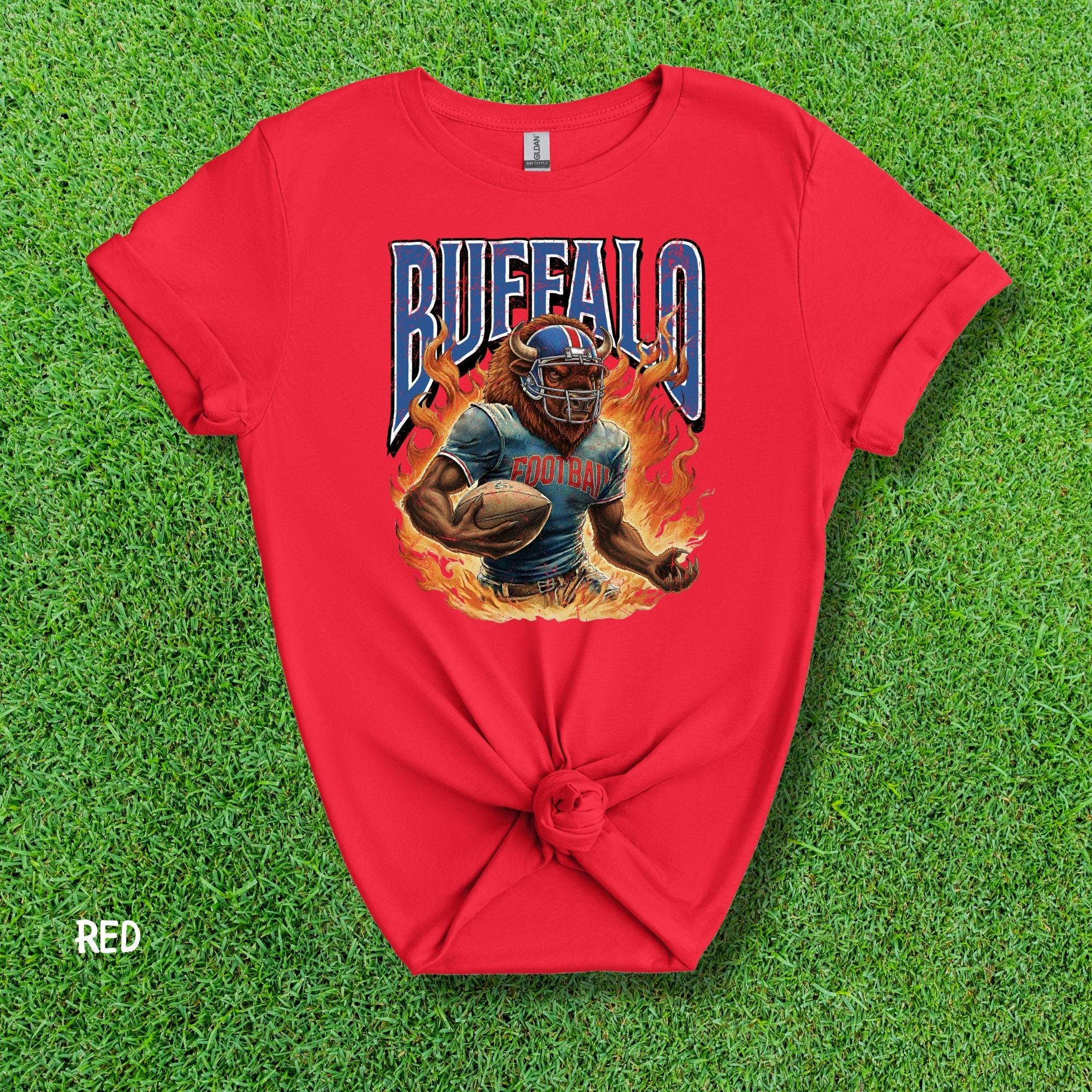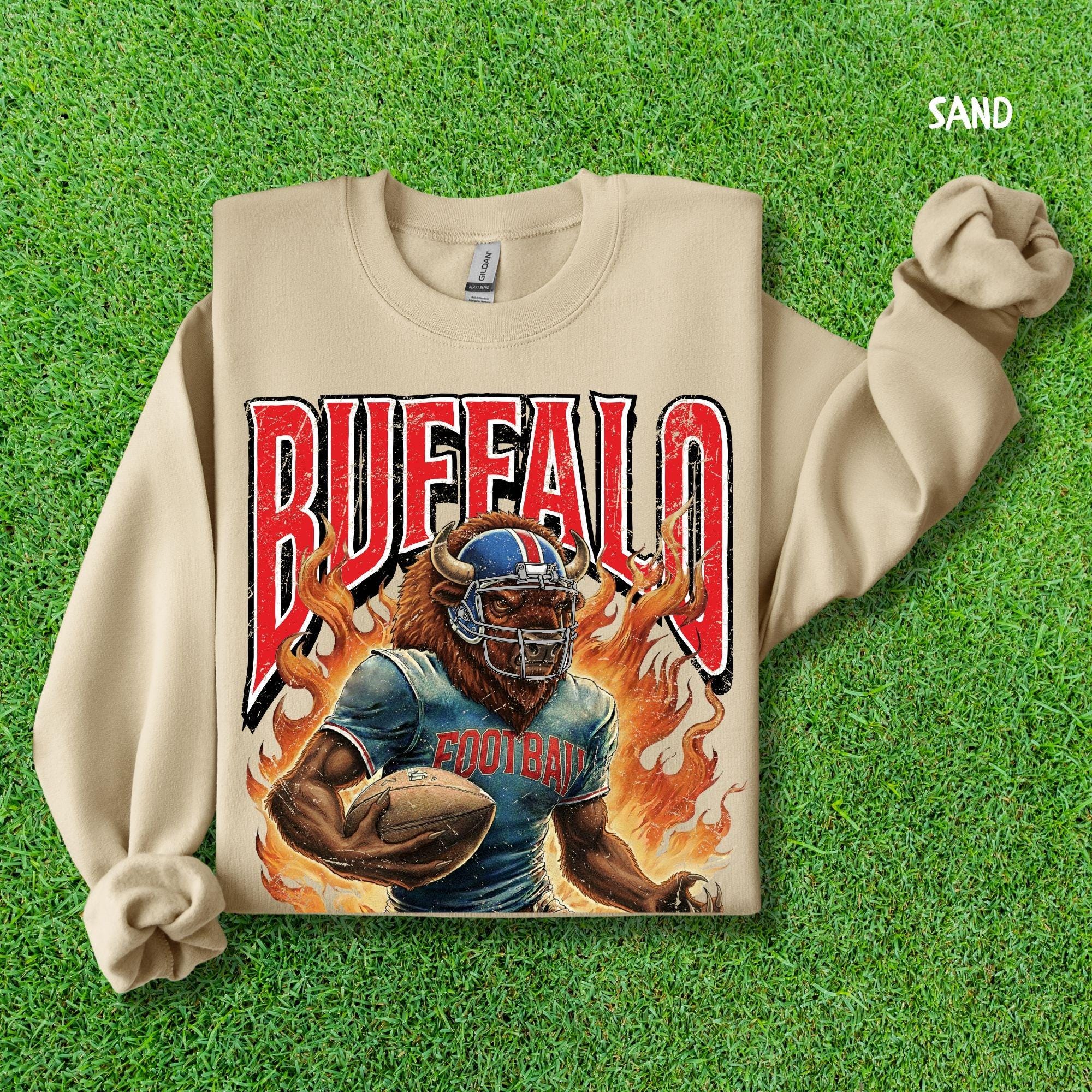 Show your Buffalo pride with this aggressive, vintage-style football mascot shirt! Featuring a dynamic flaming buffalo design inspired by 90s retro sports aesthetics, this tee is perfect for rocking at the tailgate or celebrating on gameday.