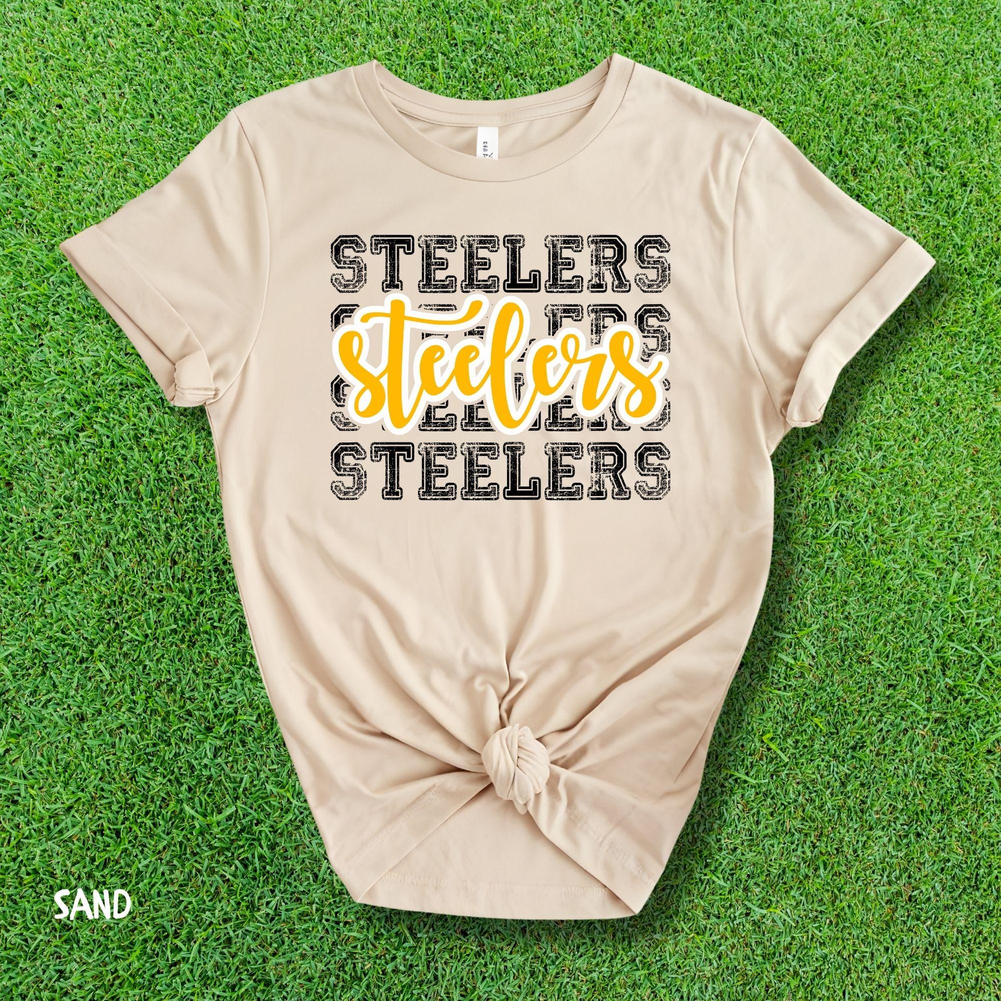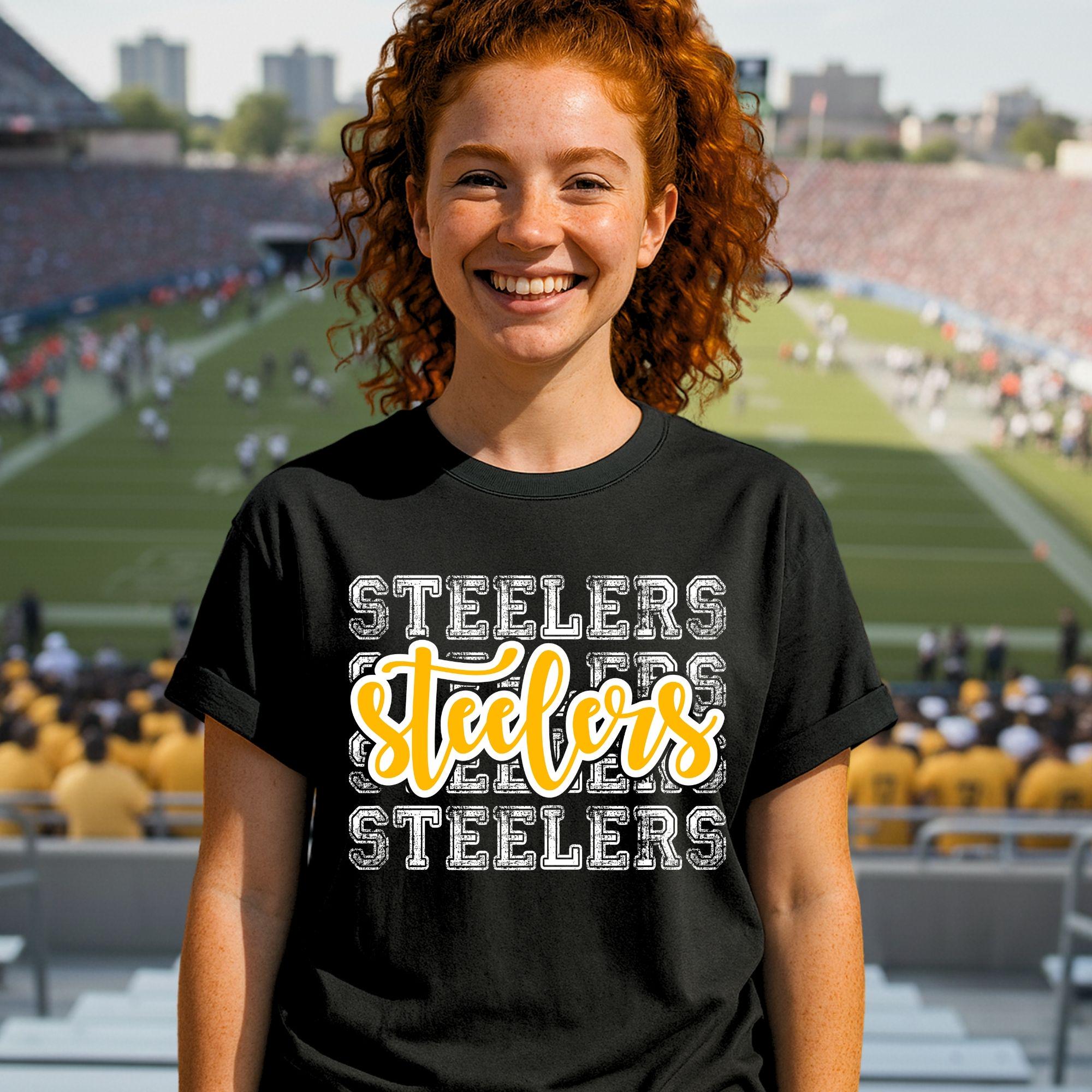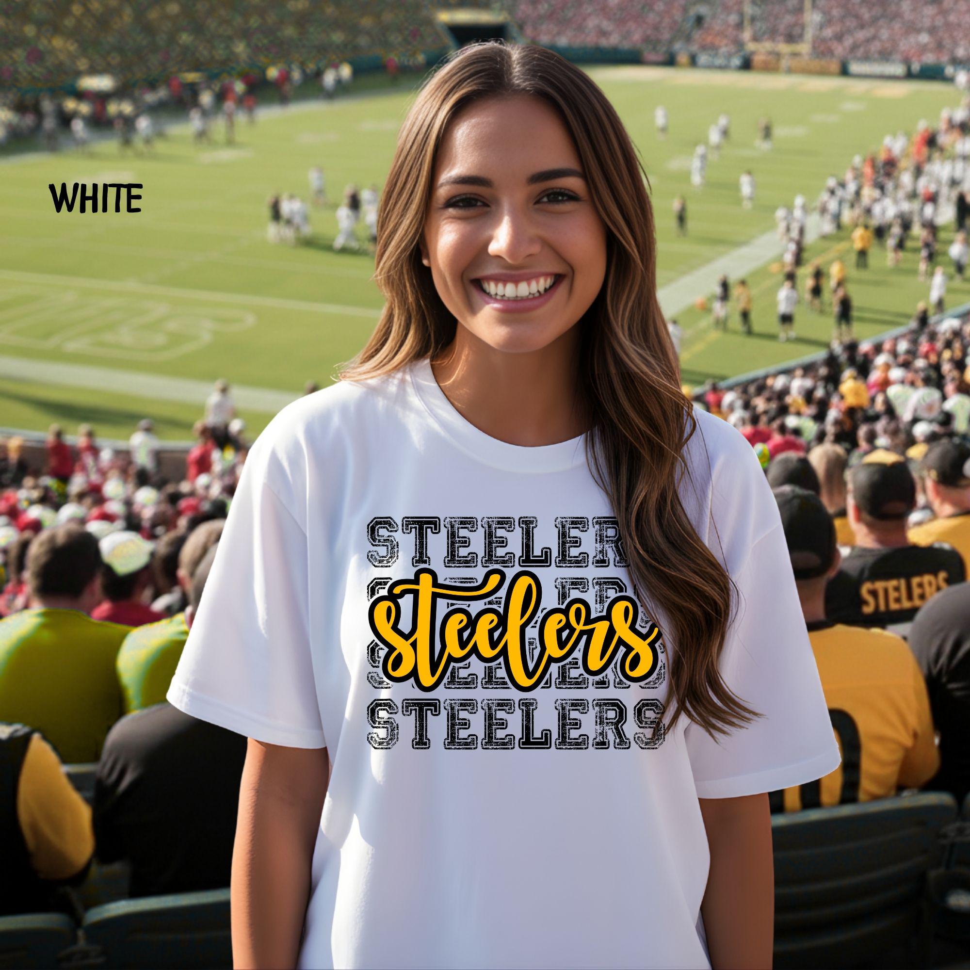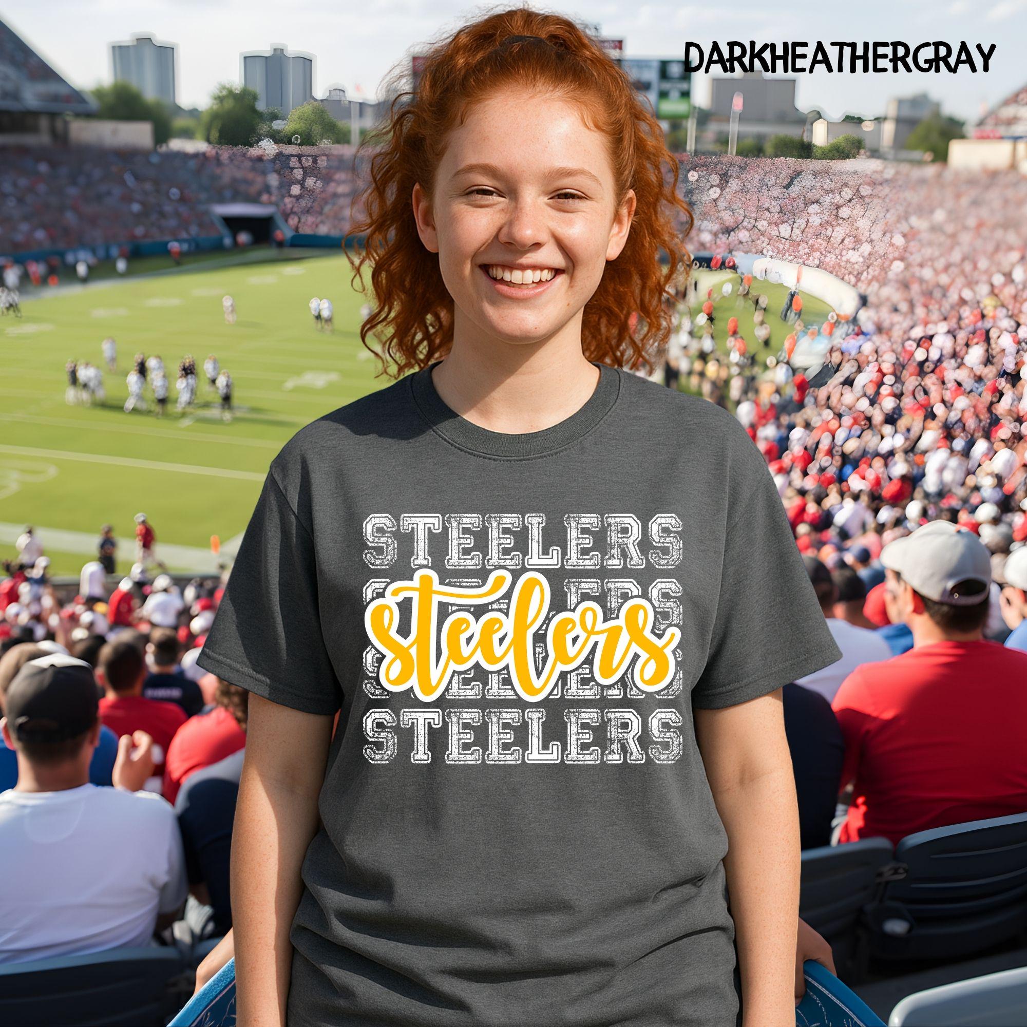 Show your Pittsburgh pride with this bold, layered typography shirt! Designed for the ultimate football fan, this piece stands out with its dynamic script layered over a classic, college-style block font.