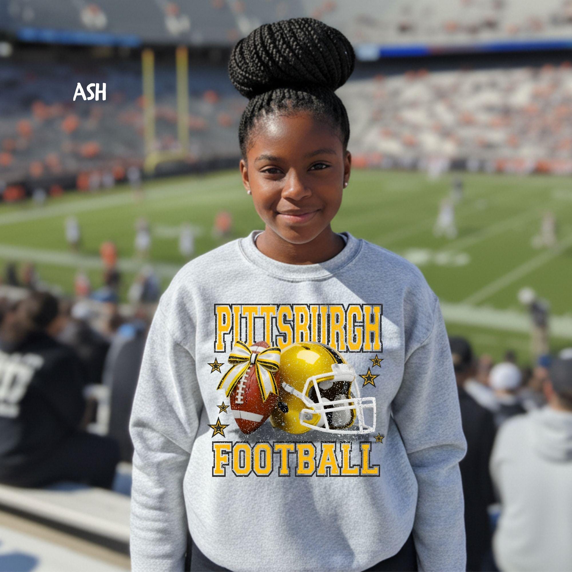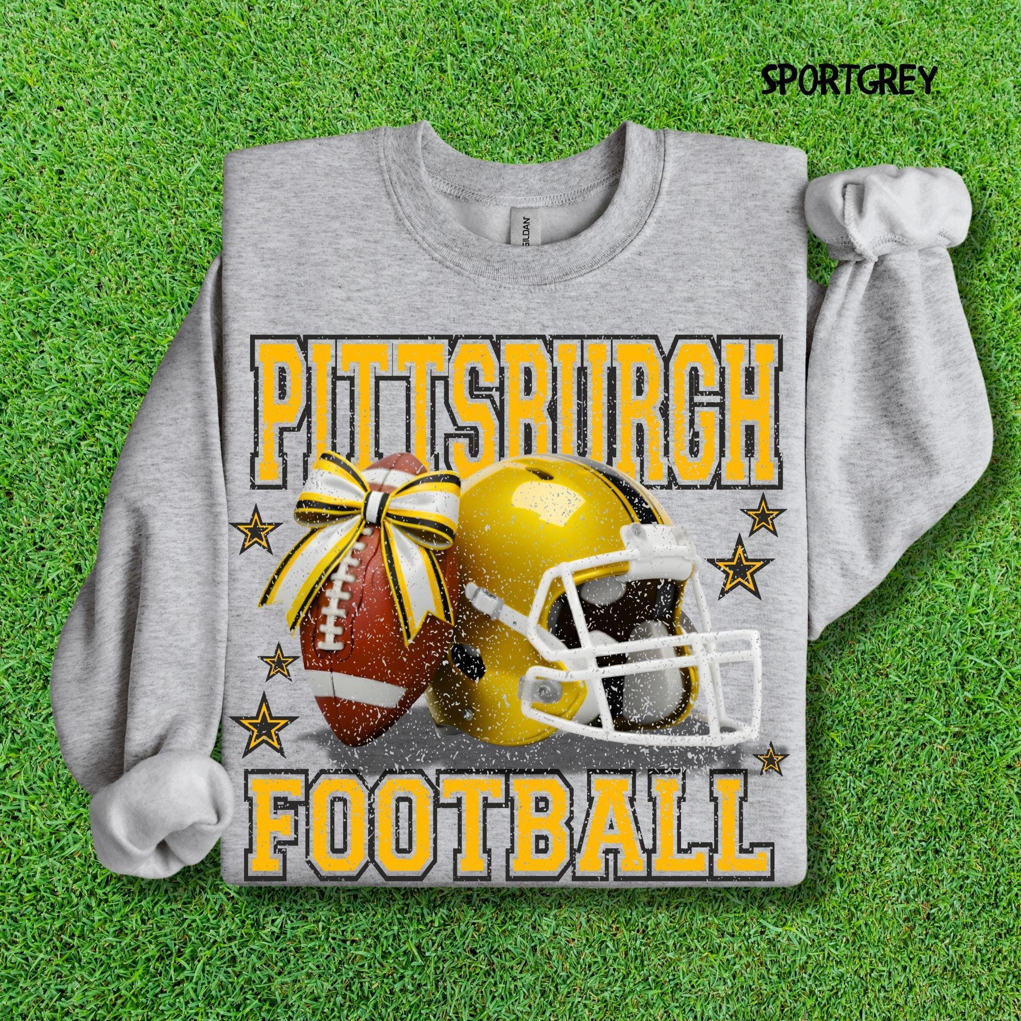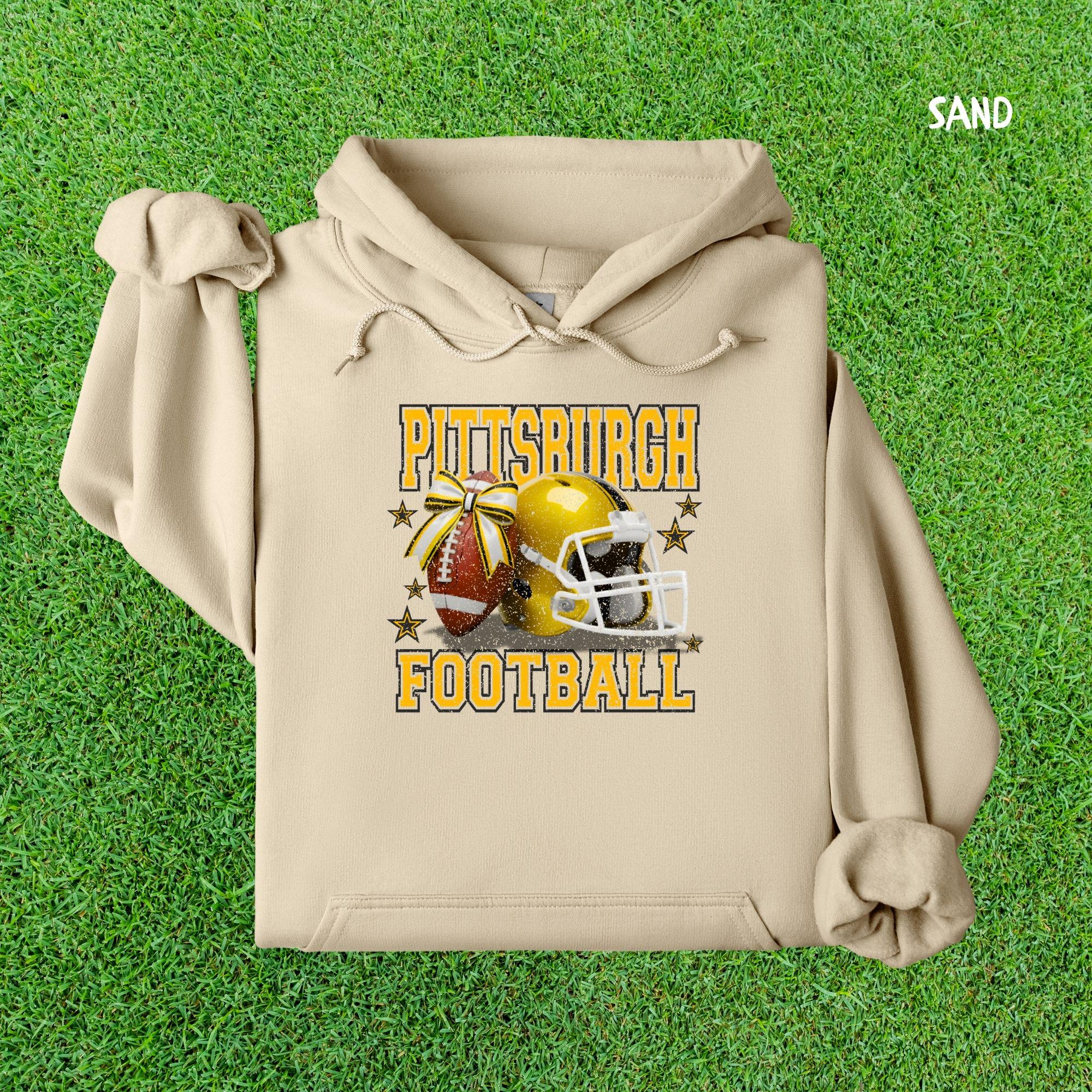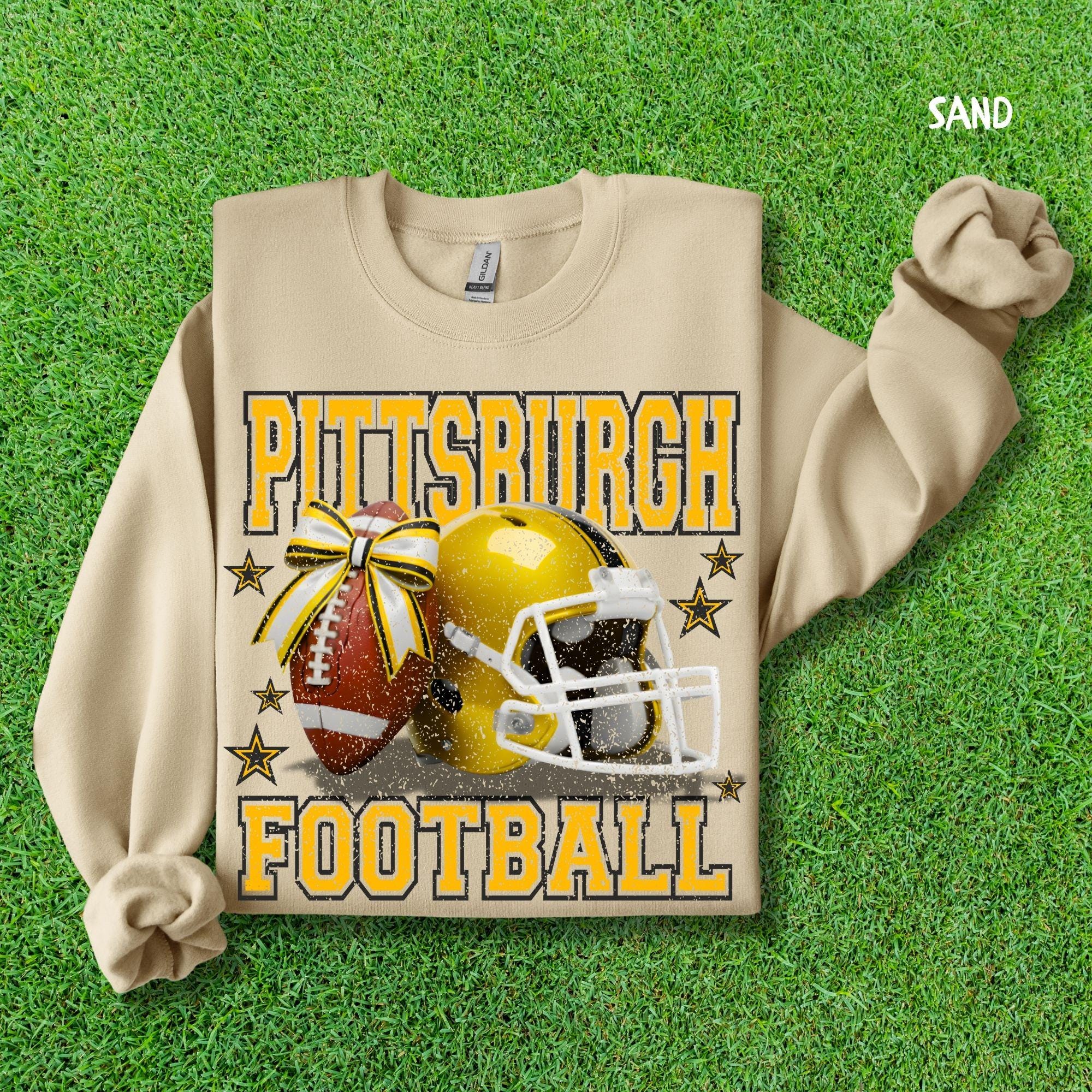 Show your Pittsburgh pride with this classic, vintage-style football design! Featuring a distressed (eskitme) varsity font and iconic black and gold colors, this piece is perfect for game day tailgates or cozy Sundays. We especially love the cute bow detail on the football, making it a perfect gift for the stylish fan in your life.