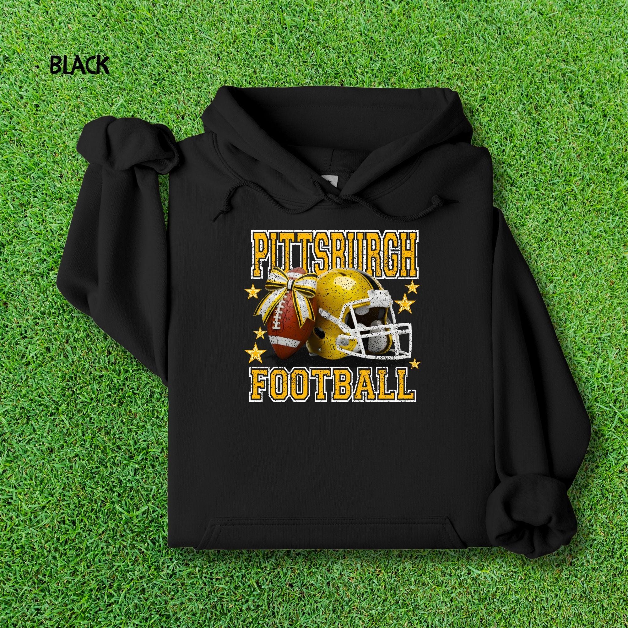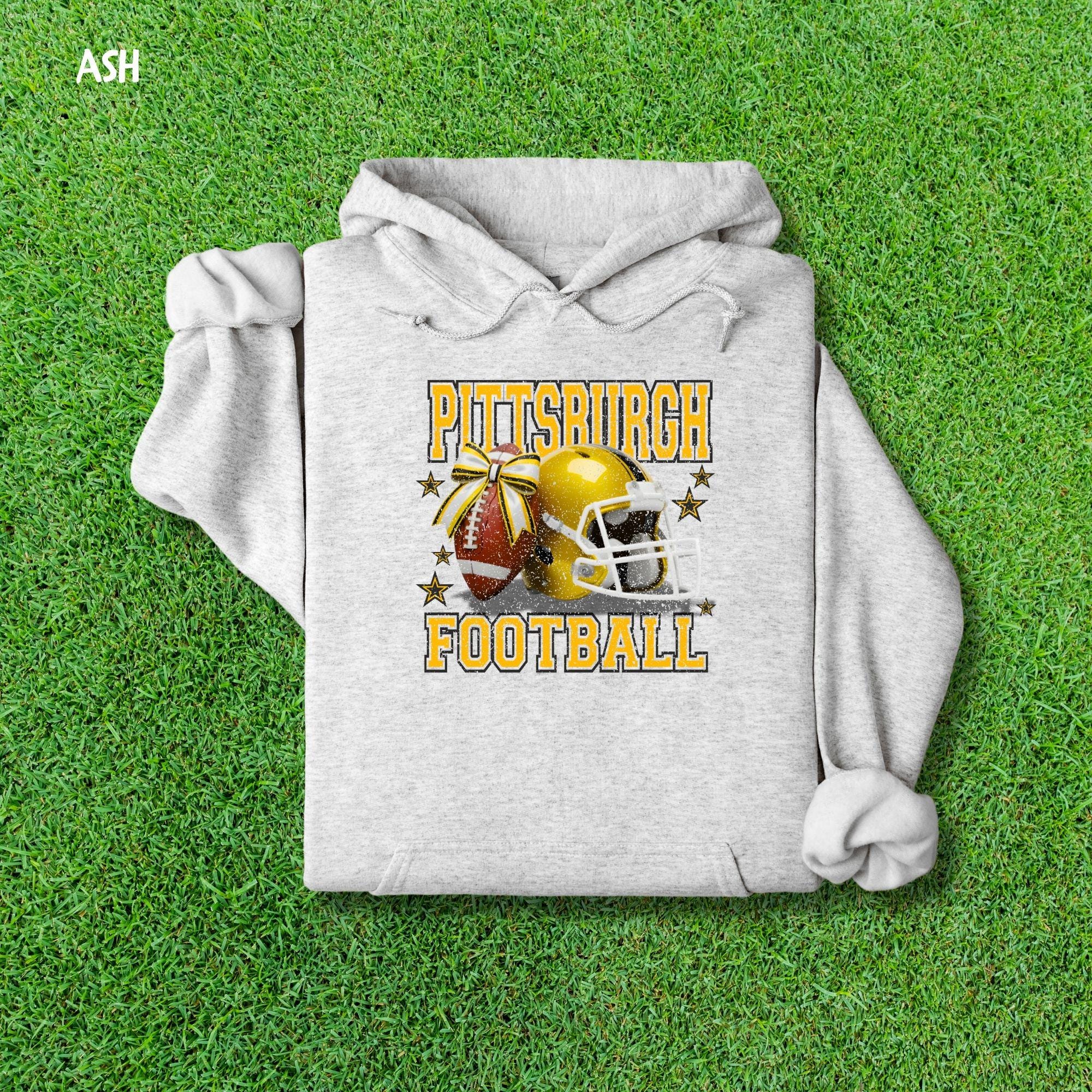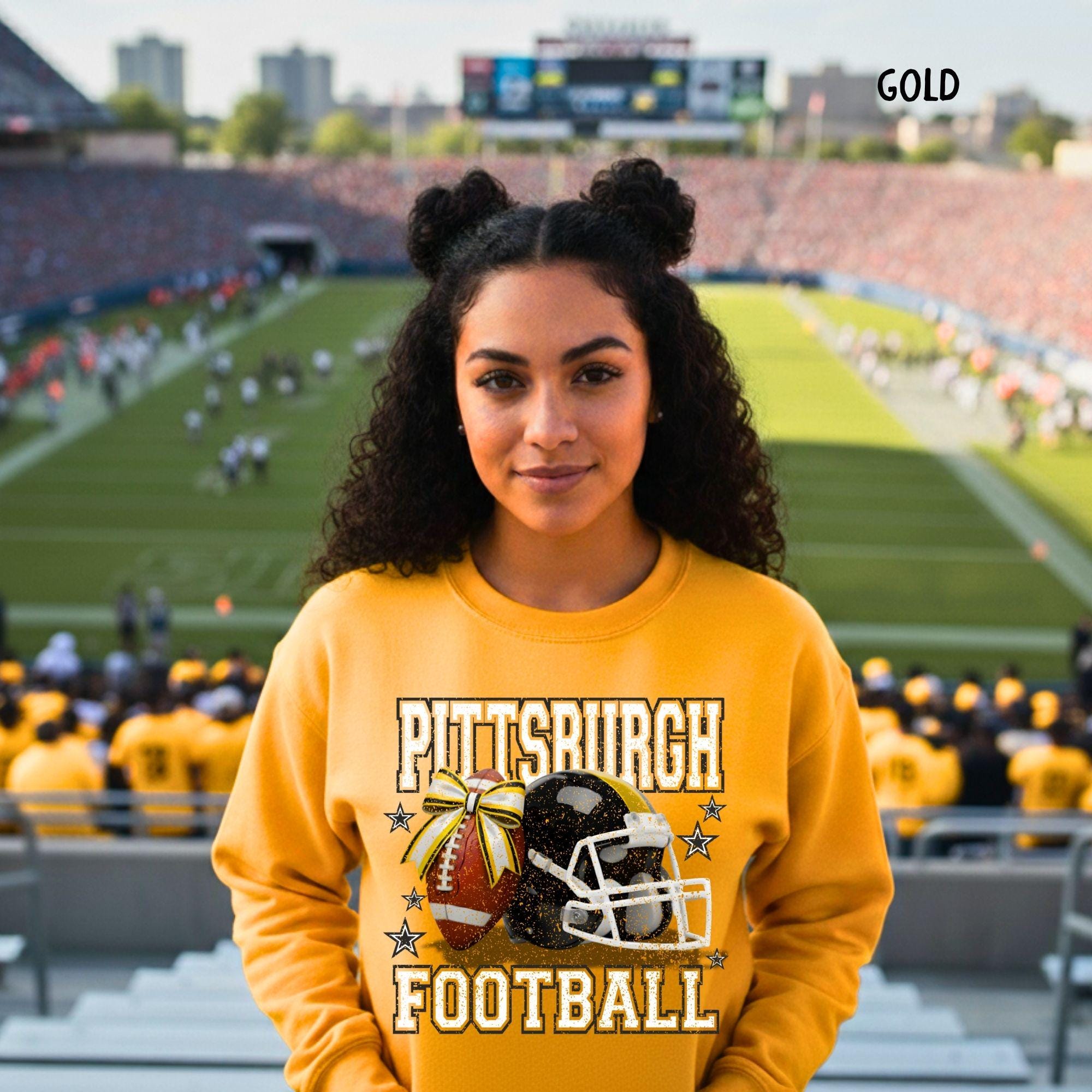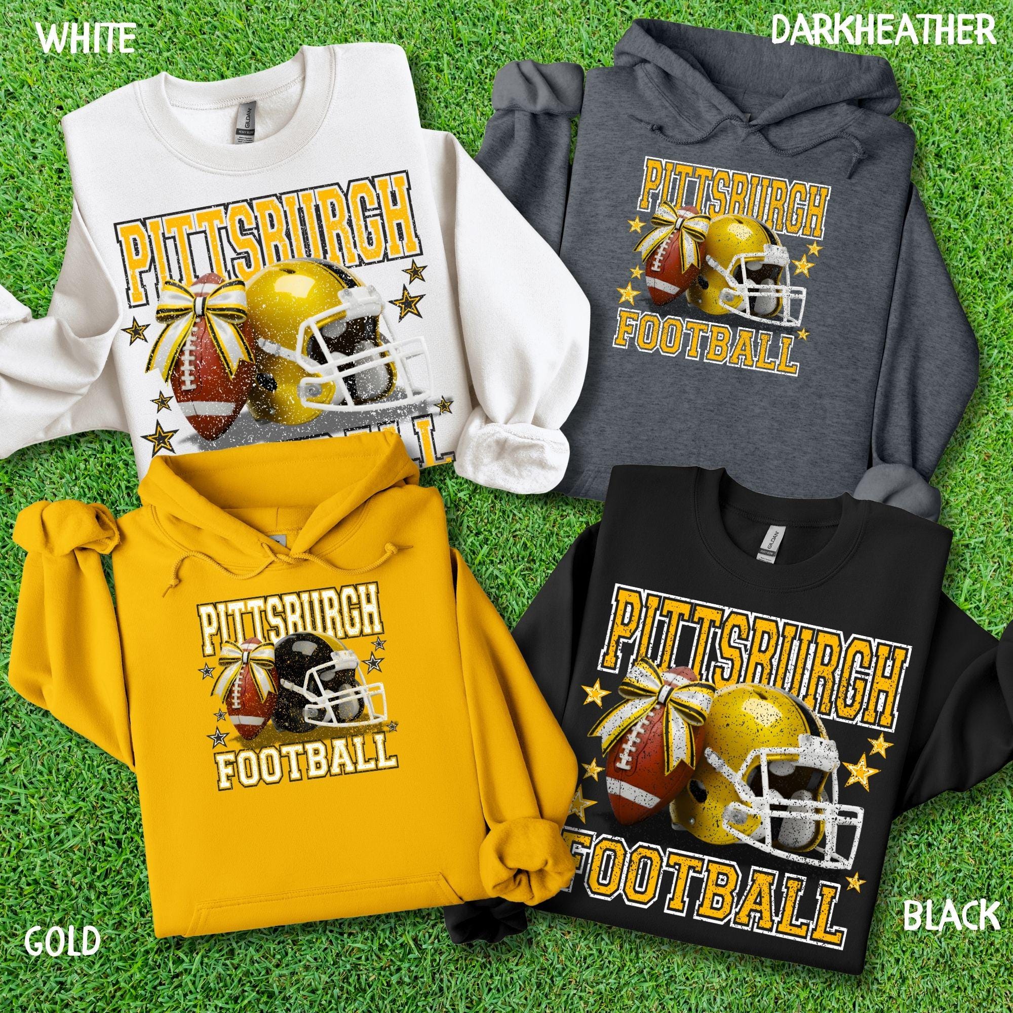 Show your Pittsburgh pride with this classic, vintage-style football design! Featuring a distressed (eskitme) varsity font and iconic black and gold colors, this piece is perfect for game day tailgates or cozy Sundays. We especially love the cute bow detail on the football, making it a perfect gift for the stylish fan in your life.