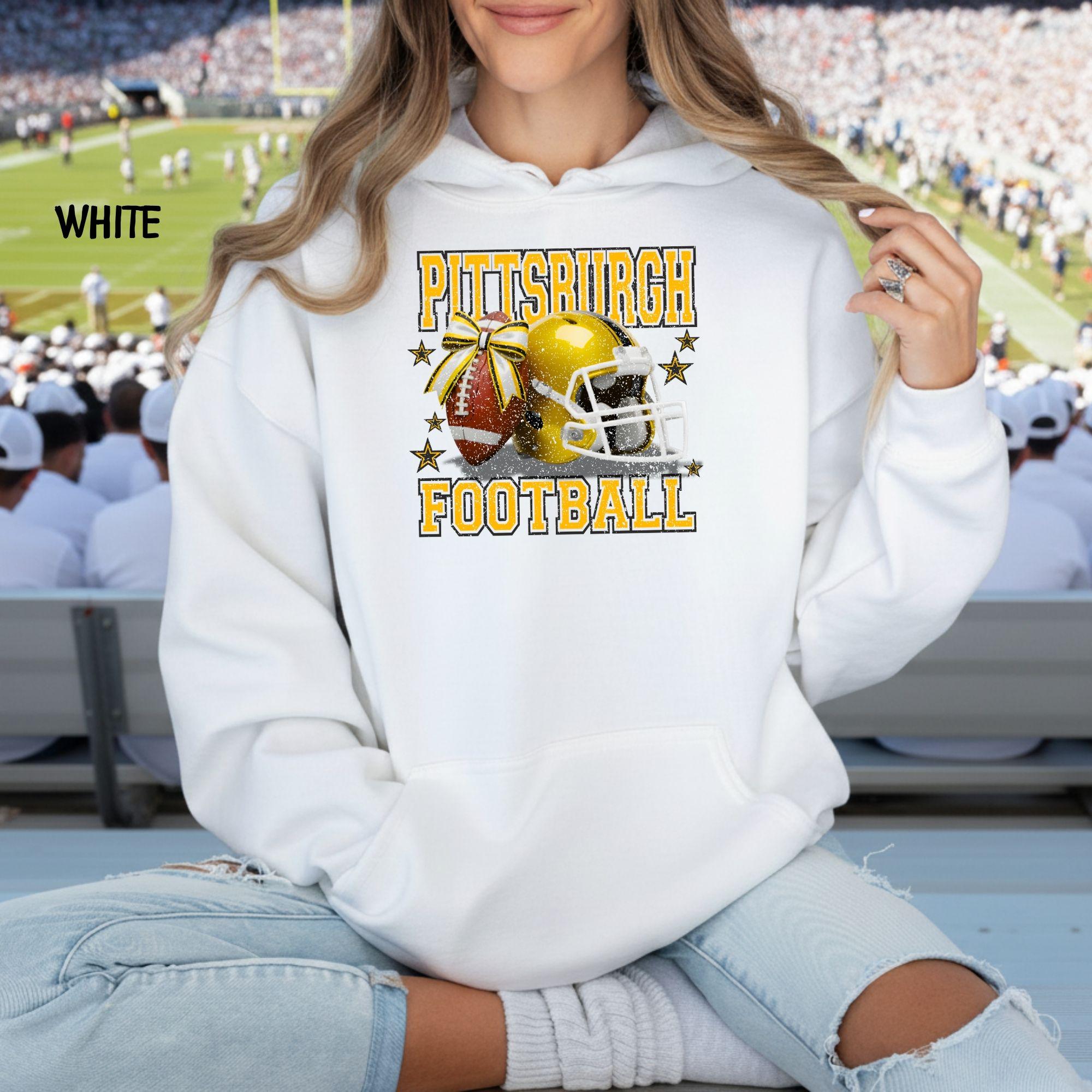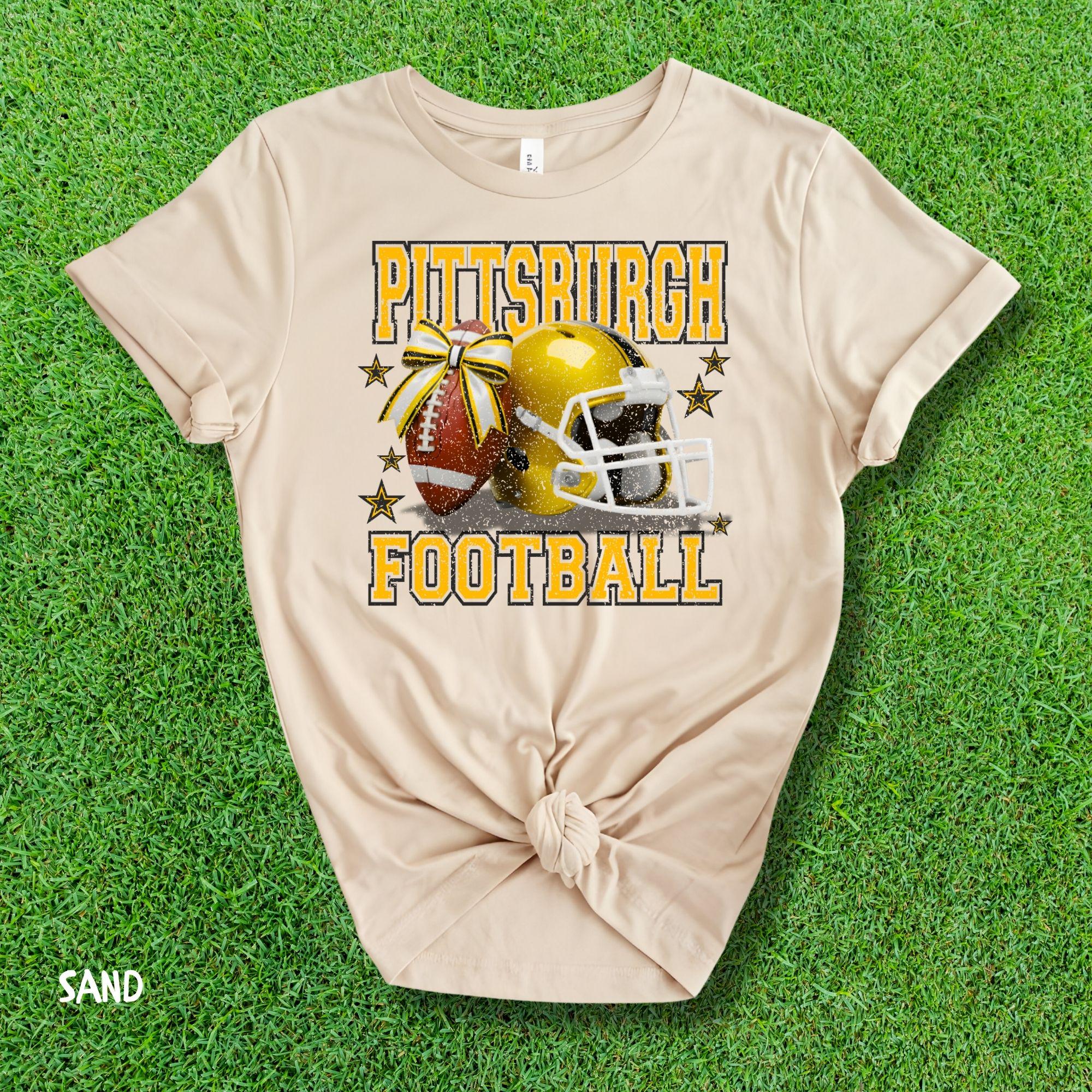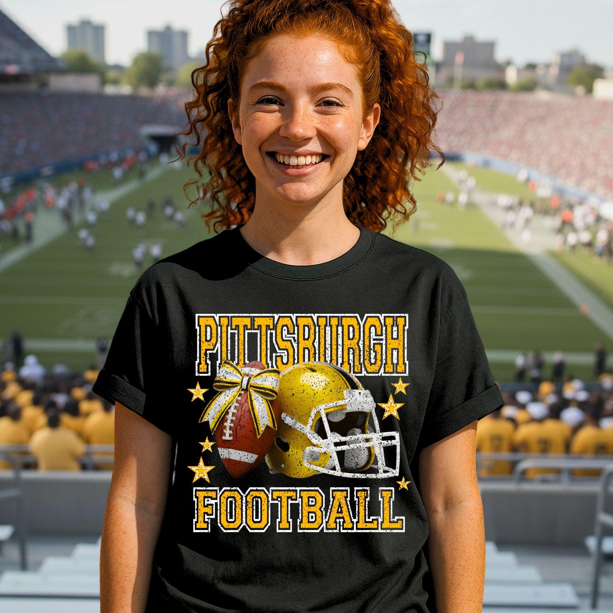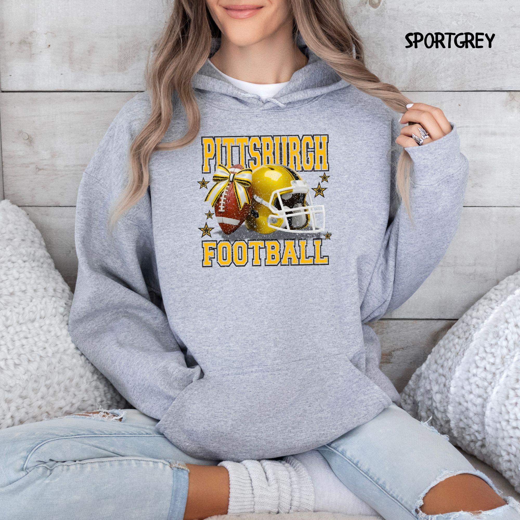 Show your Pittsburgh pride with this classic, vintage-style football design! Featuring a distressed (eskitme) varsity font and iconic black and gold colors, this piece is perfect for game day tailgates or cozy Sundays. We especially love the cute bow detail on the football, making it a perfect gift for the stylish fan in your life.