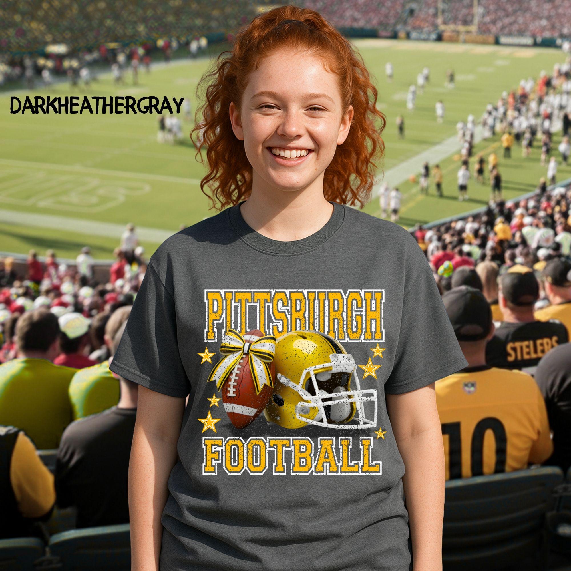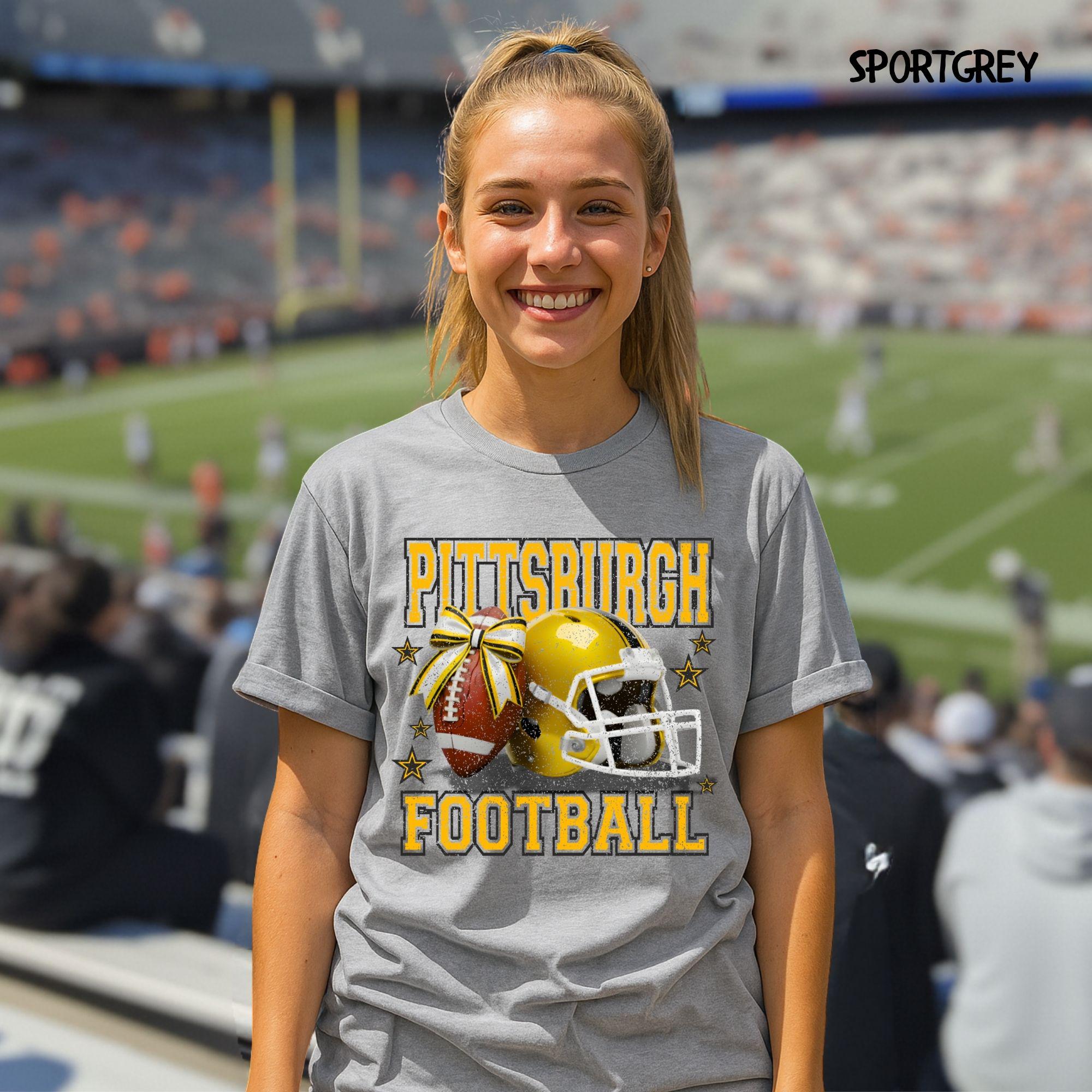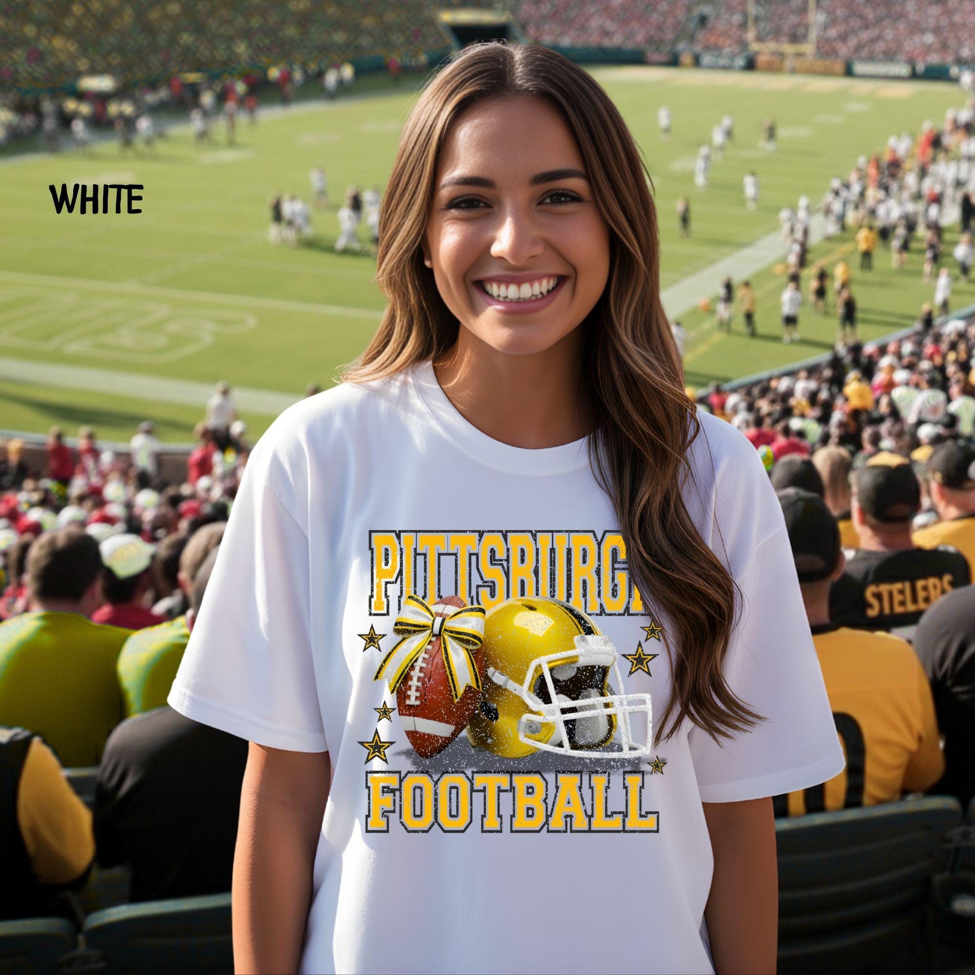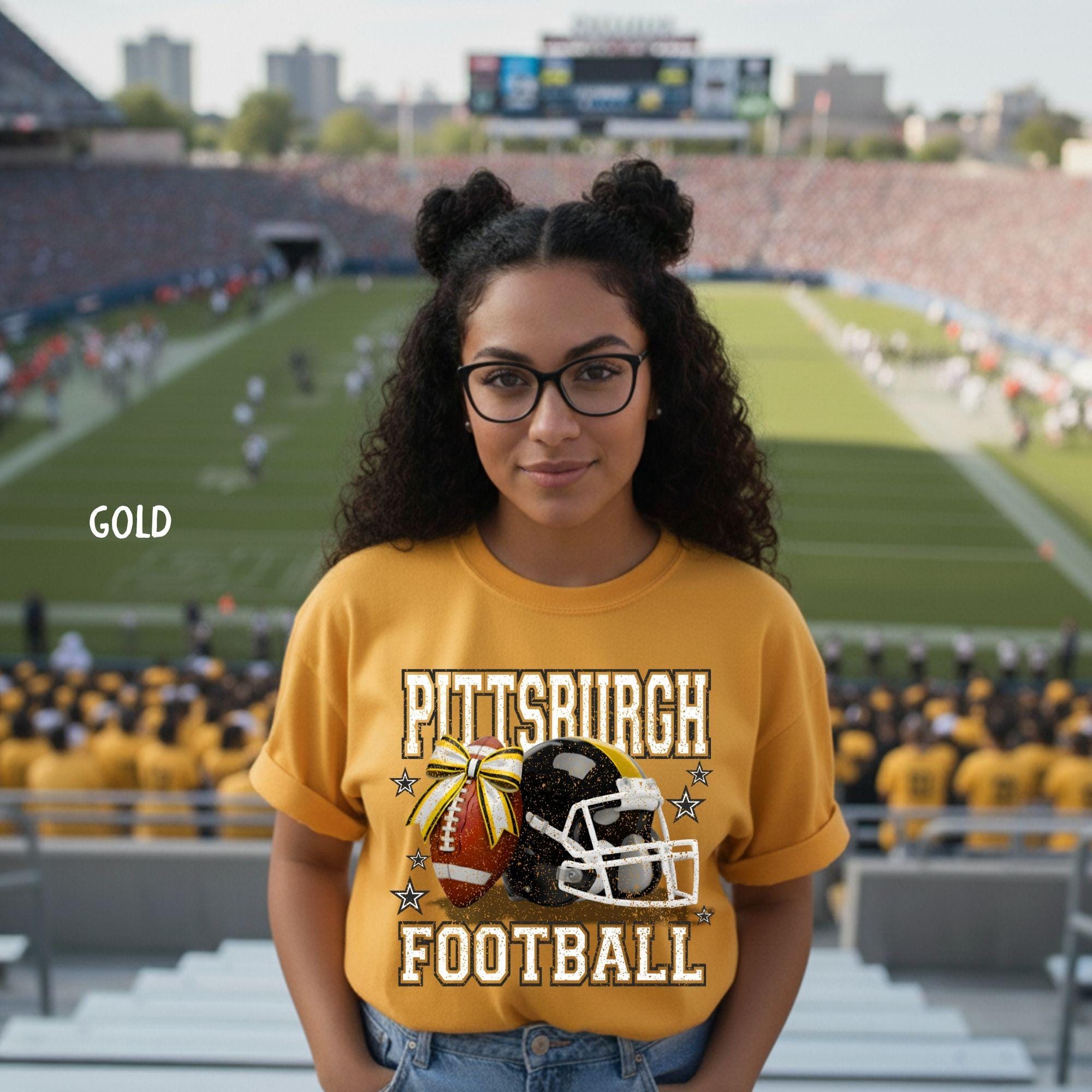 Show your Pittsburgh pride with this classic, vintage-style football design! Featuring a distressed (eskitme) varsity font and iconic black and gold colors, this piece is perfect for game day tailgates or cozy Sundays. We especially love the cute bow detail on the football, making it a perfect gift for the stylish fan in your life.